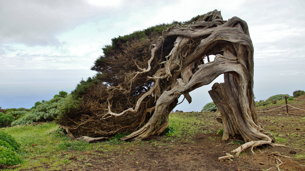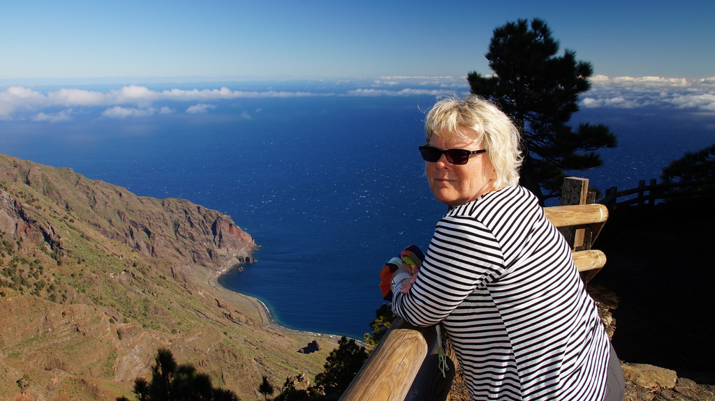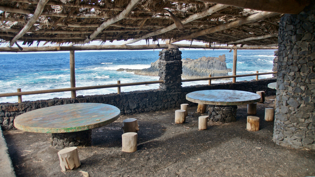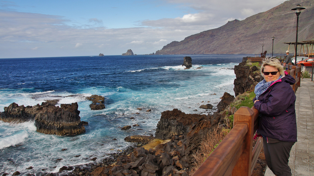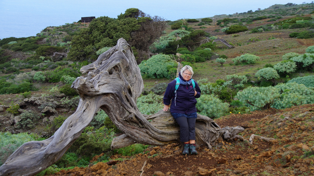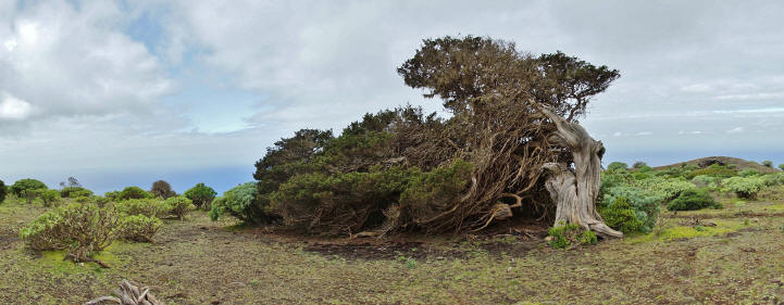 | Heute Morgen ist es recht frisch. Das Thermometer unserer Außenterrasse zeigt nur 13°C an, die bisher kälteste Morgentemperatur auf den Kanaren. Trotzdem frühstücken wir draußen und starten anschließend via Sabinosa und Pozo de la Salud in den absoluten Inselwesten. Anders als am Freitag fahren wir heute ohne weitere Abstecher direkt zur La Dehesa über die enge Serpentinenstraße hinauf auf das Hochplateau. Hinter dem Santuario Virgen de los Reyes fahren wir noch ein Stück die inzwischen zur Piste gewandelte Straße weiter und parken den Mietwagen an einer Kreuzung, wo es zu dem Wacholderhain El Sabinar abzweigt. Mit sturmfester Ausrüstung gehen wir zu den Wahrzeichen der Insel - den windgeformten Sabinas. Überall auf dem Hochplateau stehen skurril geformte Bäume, welche dem Wind zwar getrotzt haben dabei aber mächtig "zerzaust" worden sind. Das berühmteste Exemplar, welches so fast jeden Wander- und Reiseführer von der Insel ziert und auch auf dem Etikett unseres momentanen Lieblingsweines Viña Frontera zu finden ist, steht gleich am Beginn eines kleinen Pfades. Nach einer Runde zu den "Windflüchtern" geht es dann weiter zum südlichsten Aussichtspunkt Europas, dem Mirador de Bascos. Auch hier weht ein strammer Wind doch der grandiose Tiefblick vom rustikalen Aussichtsbalkon hinunter ins Golfotal entschädigt für alles. Nach vielen Fotos machen wir uns wieder auf dem Rückweg, wobei uns am Rande der Zuwegung ein kleines Schildchen auffällt, dass wegen akuter Abbruchgefahr der Aussichtspunkt gesperrt sei. Ok, alles gut gegangen und so erreichen wir einige Zeit später wieder das Mietauto. Die weitere Fahrt führt uns dann analog der Route vom Freitag durch die Kiefernwälder am Fuße des Malpaso (1.501m, höchster Berg der Insel). Immer wieder geht der Blick über die gigantische Wand von El Julán nach unten, wo das Mar de Calmas liegt. Via El Pinar fahren wir in den Süden zur kleinen Badebucht Cala de Tacorón, wo wir den Nachmittag bei überwiegend Sonne und Temperaturen um 20°C verbringen. Dann fahren wir wieder über die Bergstraße zurück ins Golfotal. Bei der Fahrt über die Cumbre zeigt das Autothermometer hier in ca. 1.350 m Höhe gerade mal noch 7°C an. Bevor wir ins Quartier zurückfahren, inspizieren wir noch einige Badeplätze an der Golfoküste im Norden. Zuerst zum wahrscheinlich schönsten und besten Badeplatz, der Cala Maceta. Hier wurden verschiedene künstliche Badebecken, auch für Kinder, zwischen die Lavasteine angelegt, so dass man gefahrlos baden kann. Es ist schon ein tolles Schauspiel, wenn draußen die Atlantikwellen hereindonnern und in den Becken zuvor das Wasser glatt plätschert. Nur ab und zu spritzt mal eine der Wellen uns Badebecken. Anschließend besuchen wir noch die gleich nebenan gelegene Cala Los Sargos und die Charco Azul. Letztere sind im Gegensatz zu Cala Maceta eher naturbelassen und machen einen rustikalen Eindruck. Zurück in der Casa de mi Abuela Maria werfen wir mal wieder unseren tollen Außengrill an und legen ein leckeres Rumpsteak auf. |