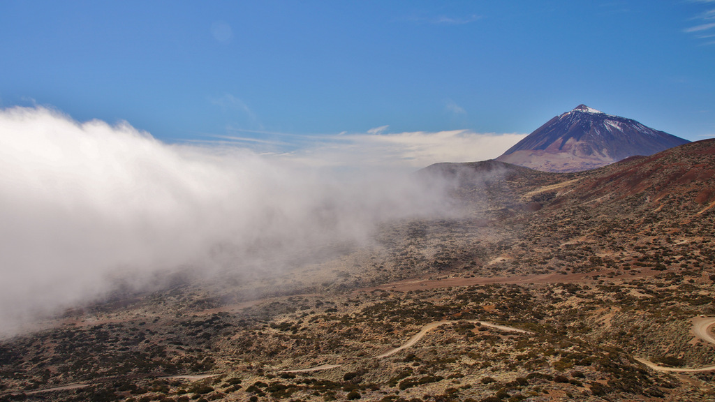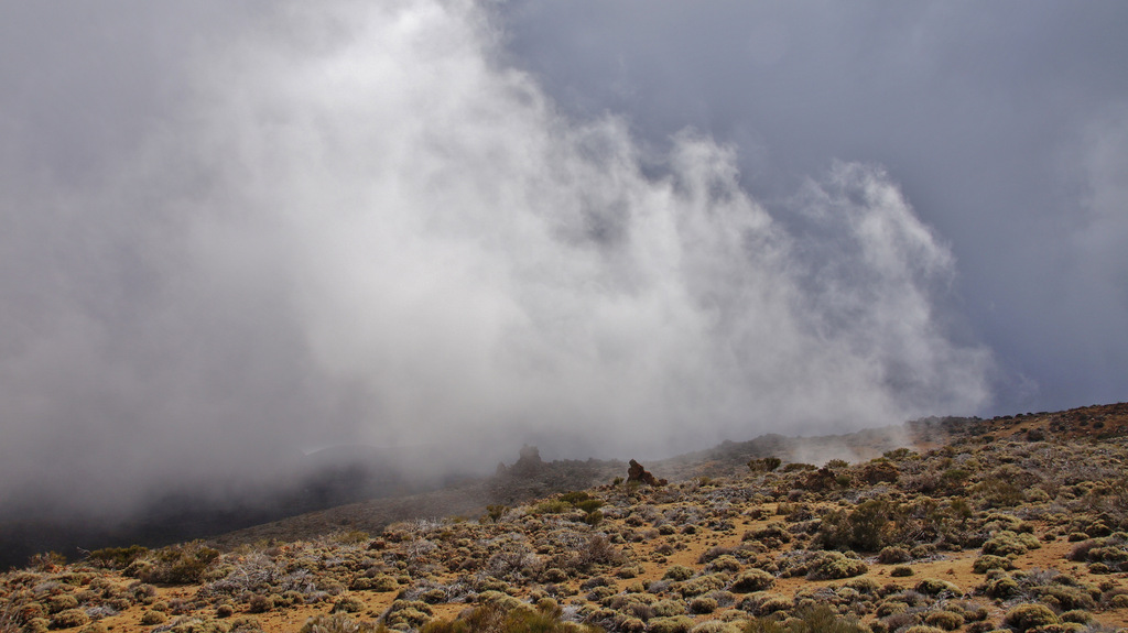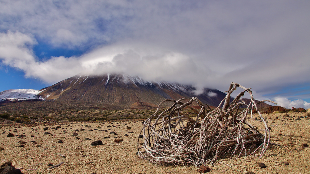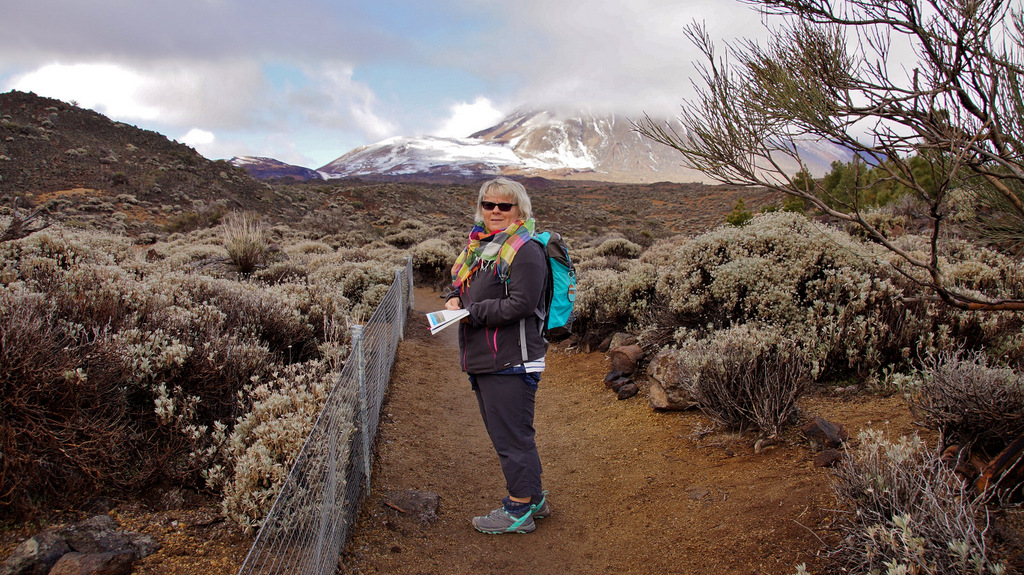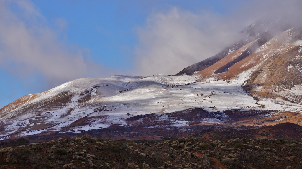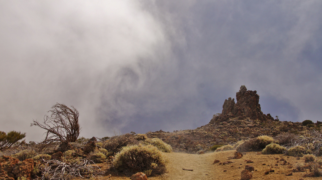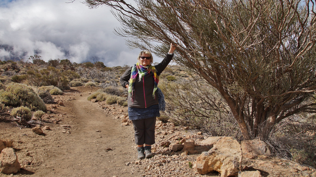 | Heute morgen ist der Himmel wieder blau - geht doch. Auch wenn es dadurch etwas frischer ist aber mit Sonne und freier Sicht auf El Teide geht der Tag doch ganz anders los. So starten wir nach dem Frühstück über die bekannte Strecke über Aguamansa hinauf in den Nationalpark. El Teide hat sich zwar inzwischen ein Wolkenhäubchen aufgesetzt aber als wir in El Portillo ankommen ist gutes Wanderwetter. Aufgrund der frühen Stunde gibt es noch genügend Parkplätze am Besucherzentrum und hier starten wir unsere Wanderung durch die Cañadas bei frischen 2°C. Am Teide sehen wir noch weite Schneeflächen vom gestrigen Wintereinbruch. Auf unserer Strecke ist vom Schnee nichts mehr zu sehen, nur noch ein paar Eisstellen am Boden, was eher vom Nachfrost kommt. Ohne größere Steigungen geht der Weg ziemlich eben durch die Cañadas in ca. 2.100 Metern Höhe. Vorbei an einem markanten Felsen, dem Roque del Peral, erreichen wir nach ca. 1 Stunde eine sandige Hochebene, die Cañada de los Guancheros. Der ursprünglich geplante Weg aus unserem ziemlich betagten Wanderführer aus dem Jahre 2002 können wir dann leider nicht mehr gehen, da dieser aus Naturschutzgründen gesperrt ist. So nehmen wir den Weg am Fuße der Fortaleza. Eigentlich hätten wir während der ganzen Strecke da ultimative Teidepanorama aber El Teide zieht es vor, sich mehr und mehr in Wolken zu hüllen. Bevor wir die Cañada de los Guancheros wieder verlassen, biegen wir in den markierten Sendero Nr. 29 hinauf zur Degollada del Cedro ab. Hier oben steht zwischen zwei uralten kanarischen Kiefern die kleine Kapelle Cruz de Fregel. Auch wenn rings um uns bereits dichte Wolken treiben, so sind wir mitten in der Sonne und nutzen die kurze Rast für ein Sonnenbad bei angenehmen Temperaturen und bei totaler Windstille. Dann geht es auf gleichem Weg wieder zum Besucherzentrum bei El Portillo zurück. Je weiter wir dorthin kommen, desto gigantischer werden die Wolken- und Lichtspiele um uns herum. Während wir noch Sonne haben ziehen um uns herum dunkle Wolken auf uns es wird auch wieder deutlich kühler. Am Auto zurück fahren wir dann noch bis kurz vor die Talstation der Teleferico in der Hoffnung, doch noch die weiße Haube des Teide aus nächster Nähe zu sehen. Doch El Teide legt wahrscheinlich gerade nach in Sachen Schneehaube. So geht es hinunter zur Nordküste, anfangs wieder durch die Wolken aber unterhalb von Aguamansa durchbrechen wir die Wolken und als wir in La Matanza ankommen, lacht die Sonne bei angenehmen Temperaturen. Das nutzen wir für ein kurzes Bad im Pool. Anschließend werfen wir den Grill an und lassen es uns bei Abendsonne auf unserer Terrasse schmecken. |