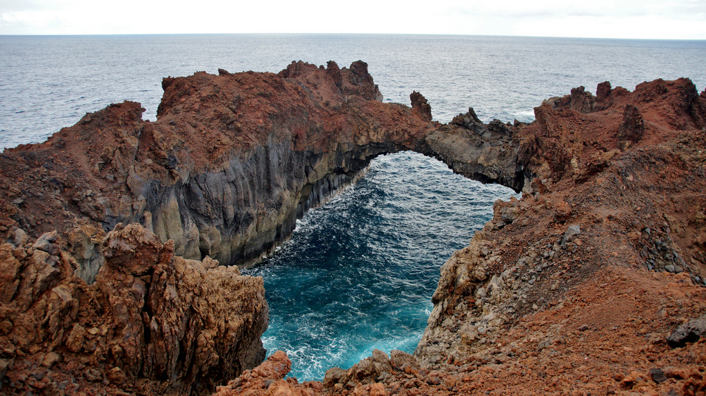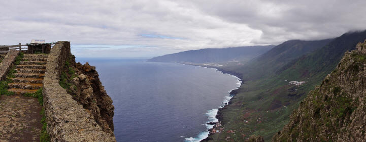 | Heute Morgen sind deutlich mehr Wolken an der Cumbre. Zu Beginn des Tages fahren wir nur wenige Kilometer nach Frontera und schauen uns den Wochenmarkt an. Ganz nett aber ca. die Hälfte aller Stände wird von Deutschen betrieben. Durch die Tunnelstraße via Las Puntas fahren wir hinauf nach Erese und weiter nach Guarazoca, wo sich der Mirador de la Peña, ein Werk von César Manrique, befindet. Wir haben Glück und die Wolken hängen zwar über uns, doch der gigantische Blick hinunter ins Golfotal liegt offen vor uns. Nach vielen Fotos fahren wir dann zurück auf die Hauptstraße. Nachdem wir in Mocanal die Ortskirche besichtigt haben, fahren wir eine kleine Nebenstraße hinunter in Richtung Pozo de las Calcosas. Oberhalb der Bucht parken wir und schauen hinunter zu den Häusern und den Meeresschwimmbecken. Diese laden heute weniger zum Schwimmen ein. Umso mehr brausen die Atlantikwellen über die Lavafelsen herein. Über den kleinen Ort Echedo fahren wir dann weiter an der Küste zum Charco Manso. Auch hier liegt zwischen Vulkanklippen eine kleine Bucht, wo man bei ruhigen Wetter Baden kann. Optisch imposant ist ein Lavabogen, welchen das Meer ausgespült hat. Dann führt uns die Fahrt wieder hinauf auf die Hauptstraße. Am Horizont sehen wir La Gomera. Ebenso erkennen wir, dass der Süden und Südwesten Gomeras im Sonnenschein liegt, während hier eher dichte Wolken ziehen. Via Valverde fahren wir dann weiter nach Tamaduste. In unmittelbarer Nähe des Flughafens gruppieren sich hier ein paar Häuser um eine tief eingeschnittene Lavabucht. Nach einer Runde durch Tamaduste geht es weiter entlang der Ostküste. Am Fährhafen La Estaca vorbei fahren wir durch zwei Tunnel an die Ostküste El Hierros. Dieser Abschnitt nennt sich Las Playas, da es hier einige Stellen gibt, wo man baden kann. Heute ist das allerdings eher schwierig. Am Fuße riesiger Felswände, welche mehr als 1.000 Meter hoch sind, fahren wir bis zum Ende des Tales, wo sich das Parador-Hotel befindet. Leider ist es hier heute auch etwas windig, so dass wir nach ein paar Fotos auf der gleichen Strecke wieder zurück fahren. Bevor wir durch den Tunnel fahren fällt unser Blick auf eines der Wahrzeichen El Hierros, den Roque Bonanza, ein Felsentor aus Lava mitten im Meer. Auf dem Rückweg machen wir noch einen kurzen Stopp in La Caleta, wo wir bei angenehmen 22°C die warme Sonne genießen. Dann geht die Fahrt via Valverde hinauf auf die Mesata de Nisdafe. Für die Weiterfahrt nehmen wir die Straße nach Frontera. Bevor wir ins Golfotal hinunter fahren, machen wir an der an der Raya de la Llania einen Stopp und unternehmen eine Kurzwanderung durch den Lorbeerwald. Leider macht sich wie so oft hier der Nebel breit, so dass die Aussicht vom Mirador de la Llania gleich null ist. Dann geht der Weg weiter durch Baumheide- und Lorbeerwald und nach einigen Schwierigkeiten, den richtigen Weg zu finden, finden wir dann doch das Auto wieder und fahren hinunter ins wolkenverhangene Golfotal. |