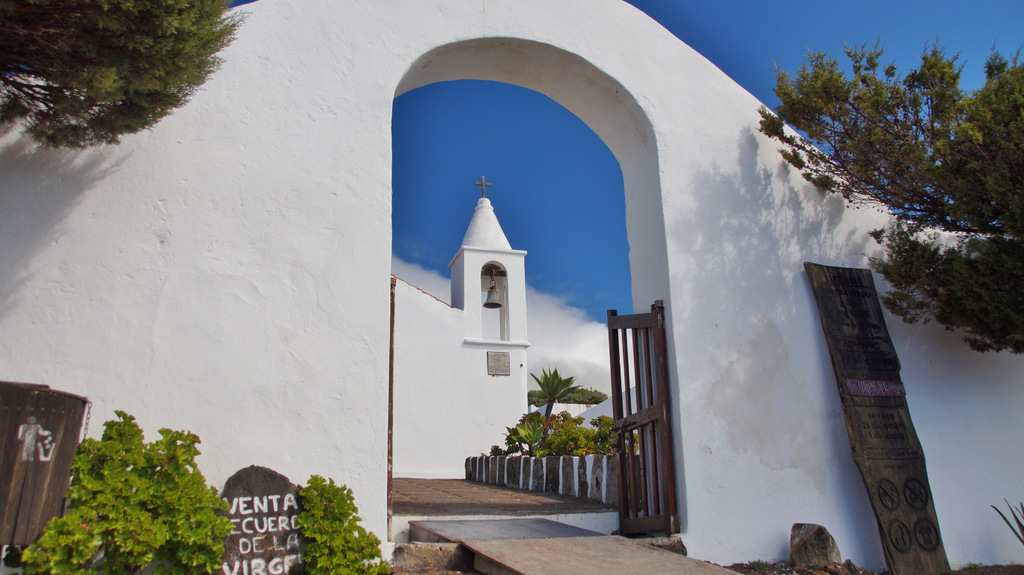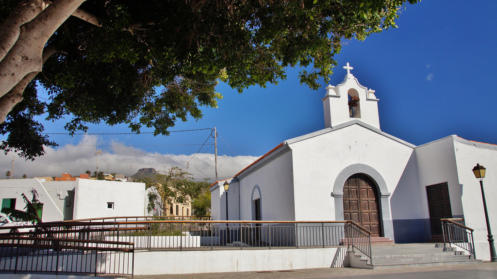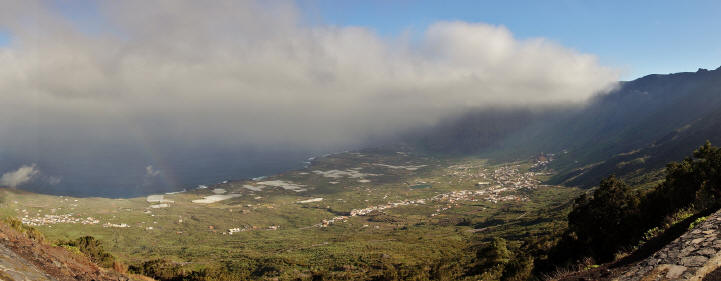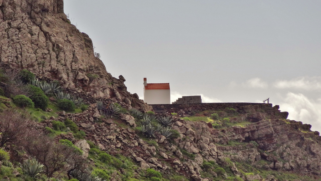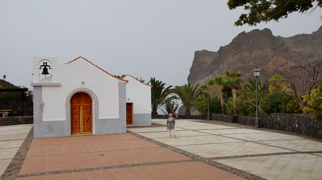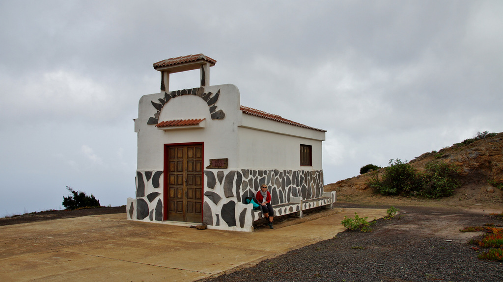 | Auch heute Morgen lacht die Sonne vom Himmel. Nach dem Frühstück bummeln wir zuerst einmal nach Vueltas zum Hafen und dann weiter nach Borbalan, wo wir unsere Lebensmittelvorräte auffrischen. Den restlichen Vormittag nutzen wir dann zum Lesen auf unserer Terrasse. Obwohl im oberen Tal sich ein paar Wolken zeigen, welche nicht weiter bedrohlich aussehen, entschließen wir uns mit dem 13:00 Uhr-Bus hinauf nach Arure zu fahren. Nachdem wir gerade noch im Trockenen waren fängt es bereits ab Los Granados an zu regnen. In Arure angekommen streifen wir uns und unseren Wanderrucksäcken den Regenschutz über, da es inzwischen recht heftig regnet. So erreichen wir die kleine Ermita Virgen de La Salud, wo wir uns unterstellen. Da auch in Richtung Las Hayas, was unser Ziel war, dunkle Regenwolken herüberziehen, entscheiden wir uns zum Abbruch unserer Tour, da diese im Regen und bei frischem Wind keinen rechten Genuss bereitet. Wir haben Glück und können mit anderen Wanderern in deren Mietwagen wieder zurück ins Valle fahren. Unten im Tal scheint die Sonne aber einzelne kurze Regentropfen schaffen es sogar bis hierher an die Küste. |