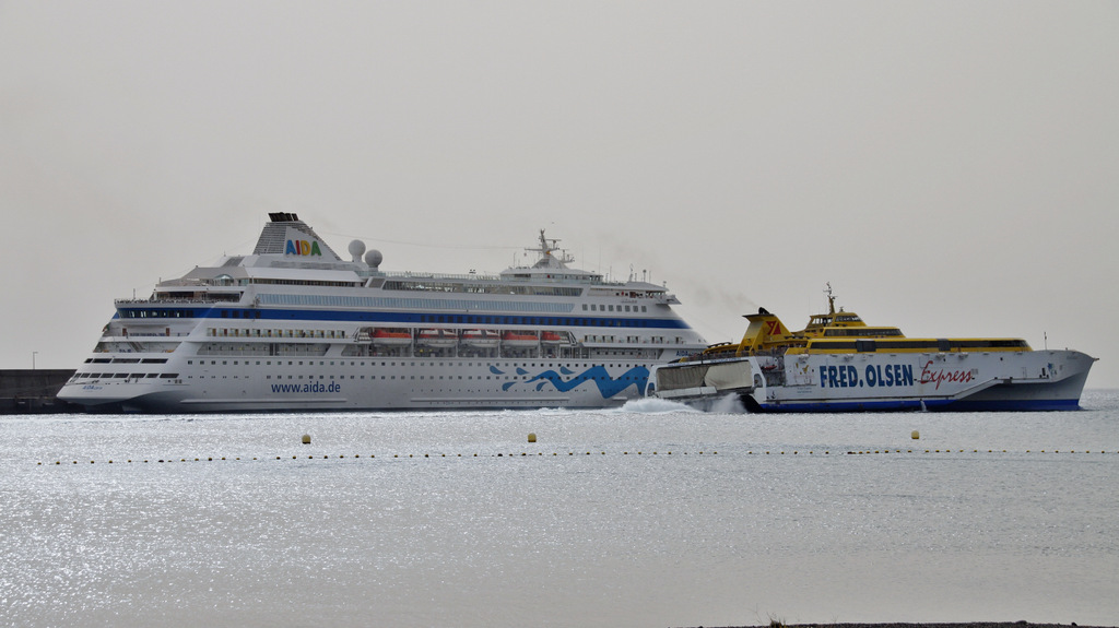 | Calima...und kein Ende in Sicht. Auch wenn uns alle Wetterberichte (wetteronline.de; aemet.es; eltiempo.es) volle Sonne vorhersagen, so scheitern sie in den letzten Tagen allesamt bei der Beschreibung des tatsächlichen Wetters, von Prognosen mal ganz zu schweigen. Auch wenn sich der Saharastaub vielleicht nicht auf den Satellitenbildern ablesen lässt so brauchen doch die Meteorologen einfach nur mal aus dem Fenster zu schauen um zu sehen, dass ungetrübter Sonnenschein irgendwie anders ist. Trotz der falschen Wetterprognose wird das Wetter allerdings auch nicht anders. Sehen wir es positiv, es ist deutlich wärmer als in Deutschland und es regnet nicht - die Luft ist halt staubig. So fahren wir heute Morgen über die Höhenstraße nach San Sebastian. Schon von oben sehen wir, dass der Hafen heute gut belegt ist. Neben den beiden Fähren von ARMAS und Fred Olsen liegt die AIDAcara an der Mole. Schon auf der Fahrt kamen uns ein paar Busse mit Kreuzfahrern entgegen und auch in der Stadt treffen wir eine Vielzahl der etwas anderen Touristen (...deutlich an dem "schicken" AIDA-Anhänger zu erkennen) an. Nach einer Runde am Hafen machen wir noch einen kurzen Abstecher zur Playa Nueva und schlendern dann durch die Gassen der Inselhauptstadt. Über die Carretera del Norte fahren wir nach Hermigua. Nachdem wir den Ort durchfahren haben fahren wir hinunter zum Meer, wo an der Straße zum alten Pescante eine kleine enge Straße hinüber zur Playa de la Caleta führt. Inzwischen ist die Straße trotz der Enge sehr gut befahrbar. Als wir vor vielen Jahren das erste Mal hier waren war es noch eine staubige Holperpiste. Unten an der Playa angekommen erkunden wir kurz das Areal. Normalerweise hat man von hier einen tollen Blick hinüber nach Teneriffa doch nur mit viel Mühe kann man im Calimadunst die Flanke der Punta del Teno erkennen. Vom Teide ist allerdings nichts zu erkennen. Auf gleicher Strecke fahren wir dann wieder zurück nach Hermigua. Da die Straße durch den El Cedro leider noch immer gesperrt ist fahren wir über Agulo, Las Rosas und die Höhenstraße zurück ins Valle Gran Rey. Bevor wir ins Apartment zurückgehen machen wir noch einen Bummel in La Playa. |