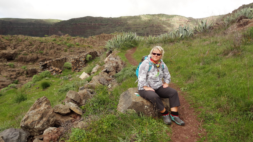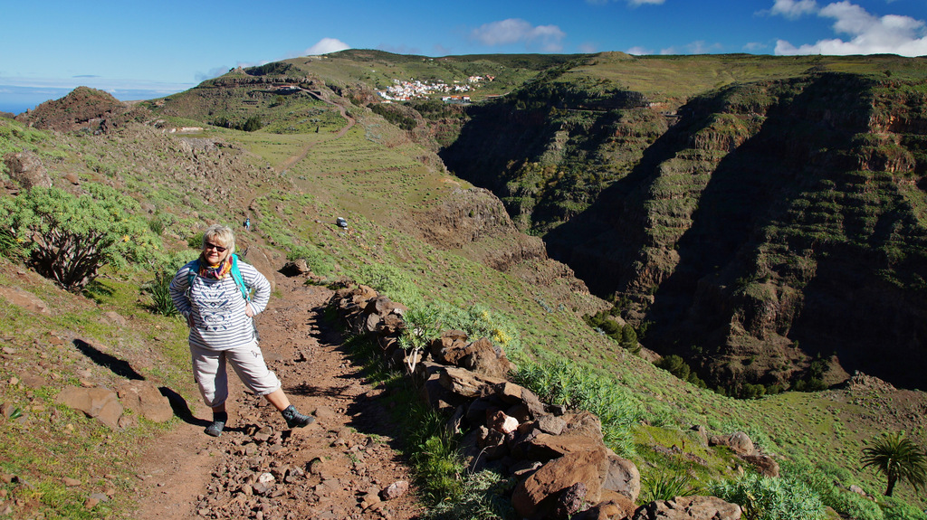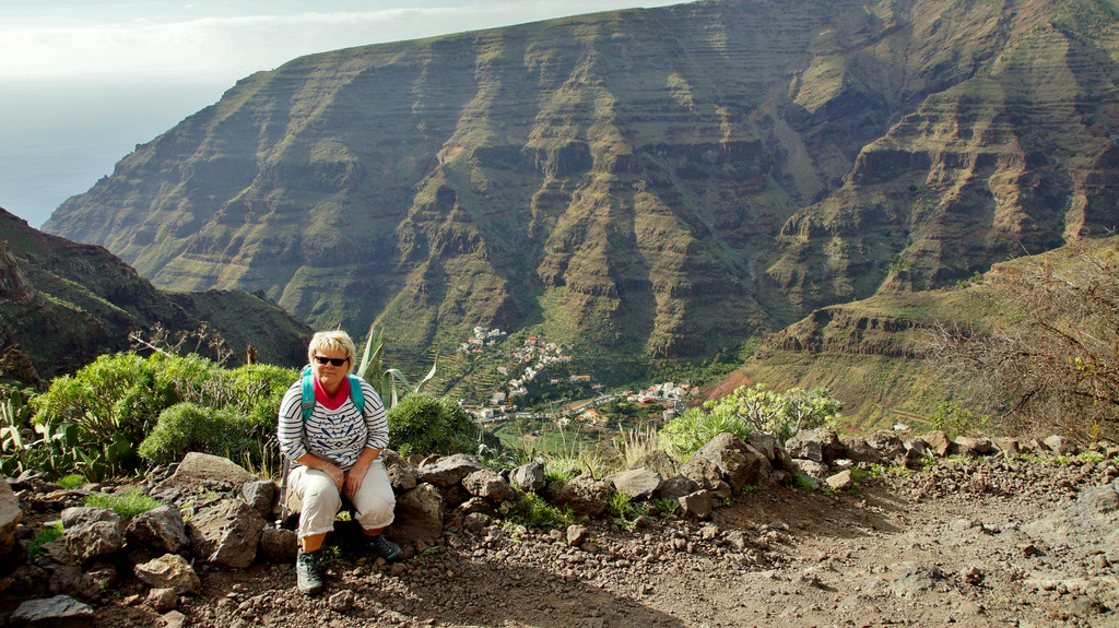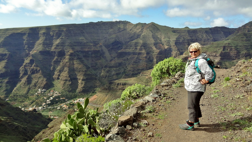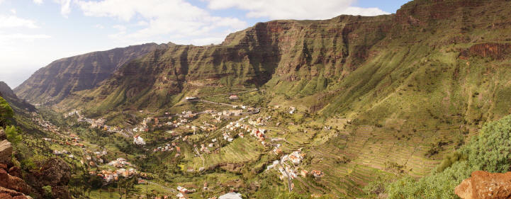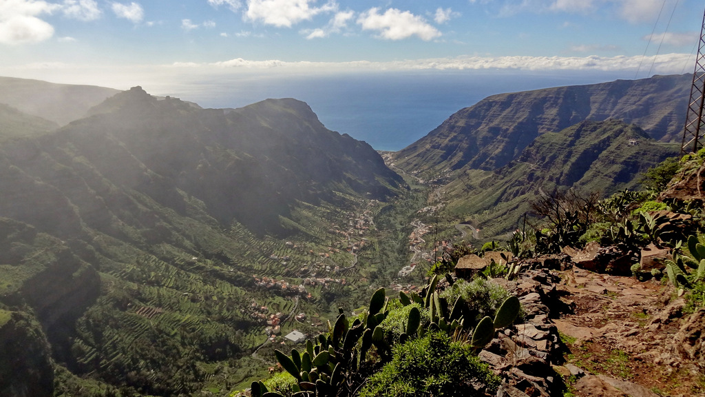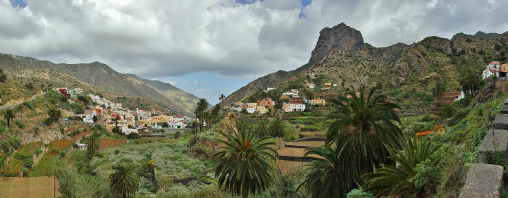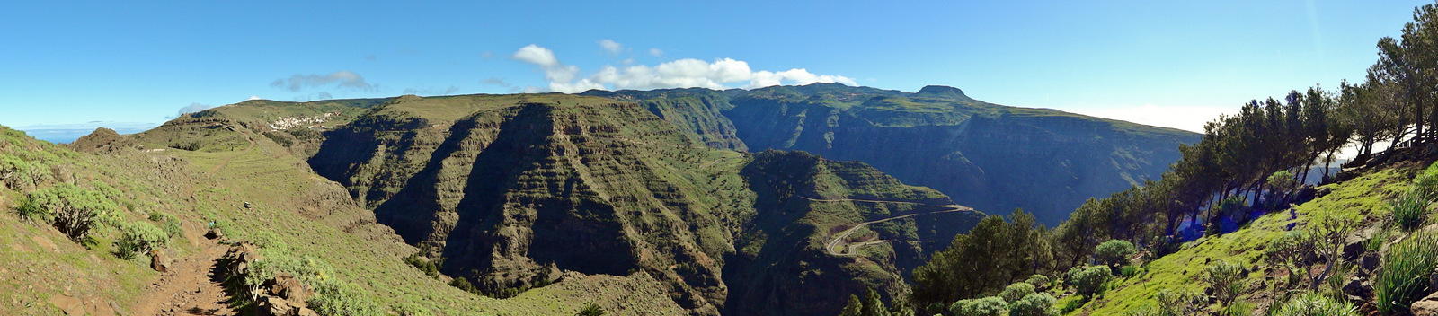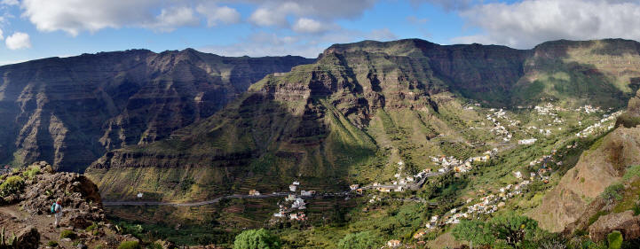 | Auch am heutigen Morgen sieht das Wetter im Valle Gran Rey recht sonnig aus. Anders als in den letzten Jahren ist es jedoch deutlich frischer und unbeständiger. Während es unten an der Küste meist moderat sonnig ist, ziehen, anders als wir es in den letzten Jahren erlebt haben, in den Bergen meist dunkle Wolken über die Cumbre. So spielen wir jeden Tag "Wetterlotto", denn den einschlägigen Wetterprognosen kann man nur sehr bedingt trauen. So wird uns auch für heute strahlender Sonnenschein prognostiziert, welchen wir am Morgen zu unserem Frühstück auch haben. Immer geht der Blick hinauf nach Arure und hier sieht es, wie auch schon in den vergangenen Tagen, sehr "heterogen" aus. Blauer Himmel wechselt aller paar Minuten mit dunklen Wolken in allen Schattierungen irgendwo dazwischen. Trotzdem entscheiden wir uns für den Mittagsbus hinauf in die Berge. Auch heute stellt sich die Frage, welche Route er wohl fahren wird? Wir sind mutig und hoffen, dass er heute wieder planmäßig über El Cercado fährt und werden heute, anders als gestern, auch nicht enttäuscht. Nach ca. einer Stunde Fahrzeit sind wir in El Cercado angekommen und steigen bei 8°C und einem frischem Wind aus dem Bus aus und ziehen uns schnell die Windjacken über. Hier starten wir unsere Abstiegswanderung über La Vizcaina hinunter ins Valle Gran Rey. Im oberen Bereich ist es ziemlich windig und wir müssen wegen dem strammen Wind die Kapuzen überziehen. Je weiter wir nach unten kommen desto mehr lässt der Wind nach und wir können das immer wieder tolle Panorama ins obere Tal genießen. Dann zeigt sich die Sonne wieder und wir haben bestes Wanderwetter. Das Tal haben wir ständig vor uns und steigen in vielen Serpentinen auf einem steilen aber gut ausgebauten Weg hinunter. Dann erreichen wir La Vizcaina und laufen entlang der Nebenstraße über die Ortschaften El Hornillo und Chelé weiter hinab ins Tal. Dann erreichen wir die Ermita de los Reyes und wechseln durch den Barranco hinüber nach El Guro. Auf der Straße geht es dann die letzten paar Meter hinunter nach La Calera und zurück ins Quartier. |