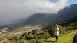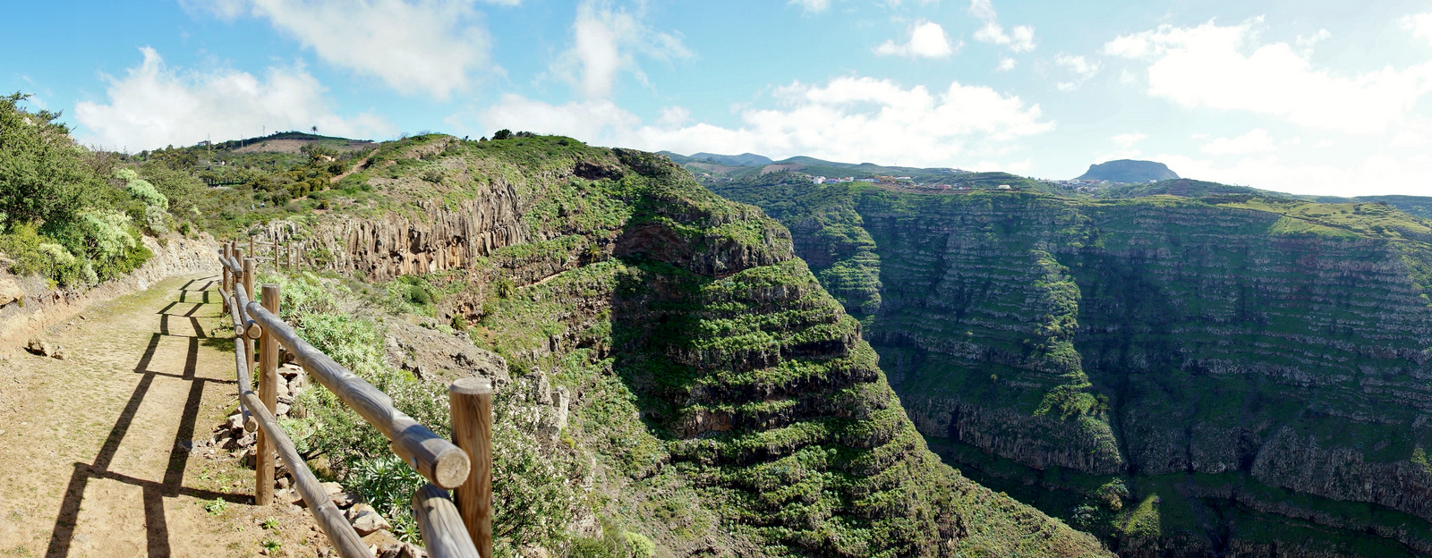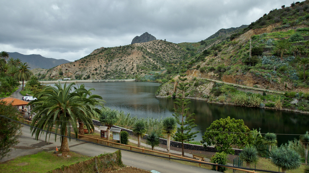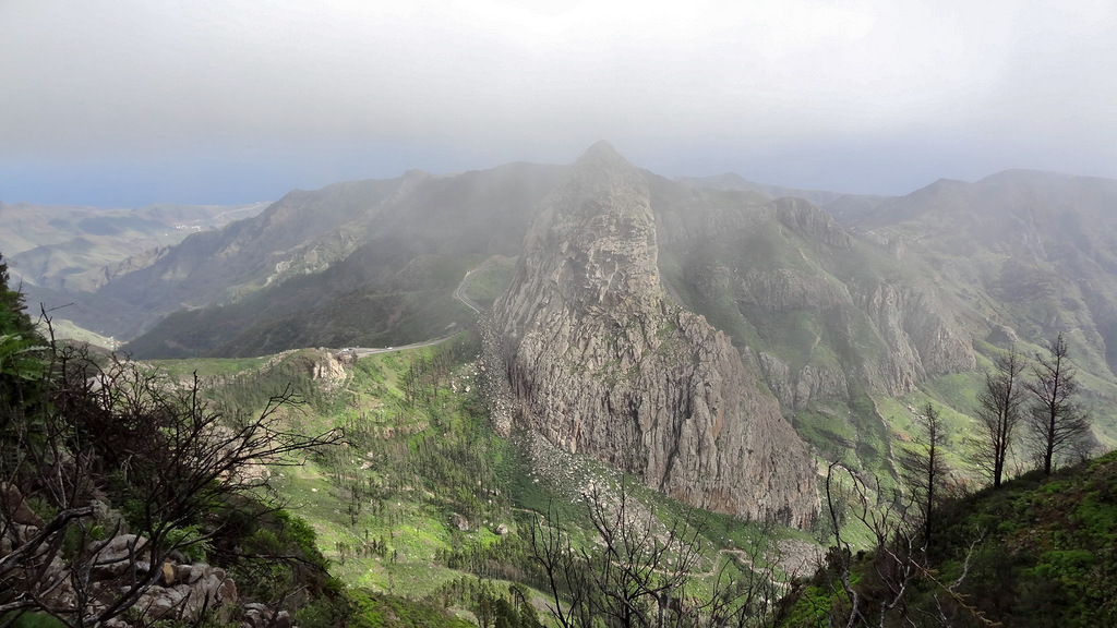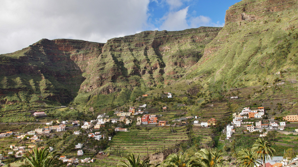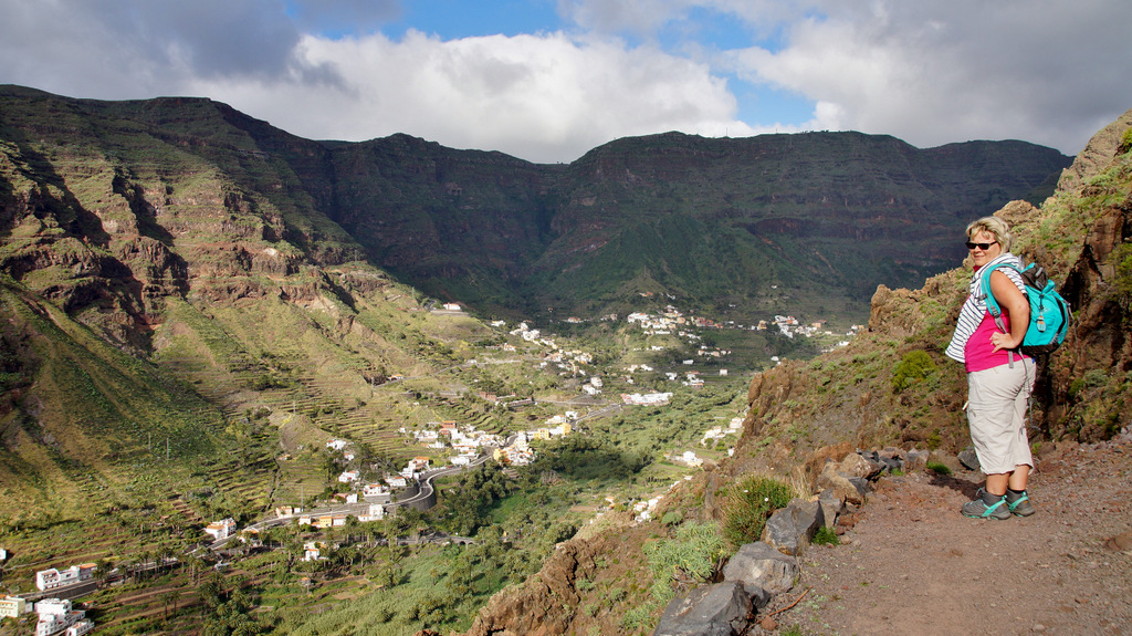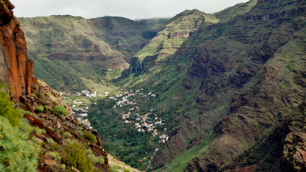 | Auch am heutigen Morgen sieht das Wetter im Valle Gran Rey recht sonnig aus. Anders als in den letzten Jahren ist es jedoch deutlich frischer und unbeständiger. Während es unten an der Küste meist moderat sonnig ist, ziehen, anders als wir es in den letzten Jahren erlebt haben, in den Bergen meist dunkle Wolken über die Cumbre. So spielen wir jeden Tag "Wetterlotto", denn den einschlägigen Wetterprognosen kann man nur sehr bedingt trauen. So wird uns auch für heute strahlender Sonnenschein prognostiziert, welchen wir am Morgen zu unserem Frühstück auch haben. Immer geht der Blick hinauf nach Arure und hier sieht es, wie auch schon in den vergangenen Tagen, sehr "heterogen" aus. Blauer Himmel wechselt aller paar Minuten mit dunklen Wolken in allen Schattierungen irgendwo dazwischen. Trotzdem entscheiden wir uns für den Mittagsbus hinauf in die Berge. Auch heute stellt sich die Frage, welche Route er wohl fahren wird? Wir sind mutig und hoffen, dass er heute wieder planmäßig über El Cercado fährt und werden heute, anders als gestern, auch nicht enttäuscht. Nach ca. einer Stunde Fahrzeit sind wir in El Cercado angekommen und steigen bei 8°C und einem frischem Wind aus dem Bus aus und ziehen uns schnell die Windjacken über. Hier starten wir unsere Abstiegswanderung über La Vizcaina hinunter ins Valle Gran Rey. Im oberen Bereich ist es ziemlich windig und wir müssen wegen dem strammen Wind die Kapuzen überziehen. Je weiter wir nach unten kommen desto mehr lässt der Wind nach und wir können das immer wieder tolle Panorama ins obere Tal genießen. Dann zeigt sich die Sonne wieder und wir haben bestes Wanderwetter. Das Tal haben wir ständig vor uns und steigen in vielen Serpentinen auf einem steilen aber gut ausgebauten Weg hinunter. Dann erreichen wir La Vizcaina und laufen entlang der Nebenstraße über die Ortschaften El Hornillo und Chelé weiter hinab ins Tal. Dann erreichen wir die Ermita de los Reyes und wechseln durch den Barranco hinüber nach El Guro. Auf der Straße geht es dann die letzten paar Meter hinunter nach La Calera und zurück ins Quartier. |