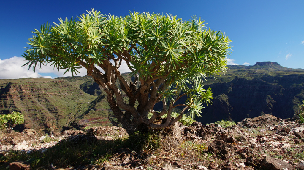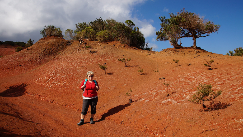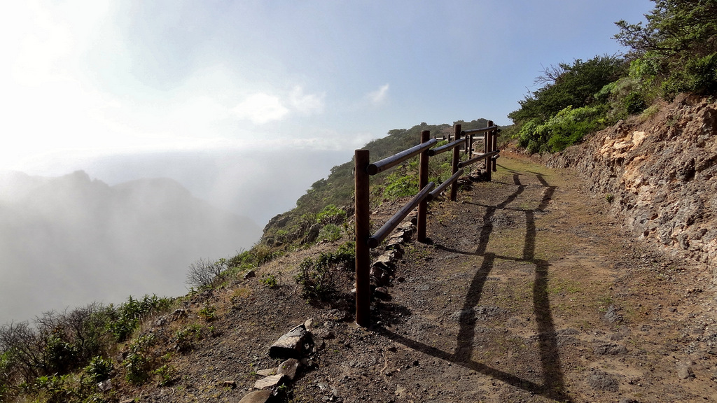 | Ja, es gibt ihn doch noch - den blauen Himmel. Nachdem es heute Nacht teilweise schon fast stürmisch war hat der Wind in der Nacht scheinbar den Calima vertrieben. So sehen wir heute Morgen seit ein paar Tagen erstmals wieder den blauen Himmel und die Sonne scheint ungefiltert vom fast wolkenlosen Himmel. An unserem letzten Tag mit Mietwagen hier auf La Gomera fahren wir heute wieder über Arure und die Höhenstraße nach Imada. Unterwegs zieht es sich zu und auf der Carretera Dorsal fahren wir durch den Nebelwald, wo der Nebel wallt. Das ist eben typisch Gomera-Wetter. Während wir unten bei angenehmen 20°C losgefahren sind, sinkt hier oben auf ca. 1.450 Metern Höhe die Temperatur auf ca. 9°C. Dazu pustet der Passat sehr heftig. Sobald wir am Parajito nach Süden abbiegen wird es schnell sonniger aber der Wind bläst doch noch sehr heftig. In Imada angekommen suchen wir uns einen der raren Parkplätze und machen uns auf den Aufstieg in Richtung El Azadoe. Zuerst führt der Weg in vielen Kehren teilweise recht steil hinauf. Als wir an einer Felsspitze auf die andere Talseite wechseln liegt der Wind voll an und man muss mit festem Schritt gehen, um nicht vom Weg gepustet zu werden. Dann biegen wir in Richtung El Azadoe ab und der Wind lässt, da wir jetzt im Windschatten laufen, schlagartig nach. Von der Kammscharte El Azadoe steigen wir wieder in einen kleine Barranco hinunter der auf der Gegenseite kurz ansteigt und dann auf dem gleichen Höhenlevel zurück nach Imada führt. Dort angekommen fahren wir hinunter nach Playa Santiago und verbringen bei angenehmen Sonnenwetter den Nachmittag an der Playa del Medio. Das Meer ist heute sehr ruhig und so springen wir mehrmals in den ca. 18°C "warmen" Atlantik. Dann geht es via Alajero und die Höhenstraße zurück ins Valle, wo wir endlich mal wieder einen farbenfrohen Sonnenuntergang an der Playa erleben können. Am Abend geht's dann wieder ins "Abisinia", wo Lorenzo der Wirt meinte, dass der Calima in den nächsten Tagen wiederkehren würde...hoffentlich liegt er damit daneben... |