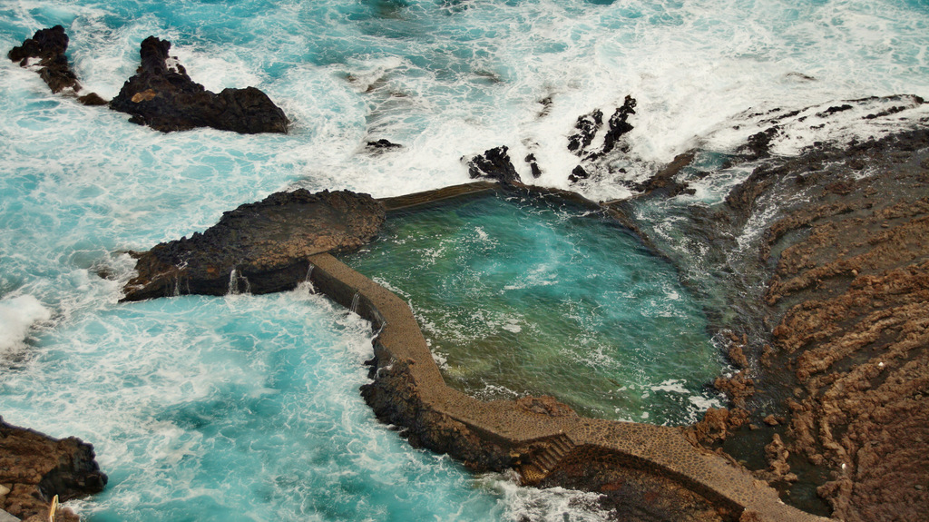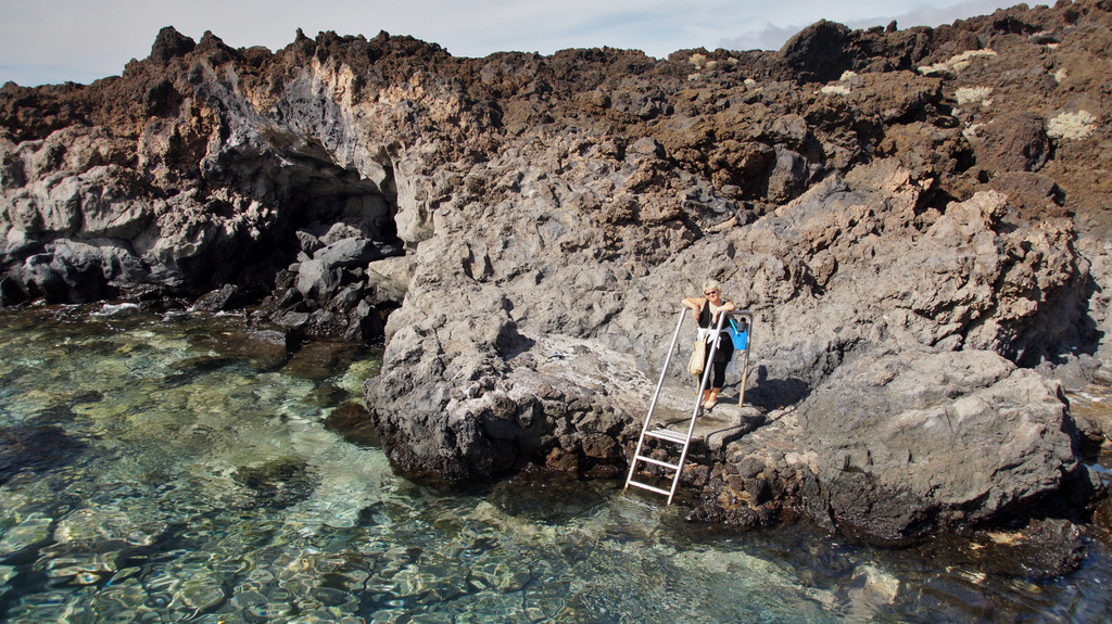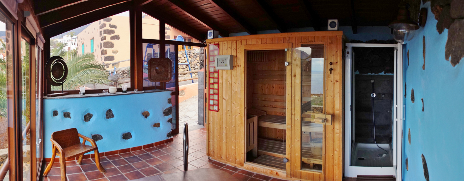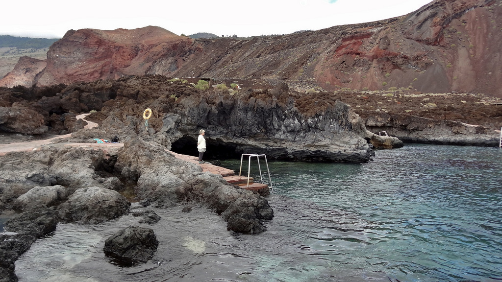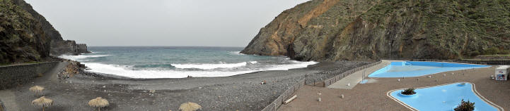 Nach einem leckeren Frühstück auf der Terrasse mit frisch geernteten Maracujas und einer leckeren El Hierro Ananas (...die werden hier auf der Insel angebaut), fahren wir die alte Verbindungsstraße über Frontera hinauf zur Cumbre. Dieses war bis zur Eröffnung des Tunnels zwischen Mocanal und Las Puntas die einzige Möglichkeit ins Gofotal zu gelangen. Teilweise liegen die Gipfel wolkenfrei doch immer wieder schieben sich Passatwolken vor die Sonne. Unterhalb der Cumbre fahren wir dann durch Lorbeer- und Baumheidewald, wie wir in von der Nachbarinsel La Gomera her kennen. Oben angekommen wird es dann schon deutlich nebliger und kurze Zeit später geht es im dichten Nebel nur noch langsam voran. Wir biegen zwar von der Straße kurz zum Mirador de Jinama ab aber hier stehen wir mitten in den Wolken und vom grandiosen Blick ins Golfotal ist leider nichts zu erkennen. Weiter fahren wir dann entlang der Hochebene Meseta de Nisdafe, welche mit ihren saftig grünen Wiesen, vielen Feldsteinmauern und weidenden Kühen etwas an Irland erinnert. Da es bei san Andres immer noch total neblig ist entscheiden wir uns spontan um und fahren in den, meist sonnigen, Inselsüden. Via El Pinar, wo wieder die Sonne scheint, fahren wir in den trockenen Süden. Bevor wir den südlichsten Ort der Insel, La Restinga, erreichen, biegen wir in eine kleine asphaltierte Nebenstraße ein, welche durch Lavagebiet, was uns an Lanzarote erinnert, hinunter zur Küste führt. Am Ende der Piste liegt die kleine Cala de Tacorón. Diese kleine Lavabadebucht liegt am Fuße der gigantischen Steilwand von El Julán. Um einen Mini Sandstrand liegen mehrere Lavabecken mit glockenklarem Wasser, in die man mittels Leitern gefahrlos in den Atlantik steigen kann. Hier genießen wir die warmen Sonnenstrahlen und nutzen die Gelegenheit zum Baden. Da heute Samstag ist, sind auch viele Herreños hier zu Gange. Viele Angeln und andere sind mit der gesamten Familie hier zum BBQ. Anschließend fahren wir die paar Kilometer weiter nach La Restinga, den südlichsten Ort der Insel. Um den Fischerhafen liegen ein paar Häuser und auch ein paar Fischrestaurants. Trotzdem hat der Ort einen eher rauen Charme, so dass wir nach kurzem Bummel wieder zurück fahren. Für den Rückweg nehmen wir wieder die alte Bergstraße ins Golfotal und erleben das selbe Wetterwechselspiel wie heute Vormittag. In Frontera machen wir noch einen Fotostopp am markanten Kirchturm der Iglesia Nuestra Señora de Candelaria. Nach ein paar Lebensmitteleinkäufen geht es dann retour ins Quartier, wo wir am Außengrill ein paar leckere Rumpsteaks auflegen. N ach dem Abendessen geht es natürlich wieder in unsere eigene Sauna. |