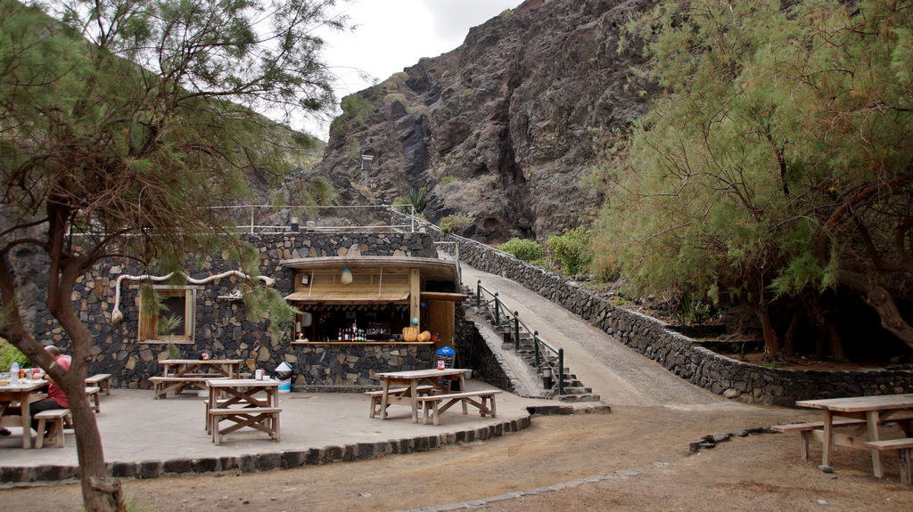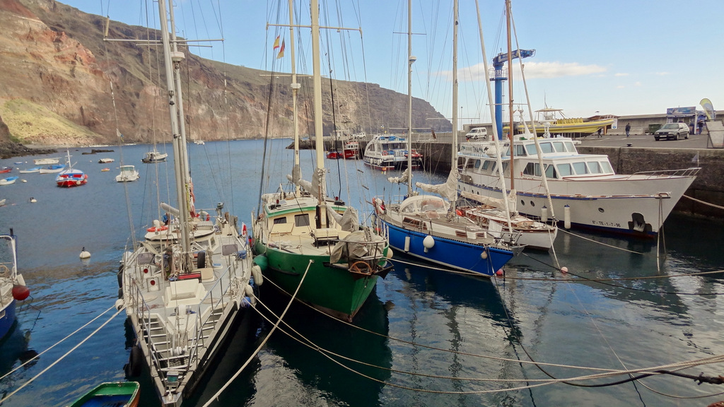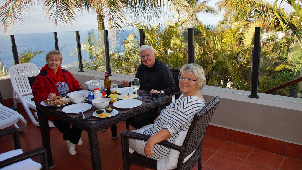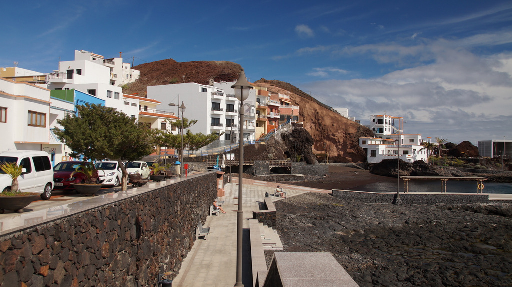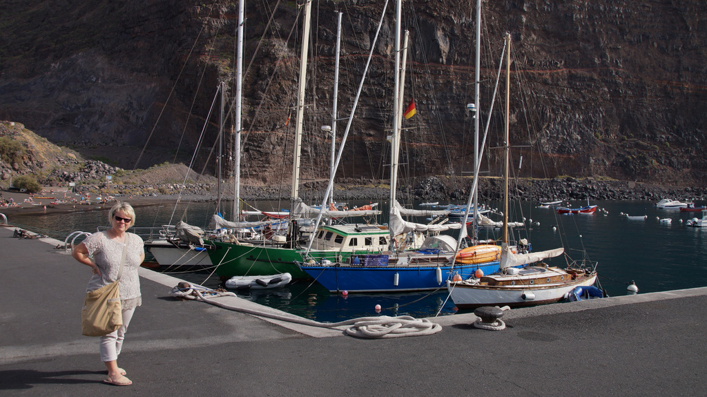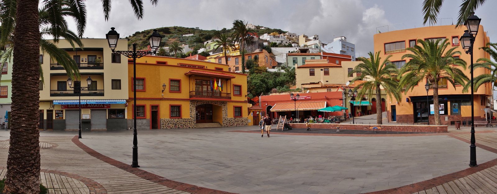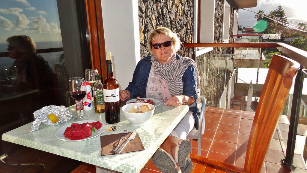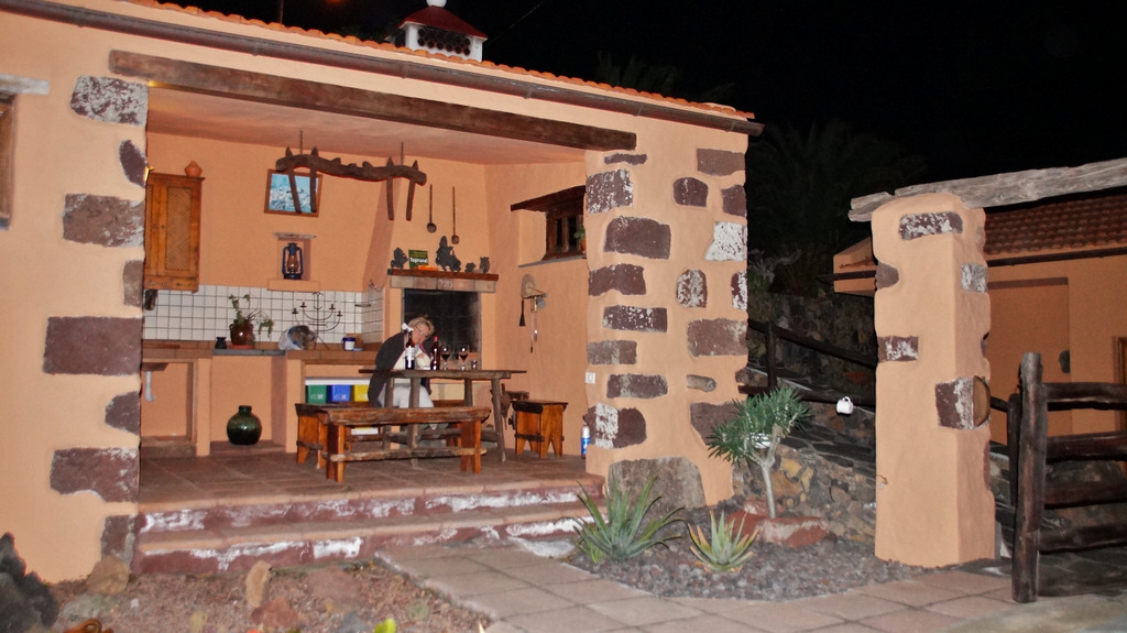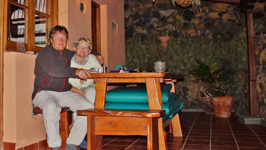 | Nachdem wir die letzten beiden Tage intensiver gewandert sind, steht heute mal wieder ein etwas ruhigerer Tag auf dem Programm. Wir dehnen das obligatorische Terrassenfrühstück recht lange aus und lassen es uns in der warmen Januarsonne gutgehen. Aus den Bergen schieben sich immer mal wieder ein paar dunklere Wolken ins Tal und auch der Wind pustet teilweise etwas heftiger. Im Nachmittag bummeln wir dann zum Hafen nach Vueltas, wo wir am kleinen Strand noch ein paar Sonnenstrahlen mitnehmen. Dann essen wir im El Pescador zu Abend. Traditionell stehen hier (...anders als der Name des Restaurants vermuten lässt) leckere Pollo asados (Grillhähnchen) auf unserer Speisekarte. |