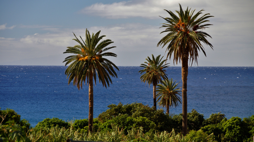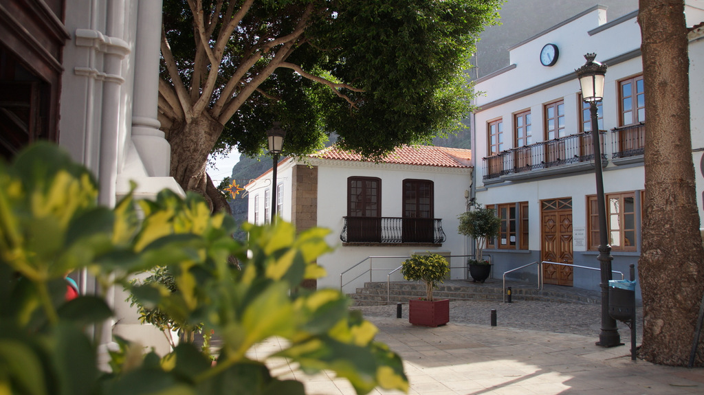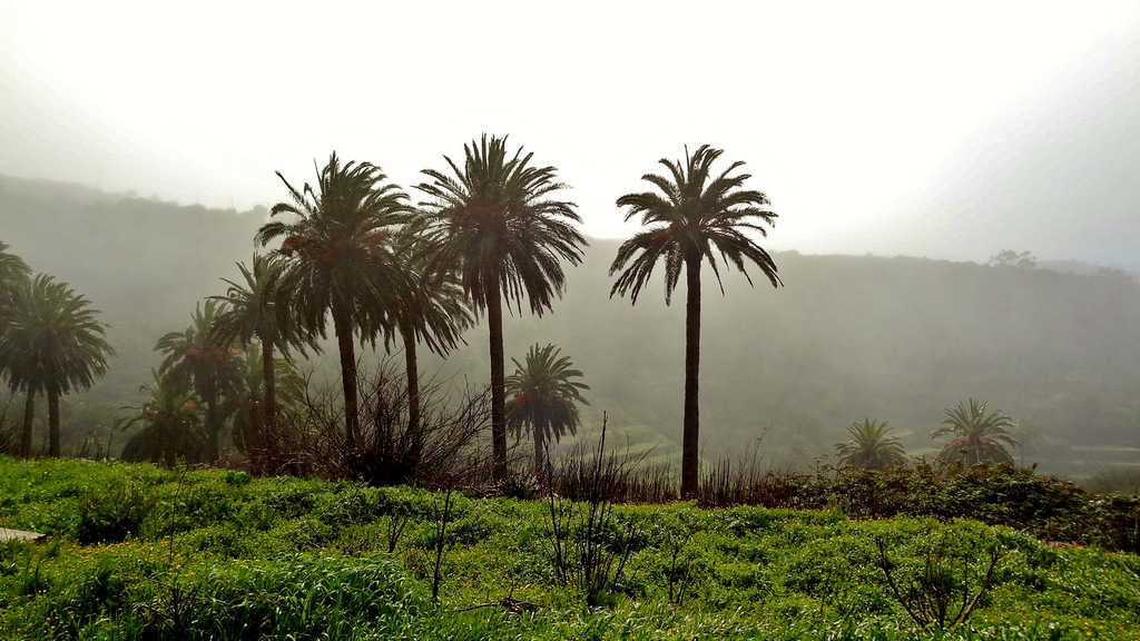 | Die heutige Wetterangabe ist leider nur relativ richtig. In allen Wetterberichten ist zwar strahlender Sonnenschein ohne Wolken vermeldet aber leider stimmt das nur bedingt. Richtig ist, dass es keine einzige Wolke am Himmel gibt (...daher auch hier das Sonnensymbol) doch leider wird die Luft heute noch deutlich mehr als gestern vom Saharastaub des Calima getrübt. Damit fehlt den meisten Bildern heute auch die Farbbrillanz. Da keine Fernsicht zu erwarten ist fahren wir am Morgen hinauf via Arure an die Westküste ins Palmendorf Taguluche. Der Ort liegt in ziemlicher Abgeschiedenheit und ist nur auf einer engen, oftmals von herunter gestürzten Steinen überzogenen, Straße zu erreichen. Wir drehen eine Runde durch den Weiler und machen an der fotogenen kleinen Ermita de Buenviaje einen kurzen Fotostopp. Dann schlängeln wir uns bis zum Abzweig nach Alojera die Serpentinenstraße wieder hinauf und fahren in den Nachbarort. In Alojera fahren wir durch die enge Straße durch den Ort hinunter zur Playa de Alojera. Hier ist es relativ einsam und anders als im Valle Gran Rey säumen nur wenige kleine Häuser den rustikalen Steinstrand mit seiner alten Mole. Dann geht die Fahrt wieder hinauf zur Höhenstraße wo wir kurz hinter Apartacaminos bei Las Creces halten. Von hier aus starten wir eine Rundwanderung durch den Lorbeerwald. Neben vielen Farnen und natürlich vielen Lorbeerarten findet man hier auch Baumheide und viele wilde Blumen. Da es hier oben in ca. 1.200 Metern Höhe oft sehr nebelig ist hängen an vielen Bäumen die markanten Flechten wie Bärte an den Zweigen. Dann geht die Fahrt weiter auf der Höhenstraße und wir biegen kurz vor Los Roques in die Straße hinunter nach Hermigua ein. Leider müssen wir feststellen, dass ab dem Abzweig El Cedro die Straße wegen eines Felssturzes im Nationalpark gesperrt ist, so dass wir wieder auf die Carretera Dorsal zurückfahren und via Las Rosas auf die Nordseite der Insel gelangen. Nachdem wir Vallehermoso erreicht haben biegen wir hinunter ins Valle Abajo ab und erreichen die Playa de Vallehermoso. Neben einer geschlossenen Badeanlage liegt hier das Castillo del Mar - leider auch seit vielen Jahren ohne Besuchsmöglichkeit. Die Straße ist mit vielen Felsbrocken übersät und eine angebliche Wiedereröffnung im April 2015 scheint uns angesichts dieses Zustandes eher fraglich. Ein paar Fotos später fahren wir wieder hinauf nach Vallehermoso und via Epina zurück ins Valle. An einen tollen Sonnenuntergang ist wegen des Calima auch heute nicht zu denken. |