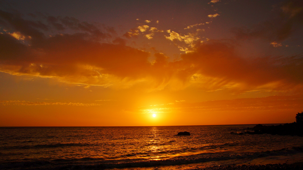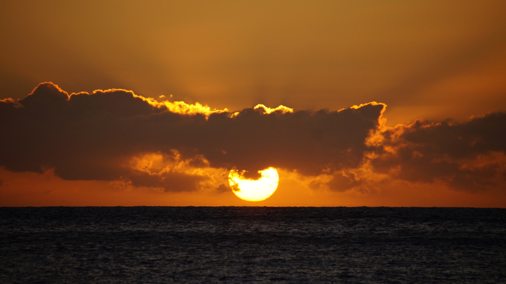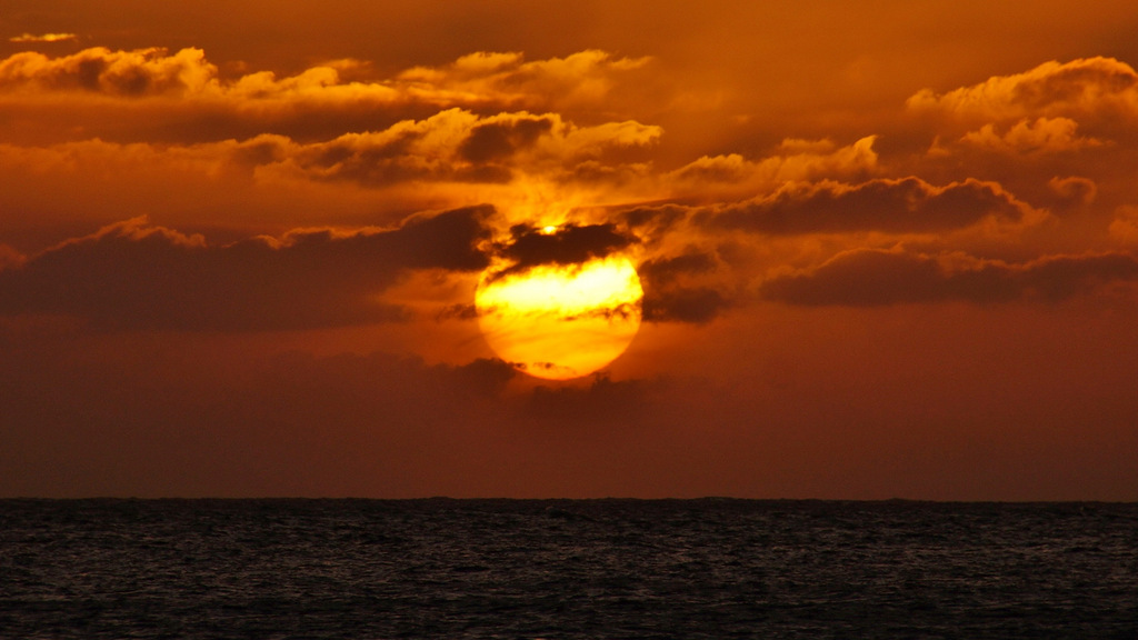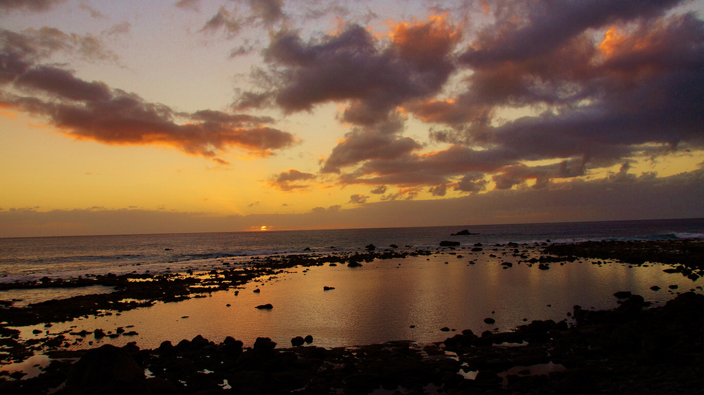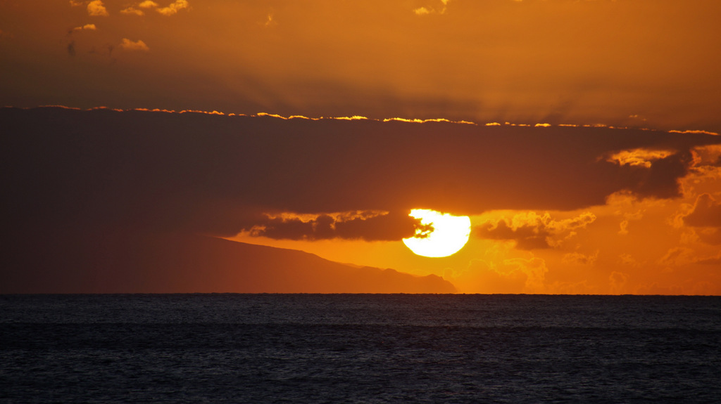 | Nach dem Frühstück übernehmen wir unseren Mietwagen, welcher uns in den kommenden 7 Tagen über die Insel bringen wird. Wir fahren über Arure aus dem VGR nach oben und nehmen dann die Strecke weiter über Las Hayas, El Cercado nach Chipude. Hier biegen wir in Richtung Fortaleza ab. Dieses mal nicht um auf den Tafelberg hinaufzusteigen sondern um wieder einmal hinunter nach La Dama zu fahren. Hier werden noch, anders als im Valle, im größeren Stil Bananen angebaut. Seit unserem letzten Besuch ist auch eine asphaltierte Straße der Holperpiste hinunter nach La Rajita gewichen, so dass wir zur alten Fischfabrik hinunter zur Küste fahren. Hier ist es herrlich ruhig und man ist fast ganz allein in der steinigen Bucht. Nachdem wir einige Zeit die warme Sonne genossen haben fahren wir wieder hinauf und machen noch einen kurzen Fotostopp an der Plaza mit der kleinen Ermita in La Dama. Wieder oben in Chipude angekommen fahren wir weiter nach Igualero und biegen hier hinunter in Richtung Alajero und Playa Santiago ab. An der Playa del Medio verbringen wir dann den Nachmittag in der Sonne. Zum Baden ist es allerdings schwierig, da teilweise hohe Wellen an den Strand kommen und das bei den großen Steinen am Ufer nicht ganz ungefährlich ist. Dann geht es über die Höhenstraße wieder zurück ins Valle Gran Rey. Während es oben am Garajonay in ca. 1.400 Metern Höhe sehr windig und recht frisch ist, erreichen wir das Tal bei moderatem Sonnenwetter. Allerdings hat auch hier der Wind etwas aufgefrischt. So suchen wir uns ein windgeschütztes Plätzchen an der Playa und erleben auch heute hier den Sonnenuntergang. Inzwischen hat es der glutrote Feuerball auch geschafft an der Insel El Hierro "vorbeizukommen". |