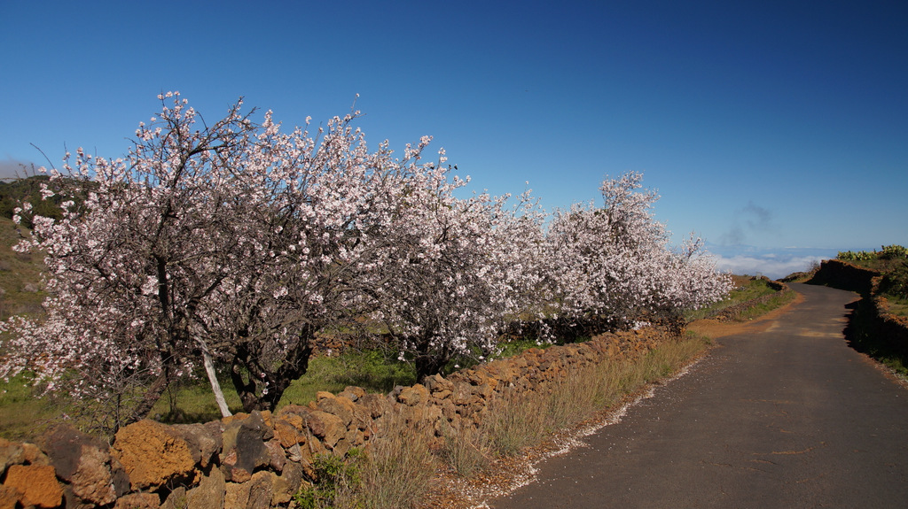 | Auch heute Nacht war es wieder recht windig. Einem Terrassenfrühstück steht trotzdem nichts im Wege, da der Wind am Morgen etwas nachlässt. Dann drehen wir eine kurze Runde in Richtung Vueltas und Borbalan um einige Dinge einzukaufen. Vor allem füllen wir unsere Vorräte bei Maracujas und frischen Orangen auf. Jeden Morgen lassen wir uns ein Glas frisch gepressten Orangensaft aus Naranja del Pais (frische Orangen von La Gomera) schmecken. Da aktuell die Straße zwischen Las Hayas und dem Parajito geteert wird fährt der Bus nur an Wochenenden über die Dörfer. Da am Sonntag ohnehin der Busverkehr noch übersichtlicher ist als sonst, bleibt also nur der Samstag für eine Busanreise nach El Cercado. Also nutzen wir die Gelegenheit und fahren mit dem 13:00 Uhr-Bus noch oben. Nach genau 1 Stunde Fahrt erreichen wir dann endlich El Cercado, den Ausgangspunkt unserer heutigen Wanderung zurück ins Valle Gran Rey. Hier oben in mehr als 1.000 Meter Höhe ist es etwas frischer doch glücklicherweise fast windstill, so dass wir die Wanderung bei besten Bedingungen genießen können. Zwischen Agaven, Palmen und entlang alter Terrassenfelder geht der Weg in Richtung Alm La Matanza. Da es in den letzten Monaten hier oft geregnet hat sind die alten Felder mit einem tollen Grün überzogen. Dann erreichen wir die Alm und die Kreuzung, wo der Weg aus Richtung Chipude einmündet. In den Felsscharten hier oben steht viel Wasser was wir hier oben bisher selten erlebt haben. Dann geht der Weg entlang einer verfallenen Levada weiter im oberen Teil des Barranco de Argaga. An vielen Stellen blühen schon die Mandelbäume. Am Horizont sehen wir dann auch die markante Ermita de Guadeloupe. Noch vor der Ermita steigen wir in den Barrancogrund hinunter, um auf der anderen Seite wieder zur Kammscharte Degollada del Cerrillal aufzusteigen. Von hier hat man den ultimativen Blick in zwei Richtungen. Zuerst auf unsere bisherige Wegstrecke im oberen Barranco de Argaga und auf der anderen Seite hinunter ins Valle Gran Rey. Hier beginnt dann auch unser Abstieg hinunter über den Kirchenpfad. Seit kurzem ist der Kirchenpfad deutlich besser zu begehen als in der Vergangenheit, wo eine Vielzahl von kleinen Vulkangesteinen den sog. "Kugellagereffekt" erzeugt haben. Nach fast genau 1 Stunde nach der Degollada del Cerrillal sind wir dann unten angekommen und gehen noch die wenigen Meter bis zur Ermita de Los Reyes, der Namensgeberin für den Abstiegsweg. Von hier geht es dann via El Guro entlang der Straße hinunter nach La Calera und weiter nach La Playa. Hier erleben wir heute einen tollen Sonnenuntergang, welcher nach Tagen des Calima sich heute wieder von seiner besten Seite zeigt und natürlich entsprechend "betrommelt" wird. |