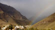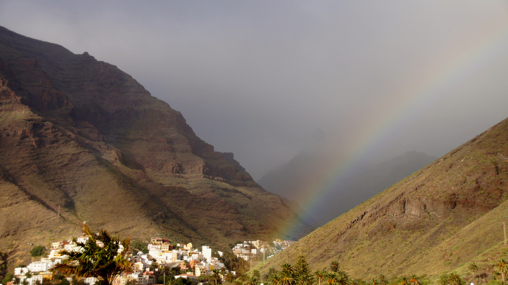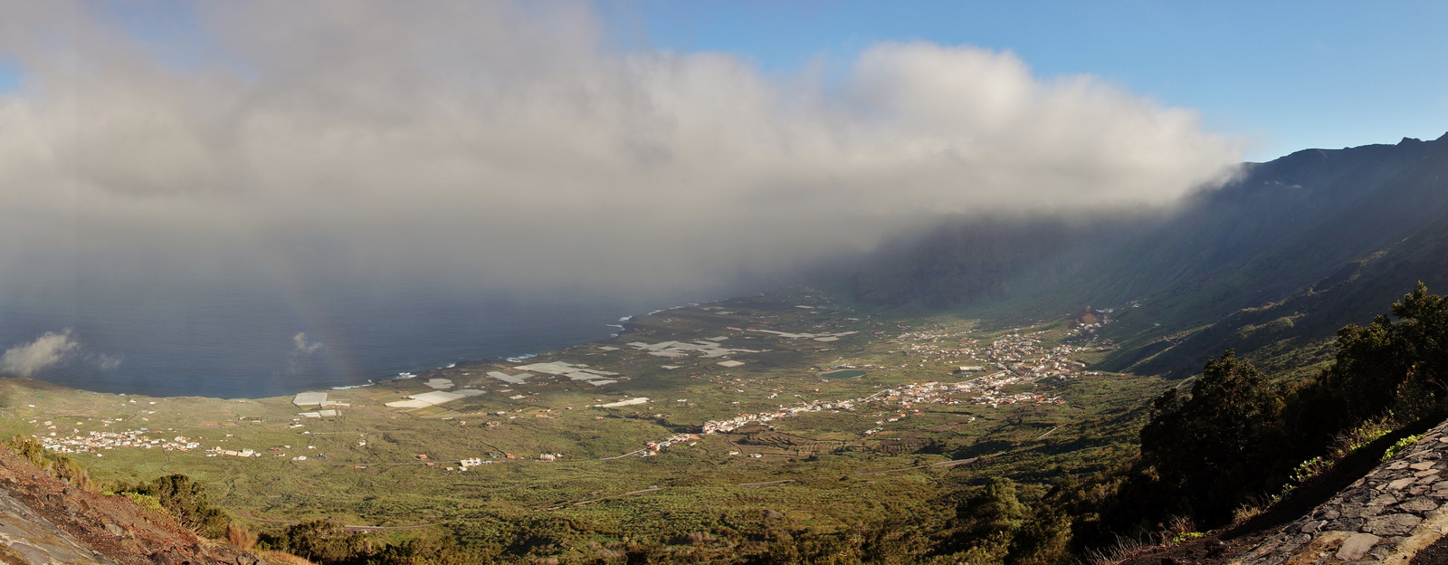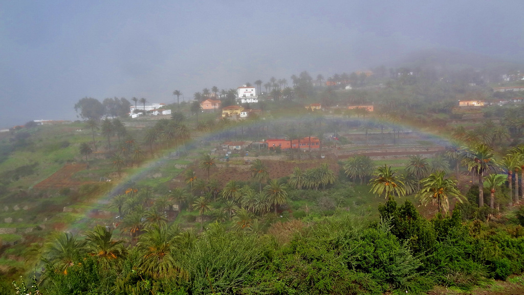 | Heute Morgen lacht die Sonne und der Calima ist nun hoffentlich endlich vorbei. Wir Frühstücken bei bestem Sonnenwetter auf der Terrasse und entschließen uns, heute den Abstieg über die Hochebene La Mérica anzugehen. Da der 08:00 Uhr-Bus lange weg ist und der nächste erst 13:00 Uhr fährt, versuchen wir wieder per Autostopp unser Glück. Schon nach kurzer Zeit finden wir eine Mitfahrgelegenheit und erreichen so Arure. Anfangs weht hier oben ein frischer Wind doch auf dem weiteren Weg lässt dieser dann schnell nach und weite Teile unserer Wanderung erleben wir bei Windstille ...was sich im Laufe des Abends dann aber ändern soll. Vorbei am nach Jahren Bauzeit nun fast fertigen Mirador El Santo biegen wir in den Weg ein und lassen uns an dieser Stelle vom tollen Panorama hinunter nach Taguluche und den Galionbergen beeindrucken. Auch die Nachbarinseln La Palma und El Hierro können wir deutlich sehen und mit bloßem Auge erkennen wir Ortschaften wie Fuencaliente und Santa Cruz auf La Palma. Mit tollem Blick auf das obere Valle Gran Rey und hinüber nach Las Hayas, El Cercado und Chipude sowie zur Fortaleza gehen wir auf der La Mérica-Hochebene entlang. Dann erreichen wir die vordere Kante der Ebene und das untere Tal liegt wie im Modellformat vor uns. Nach einer kurzen Rast geht es dann in vielen Serpentinen - wenig kniefreundlich - ca. 800 Hm nach unten. Dann erreichen wir La Calera und schlendern von dort aus zurück in unser Quartier, wo wir die späte Nachmittagssonne auf unserer Terrasse genießen. Gegen Abend ziehen dann ein paar Wolken auf und plötzlich, wie aus dem Nichts, sehen wir im Obertal Regen aufziehen. Ein paar kleine Tropfen schaffen es bis an die Küste und somit bildet sich auch ein Regenbogen vor dem Tequergenche. Auch der Wind wird ziemlich frisch, so dass wir den Sonnenuntergang heute nur in der Light-Version am Charco del Conde erleben. |