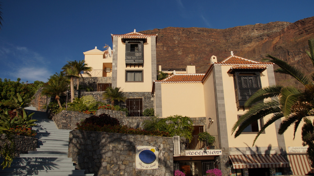 | Schon sehr früh klingelt heute der Wecker und wir machen uns gegen 03:30 Uhr auf den Weg zum Flughafen Leipzig/Halle. Fast pünktlich um 06:50 Uhr startet dann der Flieger nach Tenerife SUR. Nachdem wir die Koffer in Empfang genommen haben fahren wir mit dem TITSA-Bus Linea 111 nach Los Cristianos. Die Estacion Maritima erreichen wir nach kurzem Fußmarsch und die ARMAS-Fähre (30,-EUR p.P.) bringt uns dann pünktlich hinüber nach San Sebastian. Schnell finden wir ein anderes Pärchen mit denen wir uns das Taxi ins Valle teilen, da ja leider immer noch keine Fähre ins Valle Gran Rey fährt. Gegen 17:00 Uhr checken wir dann im Baja del Secreto ein. Am Abend schlendern wir noch in Richtung Vueltas wo wir natürlich in unserem Stammrestaurant, dem "Abisinia" leckere Chopitos zu Abend essen. |