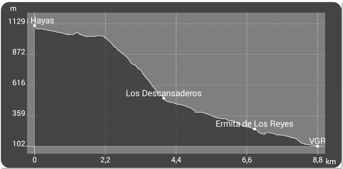 | Heute ist in jeder Beziehung ein besonderer Tag. Ganz besonders ist dabei natürlich der Geburtstag von Jenny. Somit stehen wir in einer globalisierten Welt vor der Frage, wann gratuliert man zum passenden Zeitpunkt, wenn sich die "Jubilarin" weit ab in einer anderen Zeitzone im fernen Mexico befindet? Da wir aufgrund unseres heutigen Tagesprogramms sowieso zu einer unchristlichen Zeit aufstehen müssen, entscheiden wir uns für die Variante nach mexikanischer Zeit und klingeln pünktlich mit unserem Wecker, der um 06:00 Uhr kanarische Zeit klingelt, nach Mexico durch. Dort ist es gerade Mitternacht, so dass wir pünktlich sind. Nach der Gratulation gönnen wir uns noch eine halbe Stunde, bis wir dann wirklich aufstehen müssen, um noch den 08:00 Uhr-Bus zu erwischen. Dazu haben wir uns entschlossen, da alle Wetterportale für heute bestes Wanderwetter vorhersagen - und sie sollten recht behalten. Wir haben Glück und ergattern noch einen der raren Plätze in einem der beiden Busse und fahren hinauf bis Las Creces zur Höhenstraße. Hier oben ist es trotz (...oder sicher gerade wegen) der wenigen Wolken ziemlich frisch, so dass wir uns nach dem Aussteigen erst einmal die Fleecejacken überziehen. Dann beginnen wir den Abstieg durch einen urigen Lorbeerwald hinunter ins herrliche Tal von Vallehermoso. Zuerst erreichen wir den Risquillo de Corgo, wo wir einen ersten tollen Blick hinunter ins Tal von Vallehermoso mit dem markanten Roque Cano haben. Dann queren wir die Forstpiste la Meseta und steigen weiter die ca. 900 Hm ins Tal hinunter. Da ich am Smartphone eine Aufzeichnung der GPS-Daten entdeckt habe, füge ich für unsere heutigen Wanderungen mal die Höhenprofile mit hinzu. Bisher sind wir immer die steile Variante über den Lomo del Corte gegangen doch dieses mal nehmen wir den Weg hinunter über den Stausee Presa de La Encantandora. Als wir in Vallehermoso ankommen geht es zur Estacion de Guagua und wir fahren wir der Linie 4 bis Las Hayas hinauf. Da Ines' Bedarf an Wandern für heute gestillt ist, fährt sie allein mit dem Bus hinunter ins Valle Gran Rey. Ich hingegen nehme nochmal den "Mastenabstieg" mit weiteren 1.050 Hm, welchen ich am Freitag bereits gegangen bin. Da es da allerdings vom Wetter eher schwierig war und heute der bisher wetterstabilste Tag ist, gehe ich die Strecke nochmals an. Hinter der "Casa Efigenia" beginnt der Weg, welcher zuerst durch den kleinen Ort führt und dann nach kurzer Zeit zur Abbruchkante des Barranco de Valle Gran Rey führt. In vielen steilen aber gut ausgebauten Serpentinen führt der Weg hinunter nach Los Descansaderos und dann weiter über La Vizcaina, El Hornillo und Chelé zur Ermita de Los Reyes. Von hier ist es nicht mehr weit und ich bin wieder in unserer Unterkunft angelangt, wo Ines auf der Terrasse schon auf mich wartet. |