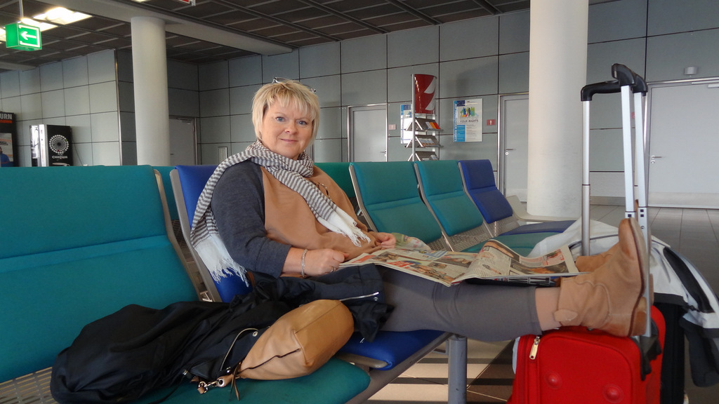 unsere Koffer ab (eingecheckt haben wir schon gestern online) und warten,