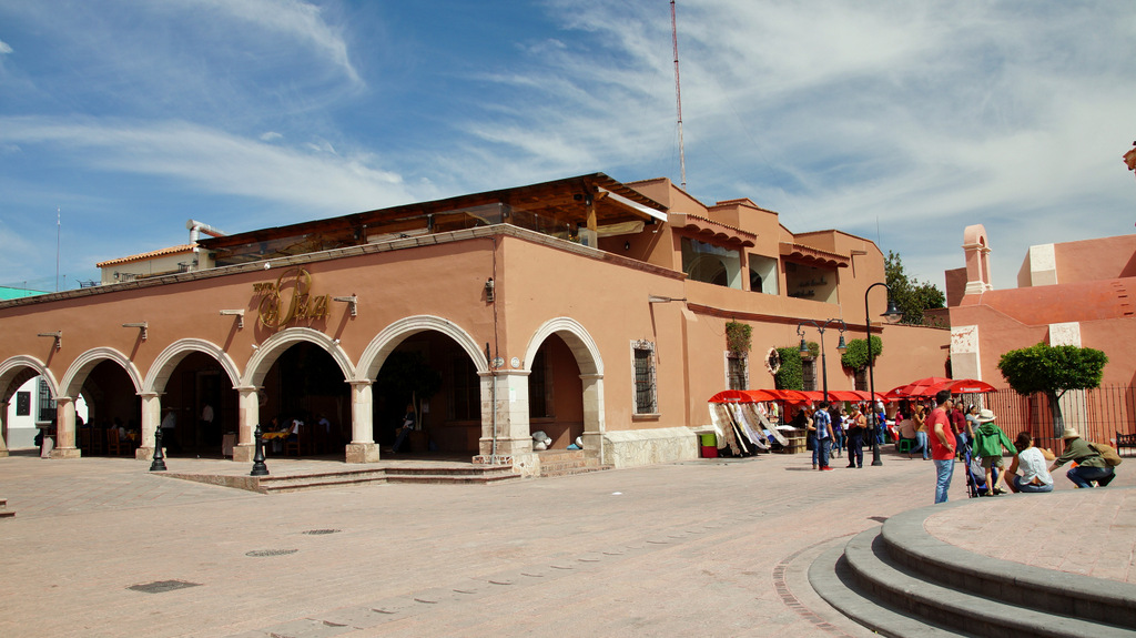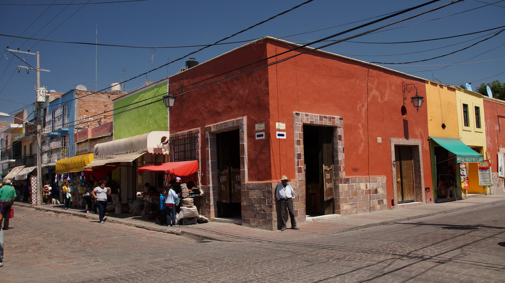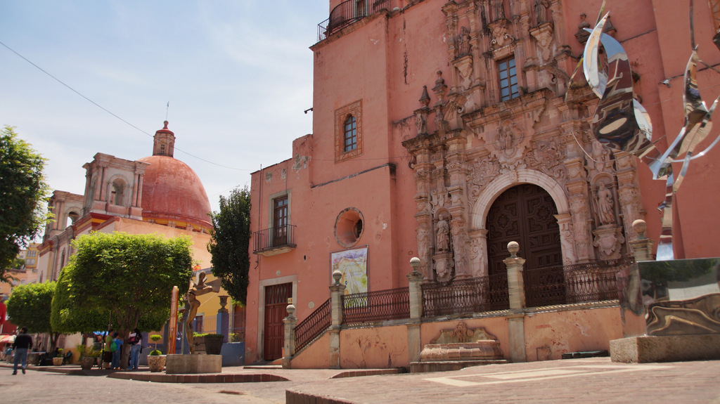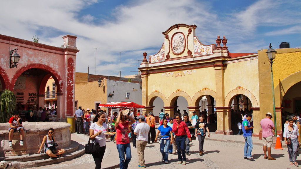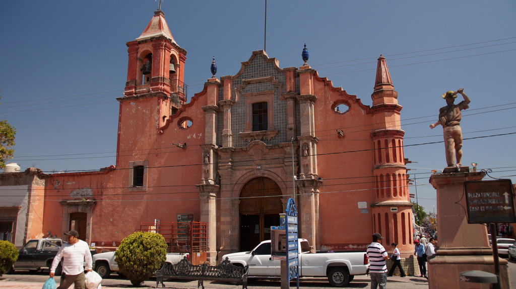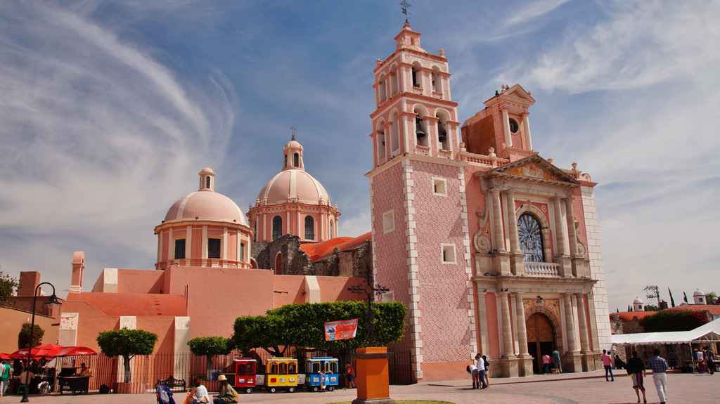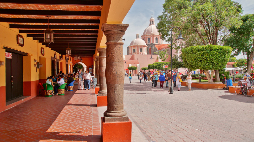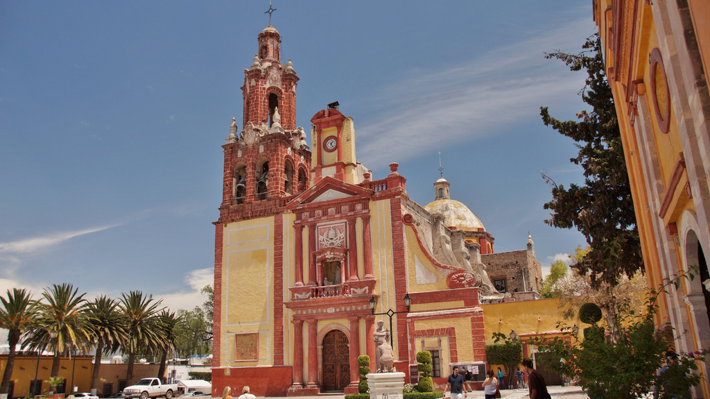 | Kurz nach 07:00 Uhr brechen wir mit dem Auto auf. Wie gestern geht es über die Periferico westlich am Stadtzentrum vorbei. Im Norden der Stadt biegen wir dann auf die Autobahn in Richtung Querétaro ein. Bei San Juan del Rio biegen wir ab und erreichen kurze Zeit später unser erstes Ziel - Tequisquiapan. Dieser Ort ist ein sog. Pueblo magico, was man dem Ort in positiver Hinsicht auch ansieht. Hier treffen wir auf viele tolle Fassaden und alte Kolonialarchitektur. Alles ist recht chic herausgeputzt und man hat das Gefühl, eher in Spanien zu sein. Hier nutzen wir das sonnige Wetter für einen ausgedehnten Ortsbummel. Hier in Tequisquiapan ist auch der geofrafische Mittelpunkt Mexicos, was durch ein Denkmal im Ort auch entsprechend dokumentiert wird. Da wir entlang der Routa Queso y Vinos (Käse- und Weinroute) unterwegs sind probieren wir den lokalen Käse und erstehen eine Ecke für das nächste Frühstück. Dann fahren wir weiter nach Norden bis nach Cadereyta. Auch dieses ist ein Puebla magico, auch wenn es nicht ganz mit Tequisquiapan mithalten kann. Auch hier sind die Straßen des Ortes typisch quadratisch angelegt und der Ort wird von typisch spanisch-kolonial anmutenden Flachbauten geprägt. Markantestes Bauwerk ist natürlich auch hier die Ortskirche, welche wir besichtigen. Dann lassen wir Cadereyta hinter uns und fahren weiter nach Bernal. Auch dieser Ort ist ein "magisches Dorf" und wird vom drittgrößten Monolithen der Welt, dem Peña de Bernal überragt. Da dieser Ort wirklich ein Schmückkästchen ist haben bei diesem herrlichen Wetter und durch die Osterfeiertage viele Besucher den Weg hierher nach Bernal gefunden, so dass wir erst nach einigem Suchen einen Parkplatz finden. In den alten Gassen ist es dann wirklich sehr eng, doch das was es hier zu sehen gibt, ist schon außergewöhnlich. Ein kleiner Ort wie aus dem Bilderbuch und viele tolle Fassaden. Natürlich gibt es auch hier eine Unzahl von kleinen Läden und Geschäften, welche allerlei Dinge anbieten. Am Abend geht die Fahrt weiter in die Provinzhauptstadt Querétaro, wo wir im La Hija del Alfarero einchecken. Nach einer kurzen Erfrischung machen wir uns ins Centro Historico auf den Weg. das erreichen wir nach nur kurzem Fußmarsch, da unser Hotel ziemlich in der Innenstadt liegt. Auch hier ist heute Abend, sicher wegen des Osterwochenendes, sehr viel los und es sind unzählige Menschen unterwegs. Auch Querétaro hat eine tolle historische Innenstadt und gefühlte 1000 Kirchen. Am Abend ist alles sehr schön angestrahlt. Nachdem wir heute sehr lange unterwegs waren fallen wir gegen 22:00 Uhr ziemlich müde ins Bett. | |