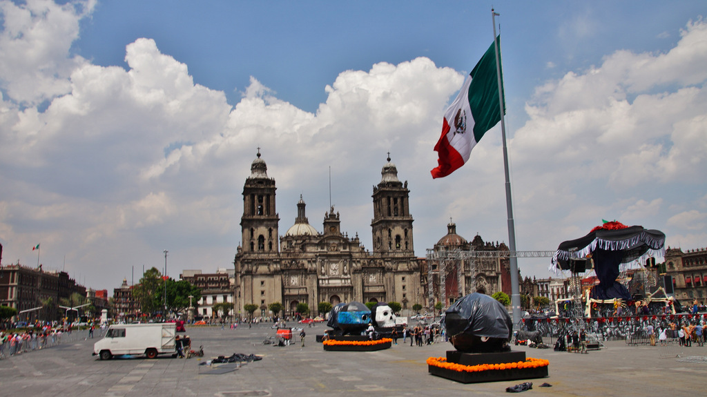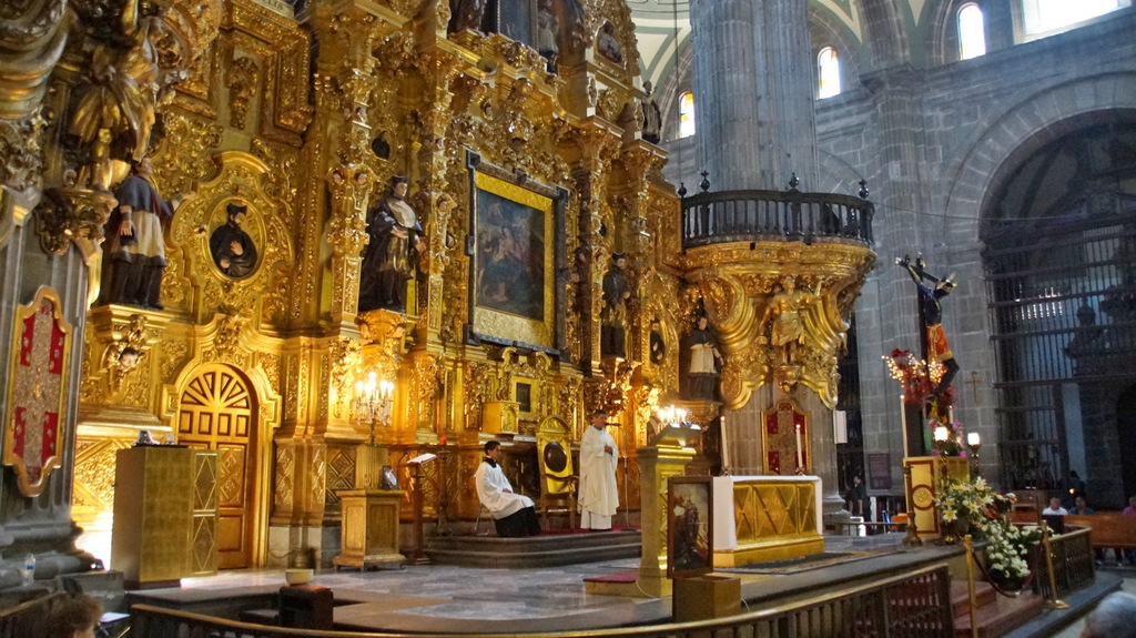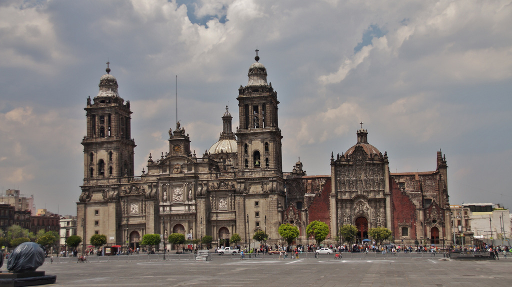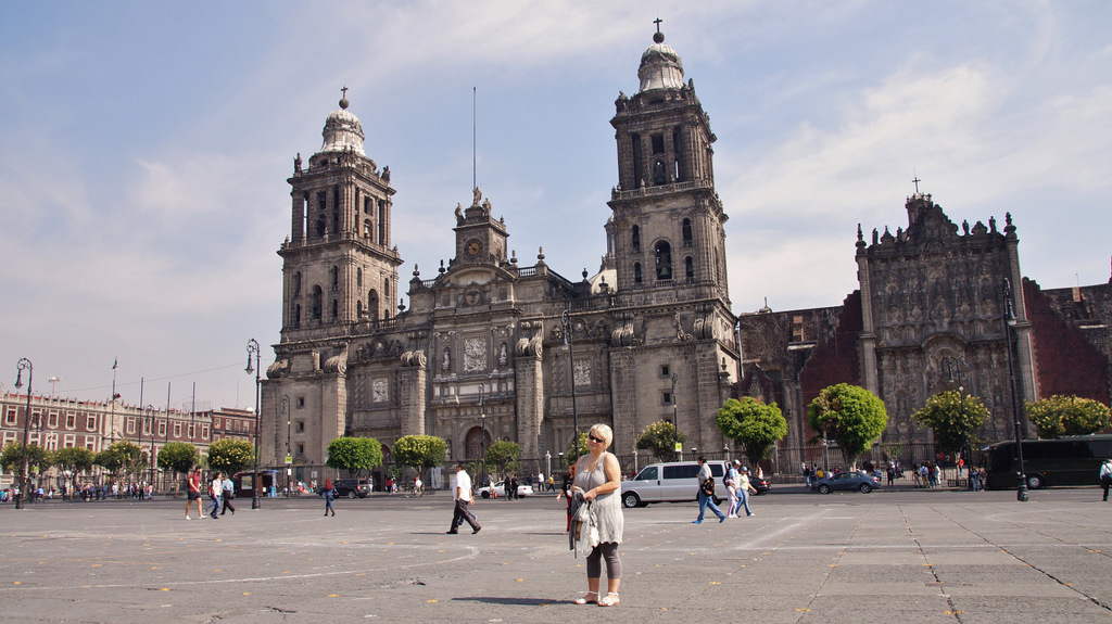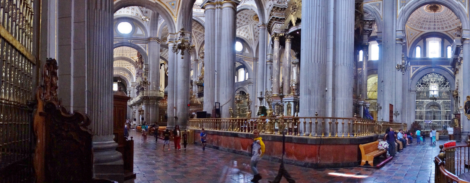 Auch heute starten wir gemeinsam mit Jenny in Richtung Innenstadt. Während Jenny an der Periferico aussteigt und zum TEC geht, fahren wir mit dem Microbus zur Metrostation General Anaya, wo wir in die Linea Azul, die blaue Linie, der Metro umsteigen. Diese bringt uns direkt ins Stadtzentrum zum Zocalo, wo wir aussteigen. Aus der Metro kommend stehen wir direkt vor der großen Kathedrale. Diese ist die größte auf dem amerikanischen Kontinent und wurde aus Steinen des benachbarten Aztekentempels, des Templo Mayor, erbaut. Aufgrund des instabilen Untergrundes sind viele, meist alte Gebäude, der Innenstadt schief. So sieht man auch den Türmen der Kathedrale an, dass sie nicht gerade aufragen. Dann besichtigen wir die Kathedrale und bestaunen die Größe und den Prunk. Im Hauptschiff finden wir hier auch ein riesiges Pendel, welches von einer Kuppel herunter hängt. Hier wird auf einer Marmorplatte direkt unter dem Pendel der Verlauf und die Entwicklung der Neigung und Senkung dokumentiert. Über die Jahrhunderte weicht das Pendel mehr als einen Meter ab. Nach der Besichtigung entschließen wir uns spontan mit dem Turibus (...ja, der heißt wirklich so) zu fahren. Für sehr preiswerte 140,- Pesos (ca. 8,50 EUR) kann man den ganzen Tag auf mehreren Linien durch die Stadt fahren. So fahren wir entlang des Paseo de la Reforma zuerst in Richtung Revolucion. Dann geht es weiter auf dem Paseo zum Angel de Independencia. Hier auf dem Paseo de la Reforma hat man nicht das Gefühl in Mexico zu sein, denn die riesigen modernen Glasfassaden und die großen Wolkenkratzer (z.B. Torre Mayor 228 m das höchste Gebäude Mexicos) vermitteln eher ein Manhattan-Feeling. Dann fahren wir an den weitläufigen Bosque Chapultepec vorbei und sehen auf einem Hügel schon das Schloss von Maximiliano, dem Habsburger-Kaiser von Mexico. Über das Auditorio fahren wir dann weiter durch die Zona Rosa zurück über La Reforma und zum Zocalo. Inzwischen ist es schon Nachmittag und die Wolken ziehen wieder auf. Vom Zocalo aus bummeln wir auf der Shopping-Meile der Stadt zur Torre Latinoamericana, dem 1956 fertiggestellten Bau, von dem man einen tollen Blick über die Stadt hat. Vorbei an Bellas Artes, dem imposanten Opernhaus, durchqueren wir Central Alameda, einen großflächigen Park und laufen dann weiter zum Revolutionsdenkmal. Hier sind wir heute Morgen bereits mit dem Bus vorbeigefahren und nutzen nun die Gelegenheit, es nochmals aus der Nähe zu bestaunen. Von der Station Revolucion aus fahren wir dann wieder mit der blauen Metrolinie in Richtung Süden. Nach einem kurzen Abstecher zum Walmart steigen wir dann wieder in den Microbus um. Da heute ein Spiel im nahe gelegenen Aztekenstadion stattfindet, ist der Füllstand der "prähistorischen" Microbusse heute noch intensiver. Nachdem wir einige der Busse ziehen lassen mussten gelingt es uns dann in einen vorzudringen. Die ersten Stationen stehe ich nur in der geöffneten Tür und der Rucksack hängt nach draußen auf die Straße - auch das ist eben Mexico. Da jetzt natürlich voller Berufsverkehr herrscht, steht der Bus mehr als dass er fährt. Nach fast zwei Stunden treffen wir dann endlich wieder in Tepépan ein. |
