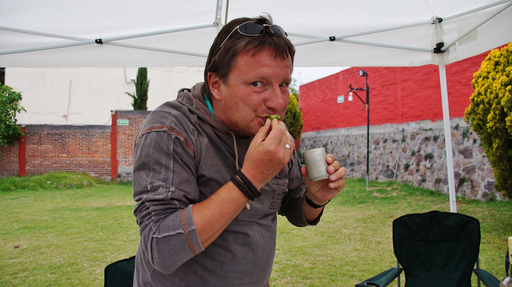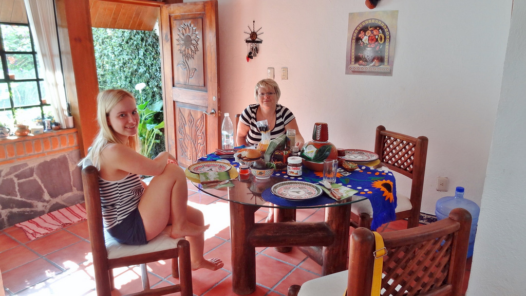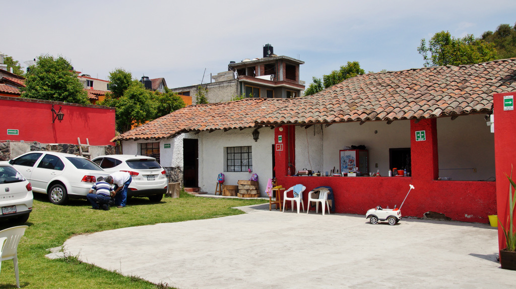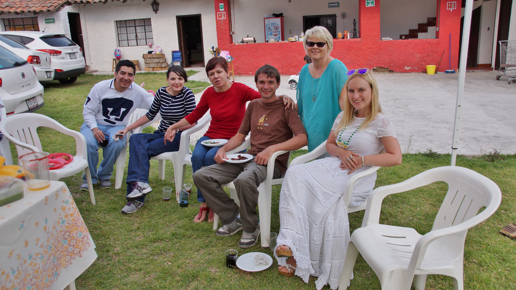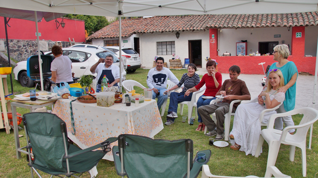 | Nachdem die letzten Tage schon recht anstrengend waren, schlafen wir heute mal paar Minuten länger. Gegen 10:30 brechen wir dann mit dem Auto in westliche Richtung auf. Wir sind heute bei Rafas Familie zum Ostergrillen eingeladen. Über die heute glücklicherweise staufreie Periferico fahren wir in Richtung Ocoyonacac. Das ist ein kleiner Ort in Richtung Toluca, wo viele Hauptstädter ien Wochenendhaus haben. Durch die Semana Santa (Osterwoche) zieht es natürlich auch viele genau dahin. Während wir in der Stadt staufrei durchkommen, erwischt es uns dann an der Abfahrt nach Ocoyonacac. Nachdem es kein Vorwärtskommen mehr gibt fahren wir wieder auf den Highway auf und nehmen die nächste Abfahrt. Nach 2 Stunden Fahrt treffen wir dann in Ocoyonacac und werden schon erwartet. Den Nachmittag verbringen wir dann in familiärer Atmosphäre. Hier liegen schon ein paar andere Dinge als bei uns auf dem Grill. Neben Chorizo-Würstchen und Kaktusblättern (...übrigens sehr lecker) gibt es sehr dünne Rindfleischstreifen. Das wickelt man dann in Tortillas ein, würzt das noch mit Habanero-Sauce, darüber noch Limette und Koriander. Als Dessert gibt es dann noch gegrillte Kochbanane. Zum Schluss darf ein Tequila natürlich nicht fehlen. Gegen 18:00 Uhr geht es dann wieder zurück. Am Abend packen wir dann schon wieder unsere Koffer, denn morgen geht es ja wieder los. | |