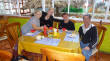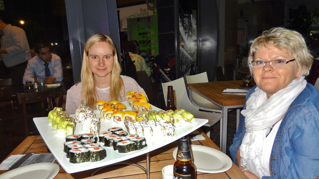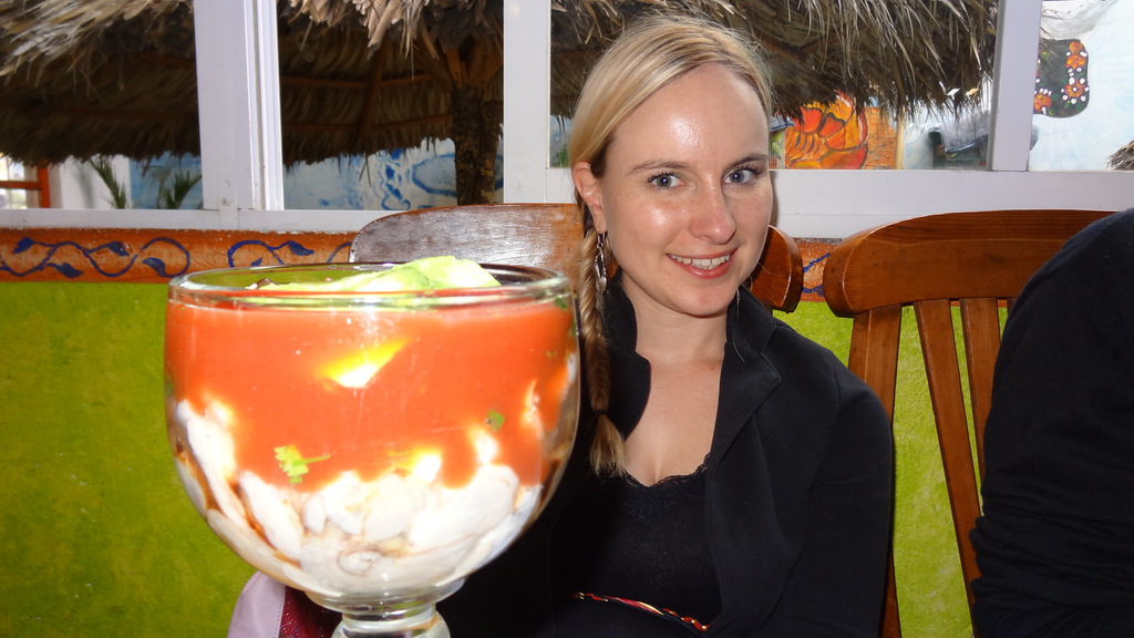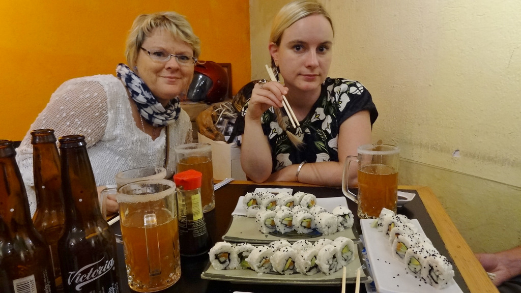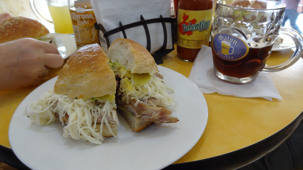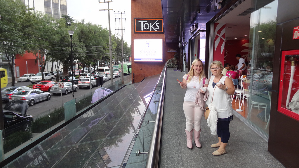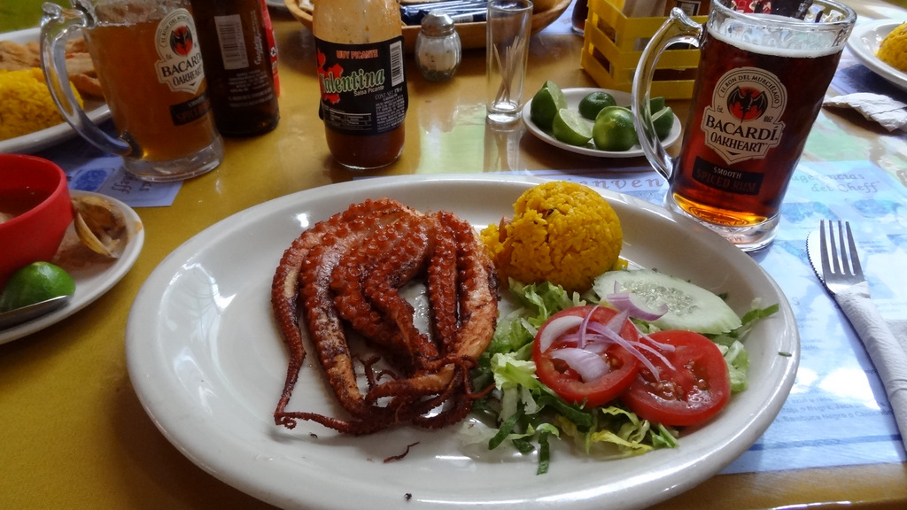 | Nach dem Frühstück starten wir gemeinsam mit Jenny. Mit dem Microbus fahren wir zusammen zu Jennys Universität, dem Tecnológico de Monterrey. Bevor wir dieses erreichen stehen wir mit unserem klapprigen Gefährt erst einmal im morgendlichen Stau. Dann erreichen wir das TEC und begleiten Jenny in ihren Unterricht. Das ist auch für uns sehr interessant, da gerade deutsche Geschichte auf dem Plan steht. Im späten Mittag ist dann Jennys Unterricht vorbei und Rafa holt uns mit dem Auto ab. Vom Süden Mexico-Citys fahren wir dann ins nördliche Zentrum in Richtung Aeropuerto. Auch auf dieser Fahrt stehen wir immer wieder im Stau, das ist hier in der Riesenstadt an der Tagesordnung. Dann treffen wir uns mit Rafas Papa in dessen Lieblingsrestaurant, dem "Mariscos Popocatépetl". Hier essen wir sehr leckere Gambas und Pulpo a la Parilla (gebratener Octopus). Dann geht es noch weiter zu Rafas Mama und seiner Schwester, eben ein "Familientag". Für den Rückweg nehmen wir dann die öffentlichen Verkehrsmittel. Zuerst in zwei verschiedenen Metro-Linien und anschließend noch ca. 30 Minuten mit dem Microbus. Es erübrigt sich zu sagen, dass natürlich auch heute Abend einiges los ist und wir insgesamt fast 90 Minuten brauchen, um wieder zurück nach Xochimilco zu gelangen. Kaum steigen wir aus öffnet der Himmel seine Schleusen und es beginnt recht heftig an zu regnen. | |