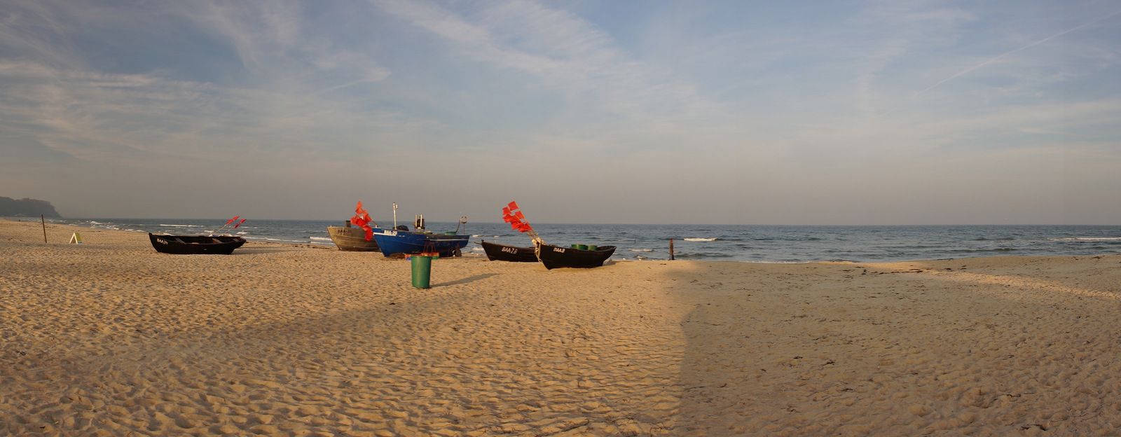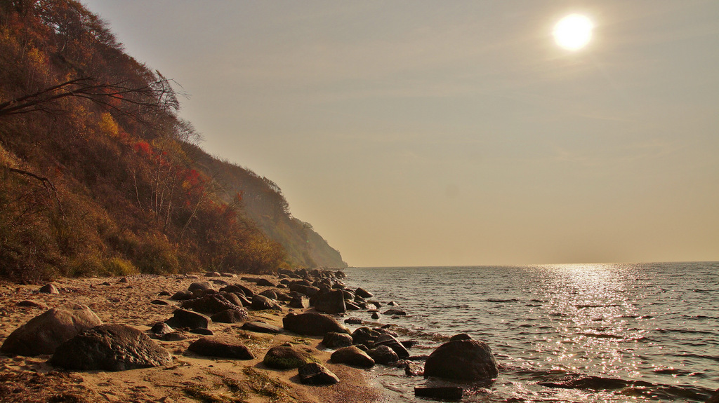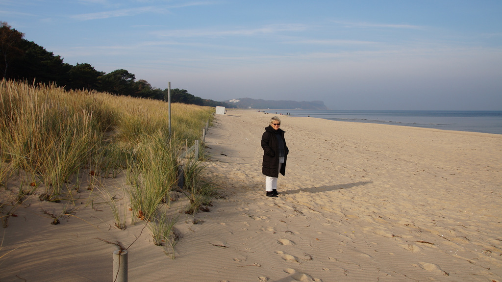 | Heute ist nun schon wieder Abreisetag. Als wir in aller Frühe aus dem Fenster schauen, sehen wir draußen einen glutroten Himmel. Das ganze Firmament ist in ein beeindruckendes Morgenrot gehüllt. In aller Ruhe frühstücken wir dann etwas später. Unsere sachen sind schnell gepackt und im Auto verstaut. Via Lobbe fahren wir dann hinüber ins Ostseebad Göhren. Oberhalb des neuen Steilaufzuges, der zwar heute eröffnen sollte aber wegen Wartungsarbeiten gesperrt ist, finden wir einen Parkplatz. Von hier führt uns der Treppenweg hinunter zur Küste. Hier bummeln wir von der Seebrücke aus am Strand entlang. Dabei genießen wir die Sonne und nutzen das schöne windstille Herbstwetter für einen ausgedehnten Strandspaziergang. Gegen 13:00 Uhr machen wir uns dann wieder auf die Rückfahrt. Wie immer haben wir uns hier sehr wohl gefühlt. Die Ruhe und Abgeschiedenheit dieser Ecke der Insel (...zumindest in der Nebensaison ist es sehr ruhig hier) hat uns auch dieses Mal wieder begeistert. | |