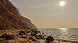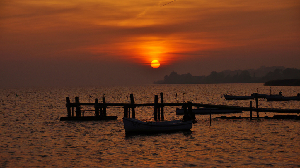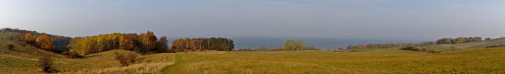 | Für heute sagt der Wetterbericht sonniges Wetter voraus. Als wir am Morgen den ersten Blick aus dem Fenster werfen, ist es draußen allerdings ziemlich trüb und neblig. Doch schon während des Frühstücks zeigen sich die ersten blauen Flecken am Himmel. Gegen 10:00 Uhr starten wir dann zu unserer Wanderung auf dem Zickerschen Höft. Von Gager geht es am Bodden entlang bis zum sog. Nonnenloch. An der Spitze des Höfts ist hier ein Treppenabstieg von der ca. 30 Meter hohen Steilküste hinunter zum Strand. Hier sind wir ganz allein und relaxen am naturbelassenen Strand und genießen die inzwischen präsente Sonne. Nach einer Wanderpause geht es dann weiter über die hügelige Landschaft hinüber nach Groß-Zicker. Wir bummeln durch den Ort und besichtigen die alte Backsteinkirche aus dem 14. Jahrhundert. Unweit der kleinen Kirche zweigt der Weg hinauf zum Aussichtspunkt Bakenberg. Der Weg schlängelt sich über Wiesen und durch Kiefernwälder und schon kurze Zeit später erreichen wir den höchsten Punkt, den Bakenberg. Von hier hat man einen tollen Blick über den Greifswalder Bodden. Dann wandern wir hinunter nach Gager und machen einen kurzen Zwischenstopp in unserer Unterkunft, welche direkt am Hafen von Gager liegt. Kurze Zeit später brechen wir wieder auf und fahren die wenigen Kilometer nach Thiessow, wo wir den dortigen langen Strand erkunden. Nach unserem ausgedehnten Strandbummel fahren wir weiter nach Baabe, wo wir ebenfalls das inzwischen schöne Wetter nutzen, um am Strand entlang zu bummeln. Dann geht es zurück in Richtung Gager. Bevor es zurück geht, biegen wir in Mittelhagen nach Alt Reddevitz ab, um im Restaurant "Am Wasser" sehr gut zu Abend zu essen. Als wir das Lokal verlassen kommen wir gerade pünktlich zum Sonnenuntergang, welcher recht farbenfroh ausfällt. | |