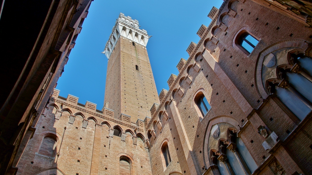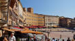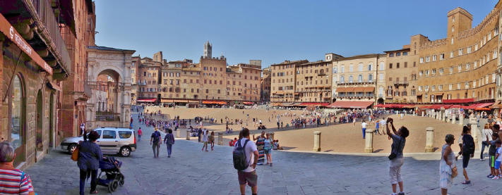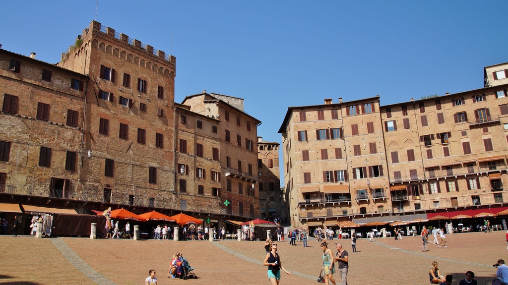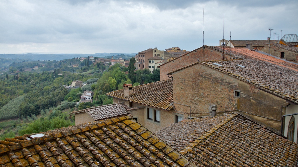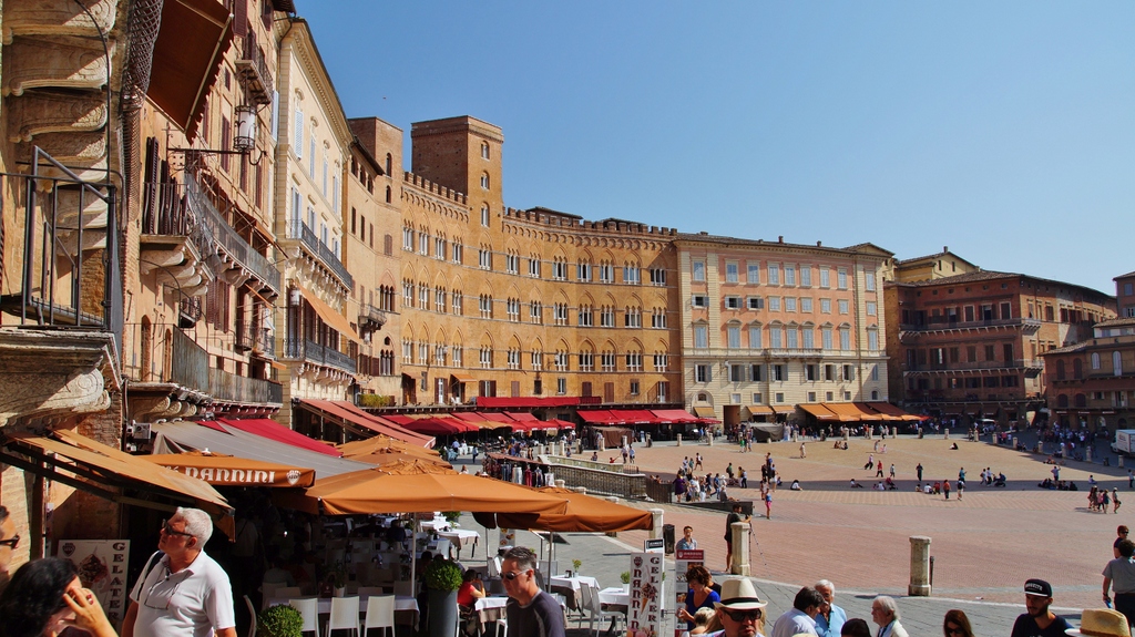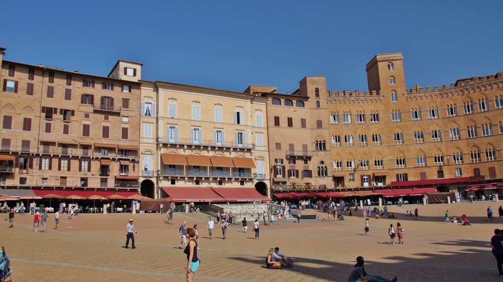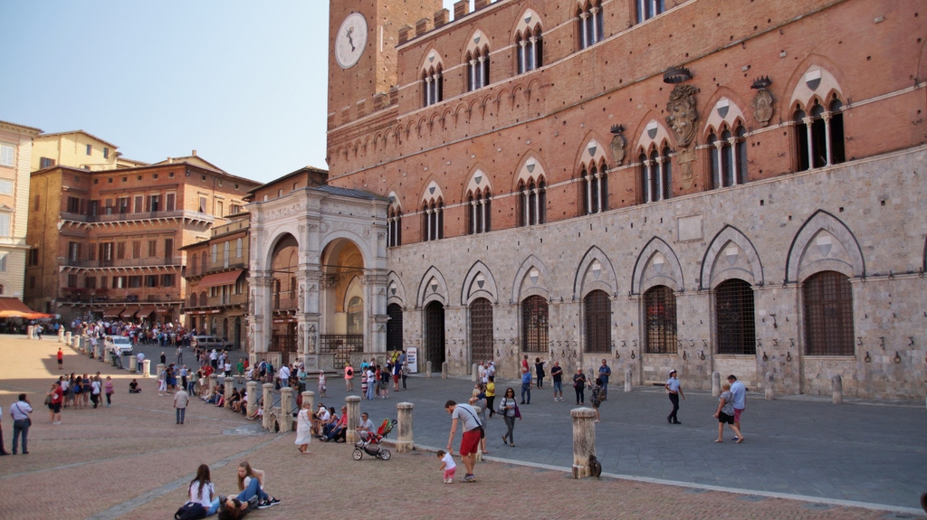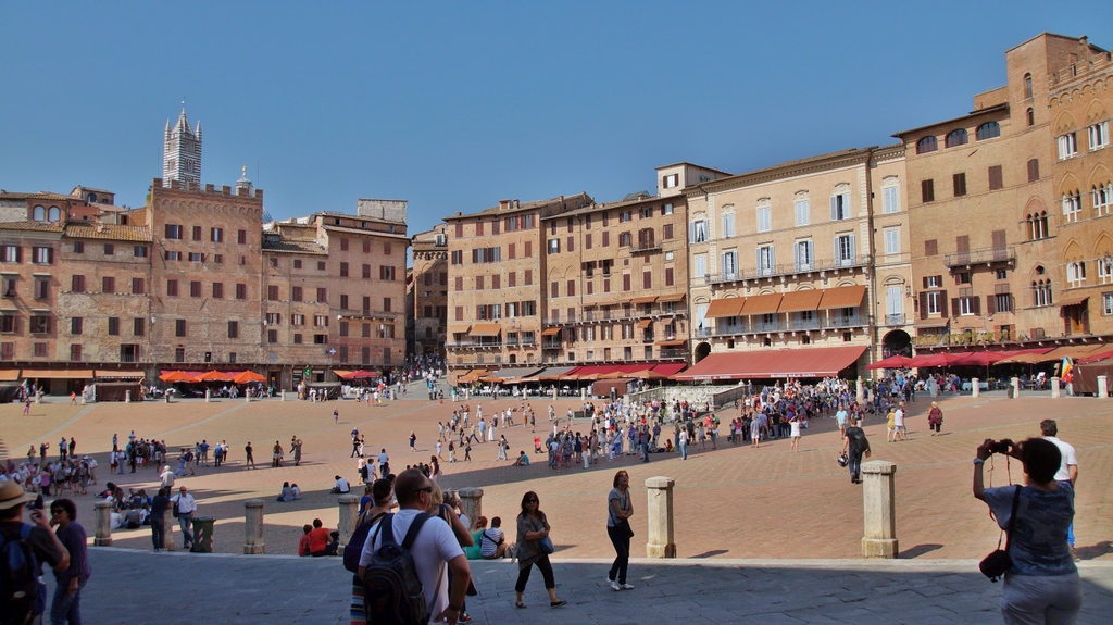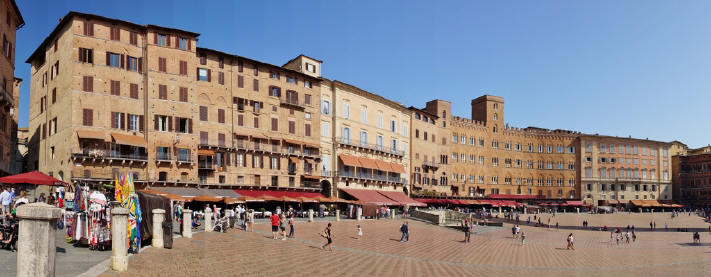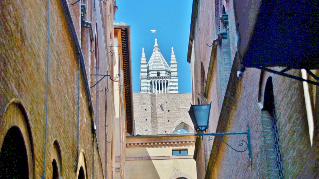| Heute beginnen wir den Tag wieder mit einem Bad im Pool. Nach dem sich anschließenden Frühstück starten wir zu unserer heutigen Tour, welche uns nach Siena führt. Dahin fahren wir über Colle Val D`Elsa auf die Autostrada nach Siena. An der Abfahrt Siena-Ovest biegen wir ab und finden im Parkhaus St. Catarina-Fondobranda einen Parkplatz in Nähe des Centro Storico. Über Rolltreppen gelangen wir hinauf zur Altstadt. Zuerst besuchen wir wie immer den Hauptplatz - den markanten Il Campo. Hinter den ziegelroten Fassaden schlendern wir dann mit den vielen anderen Tagesgästen weiter hinüber zum Duomo, welcher uns immer wieder begeistert. Der "Zuckerbäckerstil" kombiniert mit der schwarz-weiß-gestreiften Fassade, welche teilweise maurische Elemente hat, ist wirklich einzigartig. Dann geht's zurück zum Auto und wir fahren auf der Autostrada Siena-Firenze, welche in einem erbärmlichen Zustand ist, weiter nach Monteriggioni. Der kleine Ort mit seiner Festungsanlage gehört zu unserem Standard-Toskana-Programm. Nach einer Runde innerhalb der Stadtmauer fahren wir weiter nach Volterra. Hier finden wir im Parkhaus unweit der Piazza dei Priori eine Abstellmöglichkeit für den MINI. Auch hier ist man nicht alleine unterwegs doch im Vergleich zu Siena und vor allem Florenz ist es sehr angenehm, durch die engen Gassen zu schlendern. Als wir auf die Piazza zurückkehren hören wir schon den Gewitterdonner aus der Ferne. Schnell kaufen wir noch ein paar Dinge zum Abendessen ein und kaum sind wir am Auto zurück, fängt das Gewitter an. Im Gewitterregen fahren wir dann zurück zur Casa Vaiano, wo wir unter unserem Terrassendach das Ende des Regens abwarten. Dann geht der Grill in Aktion und wir verbringen den Rest des Abends auf der Terrasse im goldenen Licht des Sonnenunterganges. | ||
