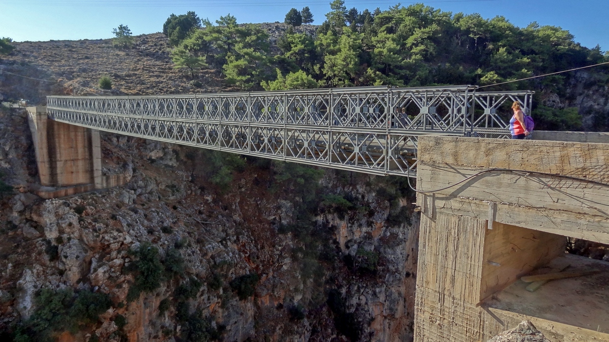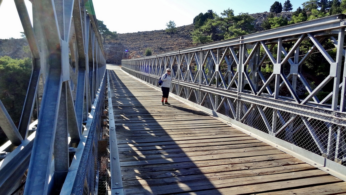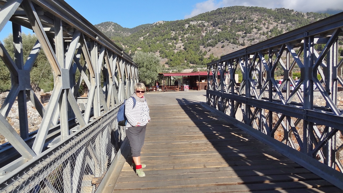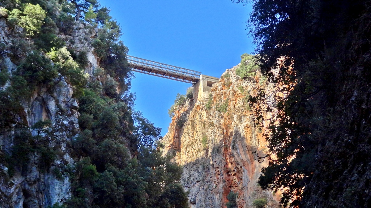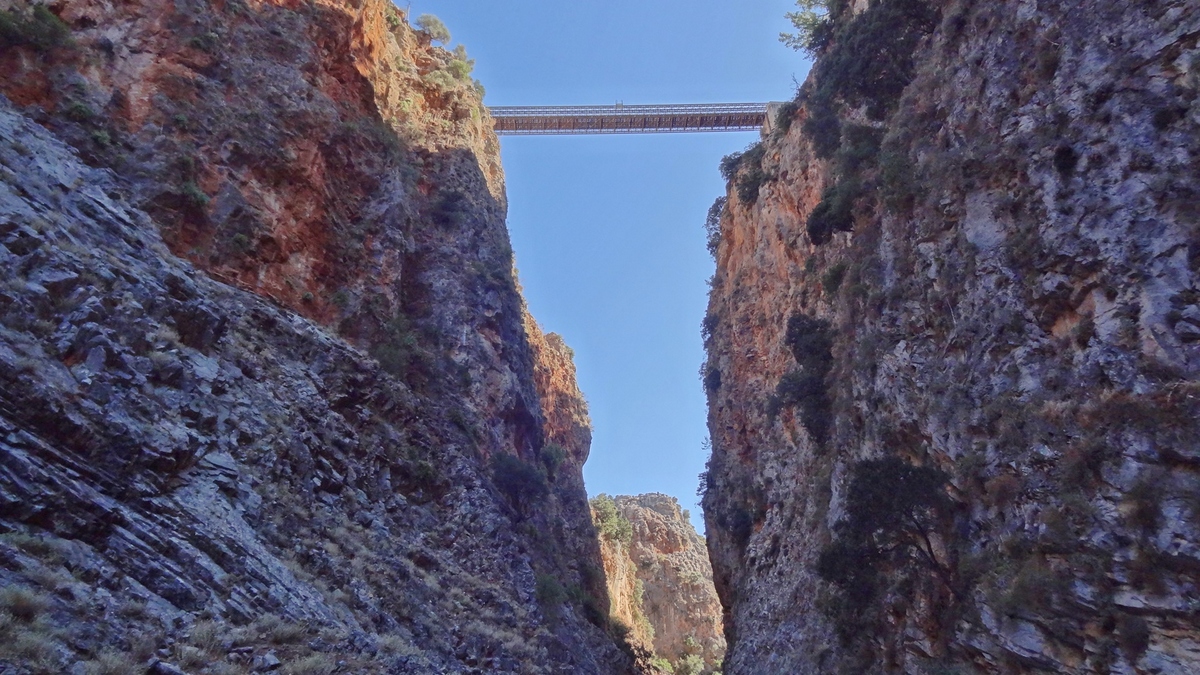 | Heute klingelt der Wecker mal wieder sehr zeitig. Um 06:15 Uhr müssen wir aufstehen und so sind wir auch die Ersten beim Frühstück, welches heute recht kurz ausfällt. Dann machen wir uns wie gestern auf den Weg hinüber nach Chora Sfakion. Dort parken wir das Auto und nehmen den einzigen Bus, der um 09:00 Uhr hinauf nach Arádena fährt. Mit uns fahren noch ein paar Wanderer die Serpentinenstrecke hinauf in die Berge. Nachdem wir das Bergdorf Anópoli passiert haben erreichen wir kurz dahinter unseren heutigen Ausgangspunkt - die Arádena-Bridge. Der Bus passt gerade so über die Brückenkonstruktion und die Holzbohlen der Fahrbahn klappern dabei ziemlich laut. Nach einen ersten Blick von der imposanten Brücke hinunter in die Schlucht, biegen wir dann hinter der kleinen Taverne in einen Weg ein, welcher uns in einigen Serpentinen hinunter in den Schluchtgrund bringt. Kurze Zeit später passieren wir die Brücke, welche inzwischen viele Meter über uns liegt. Der Weg führt durch die enge Schlucht und an beiden Seiten ragen die Felswände auf. Immer wieder müssen wir kleine und größere Felsen überklettern. Der Weg ist jederzeit gut mit rot-grünen Farbmarkierungen gekennzeichnet, so dass an Kletterstellen diese uns den besten Weg aufzeigen. An einigen Stellen müssen wir die Hände zu Hilfe nehmen und die Engstellen mit leichter Kletterei überwinden. An einigen Stellen lassen wir uns einfach über die glatt geschliffenen Felsen hinunterrutschen. An einigen Stellen der Schlucht erinnert uns das Gelände an die untere Caldera de Taburiente auf der Kanareninsel La Palma. Dann erreichen wir das Ende der Schlucht am sog. Marmara-Beach. Der Strand ist wie aus dem Bilderbuch und wie der Name schon sagt, badet man hier eingerahmt von Marmorfelsen im glockenklaren türkisblauen Wasser. Trotzdem ist es nicht unser Strand, da die kleine Bucht völlig mit Liegen und Sonnenschirmen zugepflastert ist, um die Touristen, welche mit dem Taxiboot aus Loutro oder Chora Sfakion ankommen, anzulocken. Bevor wir weiter in Richtung Loutro wandern, müssen wir trotz der vielen Liegen die Gelegenheit zu einem Bad im Mittelmeer nutzen. Der Weiterweg ist leider wenig spektakulär und stellt auch einige Anforderungen. Schwindelfrei muss man auf der Passage nach Loutro unbedingt sein, denn der Weg führt über Klippen und enthält viele steinige Passagen. Dann erreichen wir Loutro und chillen bis zum Ablegen der Fähre bei einem kühlen Bier und einem Glas Wein. Wie gestern fahren wir mit der Fähre zurück nach Chora Sfakion, wo wir gegen 16:30 Uhr eintreffen. Dann fahren wir zurück nach Plakias und machen unterwegs noch einen kurzen Abstecher nach Frangokastello. In Sellia biegen wir dann in die enge Straße ein, welche hinunter nach Plakias führt. Bevor wir nach Plakias zurückfahren, biegen wir am neuen Hafen noch nach Westen zum Souda-Beach ab. Zurück in Plakias machen wir vor der Rückkehr ins Hotel noch schnell unser Programm für Donnerstag klar, wo wir endlich die Samaria-Schlucht durchwandern wollen. | |