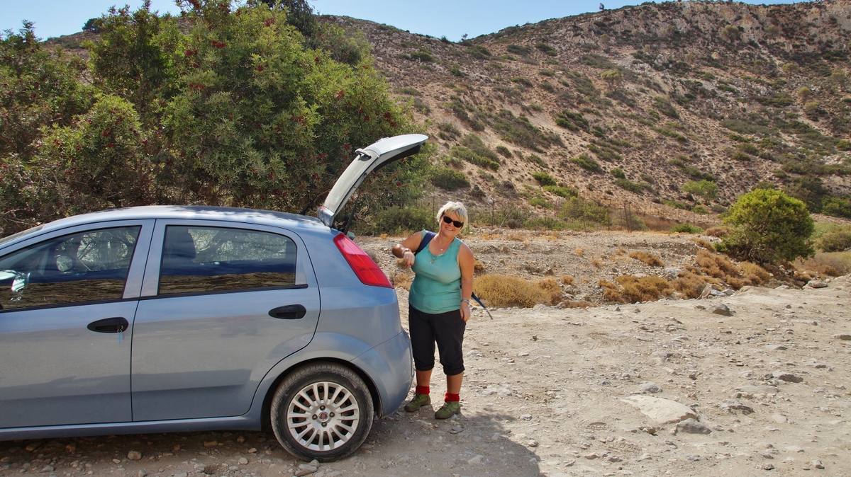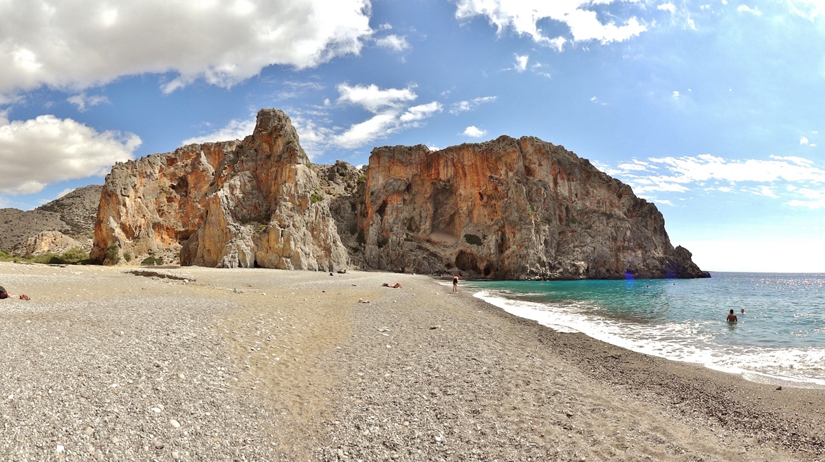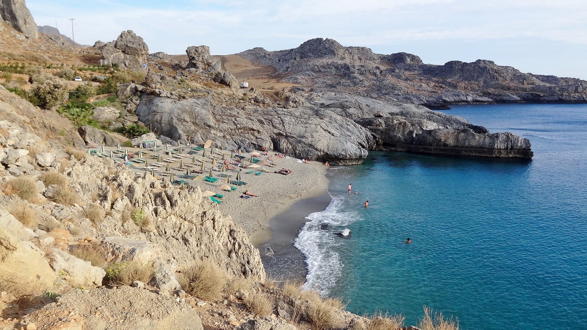 | Nachdem wir bereits gestern nach Nürnberg angereist sind und im Mövenpick Hotel direkt am Flughafen übernachtet haben, ist es nur ein Katzensprung zum CheckIn. Pünktlich um 04:20 Uhr startet unser Flieger in Richtung Heraklion, wo wir überpünktlich landen. Hier werden wir von dicken Wolken empfangen. Nach der Mietwagenübernahme fahren wir dann via Rethymnon nach Plakias, wo wir im Alianthos Garden unser Quartier haben. Kurz vor Plakias passieren wir die imposante Kourtaliotis-Schlucht mit ihren steilen Felswänden. Inzwischen hat sich der Regen verzogen und die Sonne strahlt vom fast wolkenlosen Himmel. In Plakias angekommen beziehen wir nur schnell unser Zimmer und machen uns dann gleich auf einen ersten Bummel durch den Ort Plakias. Dann fahren wir nur ein paar Kilometer weiter nach Damnoni, wo wir erst einmal in der Taverne "Mesogeios" den ersten leckeren Souvlaki essen. Kurz hinter Damnoni finden wir dann am Ammoudaki-Beach* einen tollen Badeplatz, wo wir den Nachmittag verbringen. | |