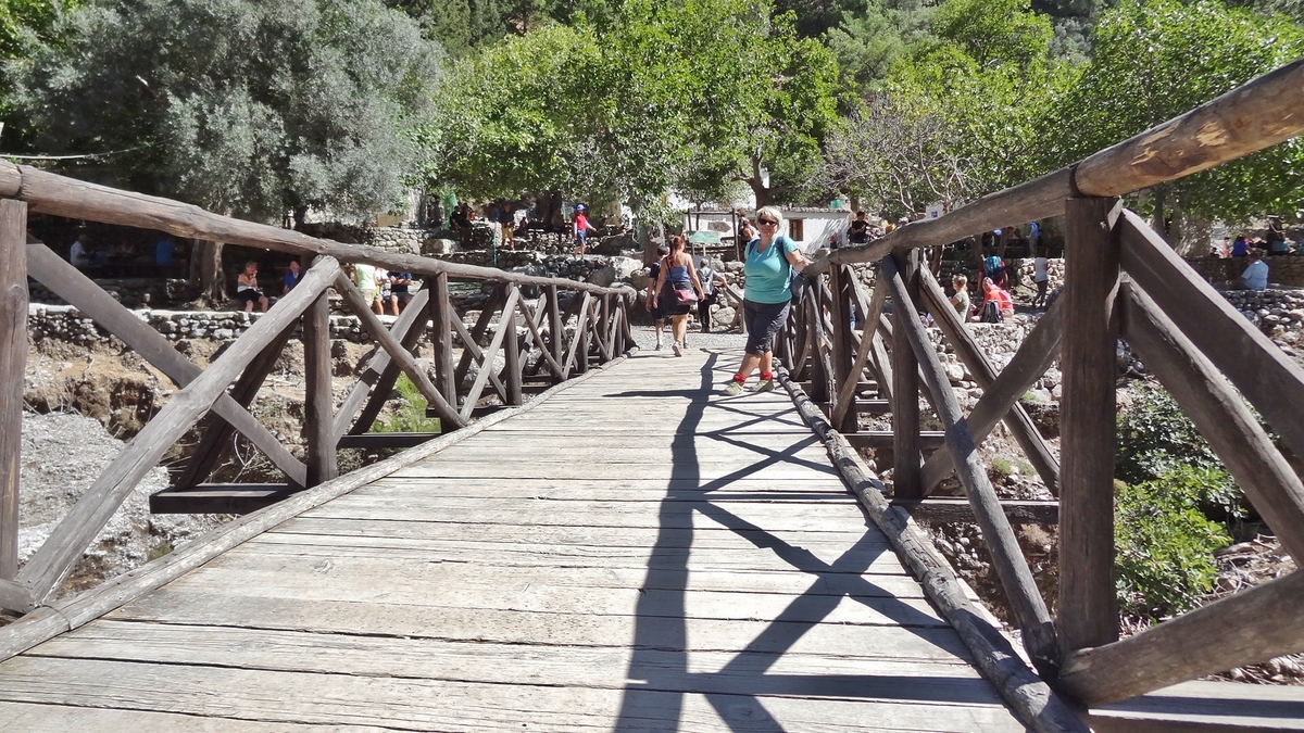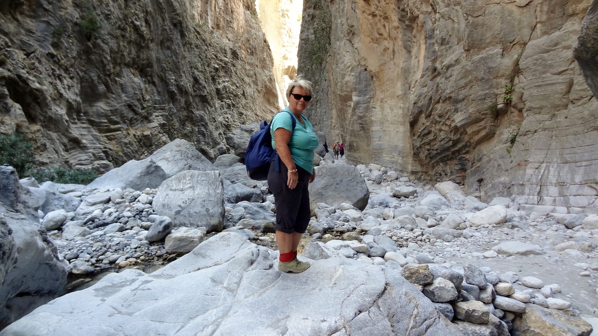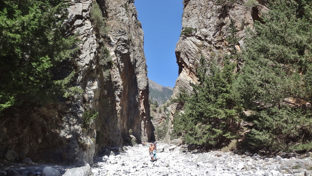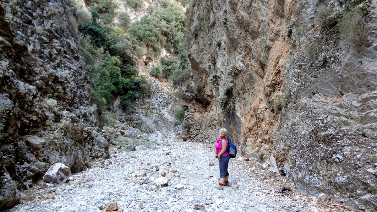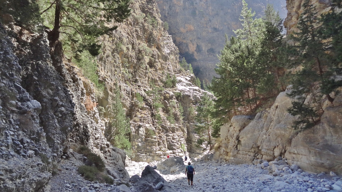 | Zu unchristlicher Uhrzeit um 05:00 Uhr klingelt unser Wecker. Leider muss es so früh sein, da heute es strammes Tagesprogramm auf uns wartet. Nach einem kurzen Frühstück werden wir um 06:00 Uhr vor unserer Unterkunft abgeholt. Unser heutiges Ziel haben wir schon lange im Visier - die Samaria-Schlucht. Um zum Ausgangspunkt der Tour bei Omalos zu gelangen, fahren wir 02:45 h. Bevor es in die Schlucht hinunter geht, machen wir noch eine kurze Pause in einer Taverne zum Frühstück. Am Eingang bei Omalos starten wir die Xyloskalo (griech. für hölzerne Treppe) hinunter, welche sich aber aktuell als steingepflasterter Weg erweist. Leider ist man in dieser grandiosen Natur nicht allein und gerade am Start reihen sich die Wanderer wie Perlen auf einer Kette auf. Leider sind neben wirklichen Wanderfreunden auch eine Vielzahl von speziellen Wanderern unterwegs, die man an ihrem AI-Bändchen, der Louis Vuitton-Tasche und Flip Flops erkennt. Zuerst führt der Weg recht steil bergab, um dann moderater abwärts zu führen. Verlaufen kann man sich praktisch nicht, da es nur den einen Weg gibt, wo man wie schon erwähnt, gut in Gesellschaft ist. Im oberen Bereich führt der Weg durch lichten Kiefernwald und die Szenerie erinnert uns schon sehr an die Caldera de Taburiente auf der Kanareninsel La Palma. Um pünktlich an der Fähre in Agia Roumeli zu sein, muss man ca. 13:30 Uhr den verlassenen Weiler Samaria verlassen haben. Nach Samaria steigt man in die eigentliche Schlucht ein. Die Wände werden immer enger und das Flussbett wird unser Weg. Dann erreichen wir am Ende die markante Engstelle - die eiserne Pforte - wo die Breite der Schlucht nur drei Meter beträgt. Kurze Zeit später erreicht man dann den südlichen Check Point. Von hier ist es auf einer benonierten Piste nur noch ein kurzes Stück nach Agia Roumeli, wo die Fähre nach Chora Sfakion schon auf uns wartet. Bevor es auf die Fähre geht, nutzen wir die Gelegenheit für ein erfrischendes Bad im Meer. Anschließend muss es nach dem langen Weg natürlich noch ein kühles Bier in der Taverne "Paralia" sein. Dann geht es auf das Fährboot, welches uns via Loutro nach Chora Sfakion bringt, wo bereits der Bus auf uns wartet. Der Bus fährt in ambitionierter Weise durch die kleinen und engen Bergdörfer zurück nach Plakias. Besonders eng wird es in Sellia, wo ein Auto erst von mehreren Einwohnern zur Seite getragen wird, bevor sich der Bus durch die engen Gassen weiter vorarbeiten kann. Dann erreichen wir endlich Plakias und nach einer Dusche kommen wir noch zu unserem verdienten Abendessen. | |