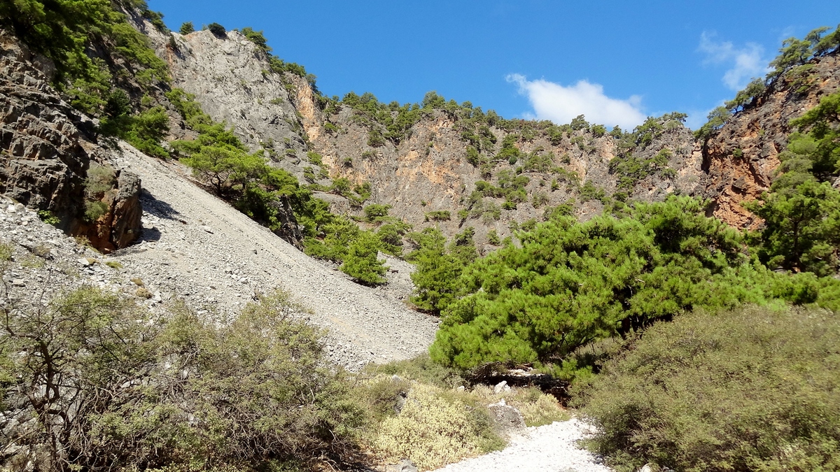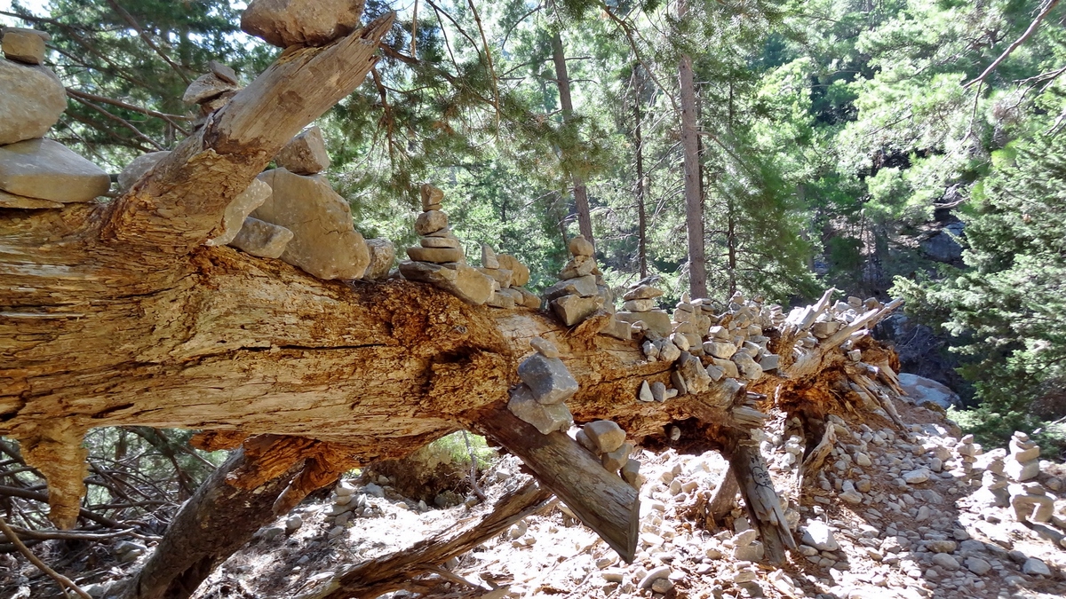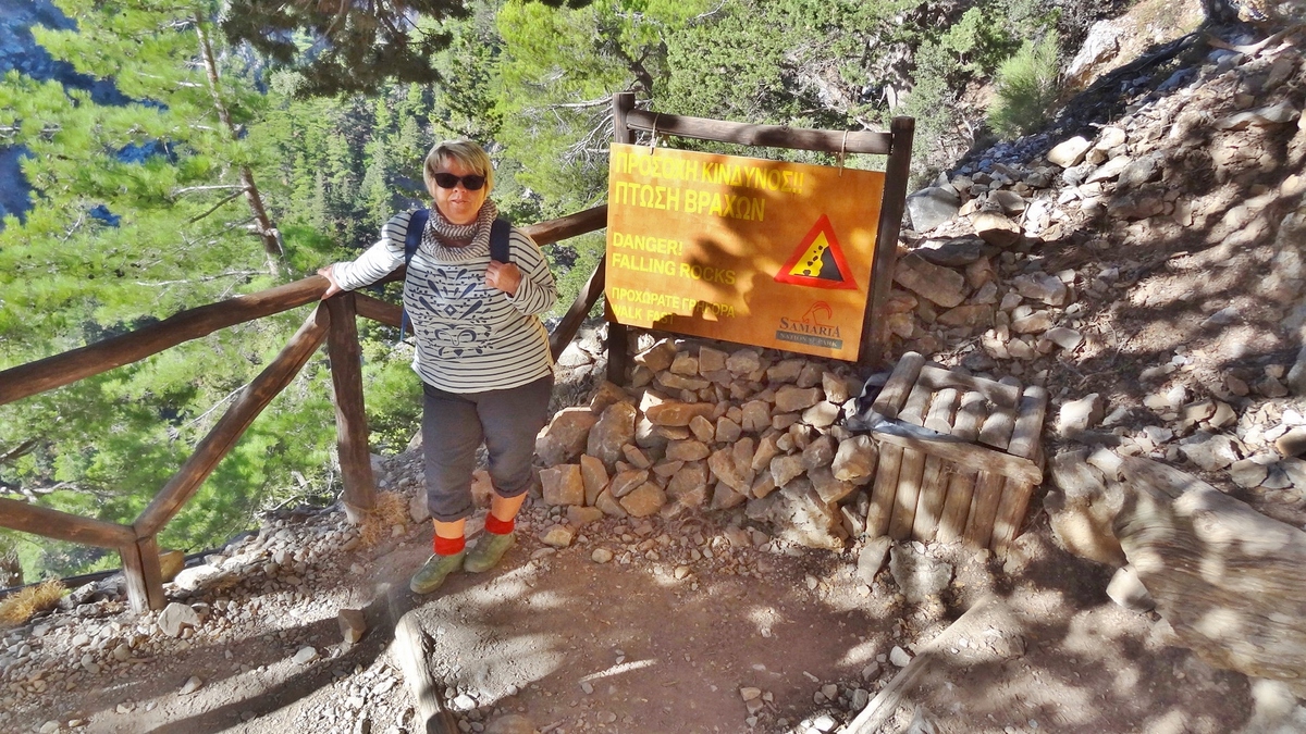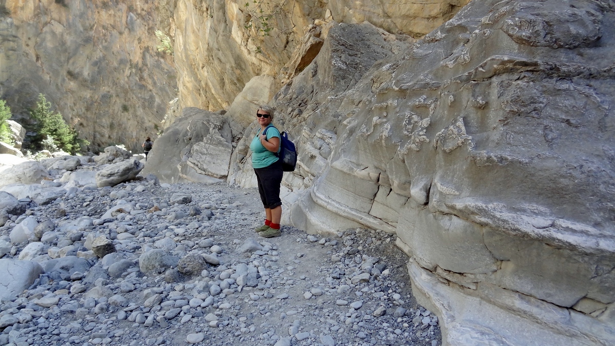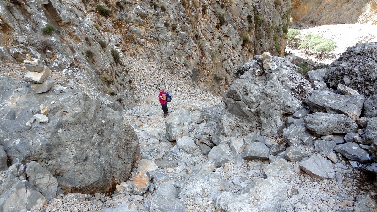 | Zu unchristlicher Uhrzeit um 05:00 Uhr klingelt unser Wecker. Leider muss es so früh sein, da heute es strammes Tagesprogramm auf uns wartet. Nach einem kurzen Frühstück werden wir um 06:00 Uhr vor unserer Unterkunft abgeholt. Unser heutiges Ziel haben wir schon lange im Visier - die Samaria-Schlucht. Um zum Ausgangspunkt der Tour bei Omalos zu gelangen, fahren wir 02:45 h. Bevor es in die Schlucht hinunter geht, machen wir noch eine kurze Pause in einer Taverne zum Frühstück. Am Eingang bei Omalos starten wir die Xyloskalo (griech. für hölzerne Treppe) hinunter, welche sich aber aktuell als steingepflasterter Weg erweist. Leider ist man in dieser grandiosen Natur nicht allein und gerade am Start reihen sich die Wanderer wie Perlen auf einer Kette auf. Leider sind neben wirklichen Wanderfreunden auch eine Vielzahl von speziellen Wanderern unterwegs, die man an ihrem AI-Bändchen, der Louis Vuitton-Tasche und Flip Flops erkennt. Zuerst führt der Weg recht steil bergab, um dann moderater abwärts zu führen. Verlaufen kann man sich praktisch nicht, da es nur den einen Weg gibt, wo man wie schon erwähnt, gut in Gesellschaft ist. Im oberen Bereich führt der Weg durch lichten Kiefernwald und die Szenerie erinnert uns schon sehr an die Caldera de Taburiente auf der Kanareninsel La Palma. Um pünktlich an der Fähre in Agia Roumeli zu sein, muss man ca. 13:30 Uhr den verlassenen Weiler Samaria verlassen haben. Nach Samaria steigt man in die eigentliche Schlucht ein. Die Wände werden immer enger und das Flussbett wird unser Weg. Dann erreichen wir am Ende die markante Engstelle - die eiserne Pforte - wo die Breite der Schlucht nur drei Meter beträgt. Kurze Zeit später erreicht man dann den südlichen Check Point. Von hier ist es auf einer benonierten Piste nur noch ein kurzes Stück nach Agia Roumeli, wo die Fähre nach Chora Sfakion schon auf uns wartet. Bevor es auf die Fähre geht, nutzen wir die Gelegenheit für ein erfrischendes Bad im Meer. Anschließend muss es nach dem langen Weg natürlich noch ein kühles Bier in der Taverne "Paralia" sein. Dann geht es auf das Fährboot, welches uns via Loutro nach Chora Sfakion bringt, wo bereits der Bus auf uns wartet. Der Bus fährt in ambitionierter Weise durch die kleinen und engen Bergdörfer zurück nach Plakias. Besonders eng wird es in Sellia, wo ein Auto erst von mehreren Einwohnern zur Seite getragen wird, bevor sich der Bus durch die engen Gassen weiter vorarbeiten kann. Dann erreichen wir endlich Plakias und nach einer Dusche kommen wir noch zu unserem verdienten Abendessen. | |