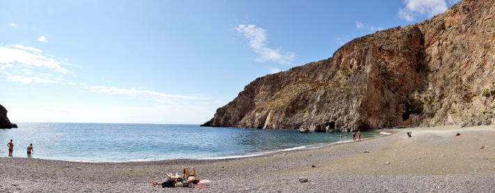 | Nach einem reichhaltigen griechischen Frühstück starten wir mit unserem Mietwagen in Richtung Osten. Quer durch den Süden der Insel Kreta führt uns der Weg. Nachdem wir durch die Kourtaliotis-Schlucht gefahren sind, biegen wir hinter Koxare in Richtung Spili ab. Hierher werden wir hoffentlich nochmal zurück kommen, denn Spili sieht wirklich sehenswert aus und den Löwenbrunnen wollen wir uns auch genauer anschauen. Heute allerdings zieht es uns erst einmal zum Startpunkt unserer Wanderung. Nachdem wir Agia Galini und Sivas passiert haben biegen wir dann hinter Listaros in eine inzwischen asphaltierte Straße zum Monastiri Odigitrias ein. Unmittelbar nach dem kleinen Kloster wird die Straße dann zu einer sehr rustikalen Piste. Nach ca. 3 Kilometern erreichen wir einen kleinen Parkplatz, wo schon einige Mietwagen parken. Alternativ fahren wir noch ein paar hundert Meter weiter in die Schlucht hinunter. Aber die Piste wird immer ruppiger, so dass wir kaum noch voran kommen. Viele andere Autos haben hier ebenfalls die Fahrt beendet und so entschließen wir uns auch, den Mietwagen hier abzustellen und den Rest der Strecke per Pedes zurückzulegen. Wir wandern durch die landschaftlich reizvolle Agiofarango-Schlucht (...hier gibt es viele verschiedene Schreibweisen wie z.B. Agiofarago, Agioferragio, Agiofaraggo usw.) bis zum Canyon Parking (...einige wenige Autos haben es bis hierher geschafft) mit dem letzten Kiosk vor Afrika (bis zur afrikanischen Küste sind es nur 177 Meilen). Nach dem kleinen Kiosk beginnt die eigentliche Schluchtentour durch einen tollen Canyon mit teilweise steil aufragenden Wänden. Hier trifft man auch viele Kletterer, welche die Felswände erklettern. Dann erreichen wir eine kleine Kapelle mit einem Brunnen. Nur kurze Zeit später stehen wir dann am Agiofarango-Beach, wo wir eine längere Pause einlegen. Vor einer imposanten Felskulisse springen wir ins angenehm warme Mittelmeer. Nach dem Badestopp geht es dann auf dem gleichen Weg wieder zurück zum Auto. Nachdem wir die teilweise extreme Piste bewältigt haben, machen wir am Monastiri Odigitrias noch einen kurzen Stopp. Nach einer Besichtigung des Klosters fahren wir dann weiter nach Matala. Am Ortseingang stehen schon unzählige Mietwagen und nachdem die Parkplatzsuche sich hier als schwierig erweist und wir eh keinen "Rummel" mögen, fahren wir gleich weiter zum nahen Kommos-Beach*. Auch hier ist es nicht mehr so ruhig wie bei unserem letzten Besuch hier vor 12 Jahren, doch westlich des kleinen Strandkiosk finden wir eine schöne Badestelle, wo wir das herrlich warme Wasser bei Sonnenschein pur genießen. Nach dieser längeren Badepause fahren wir dann auf der gleichen Strecke wieder zurück nach Plakias. Hier warte schon ein leckeres griechisches Buffet auf uns. Bei einem Ouzo und einem Glas Rotwein lassen wir dann den erlebnisreichen Tag auf unserem Balkon ausklingen. | |