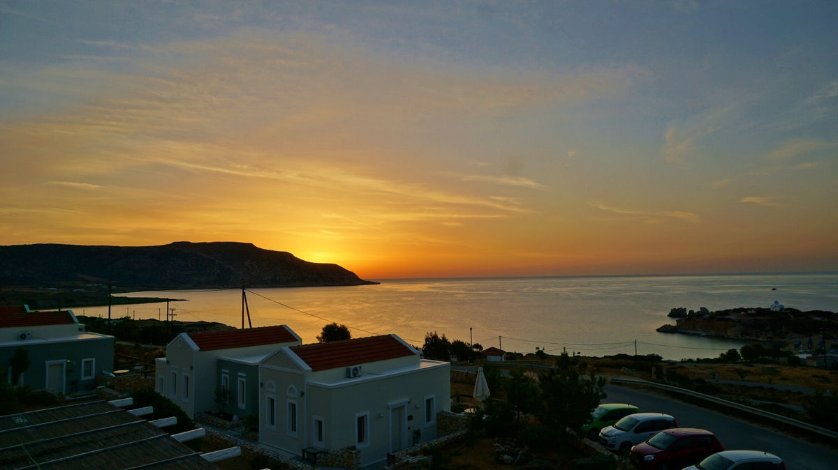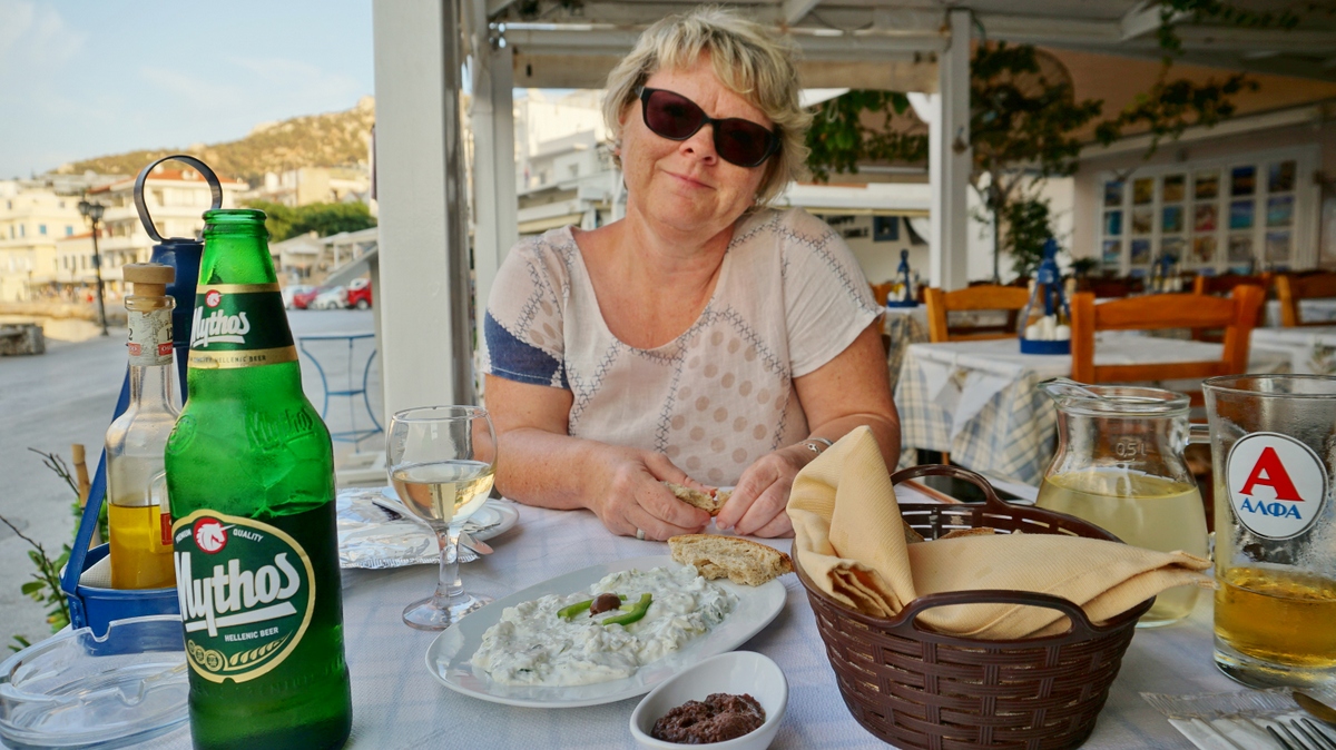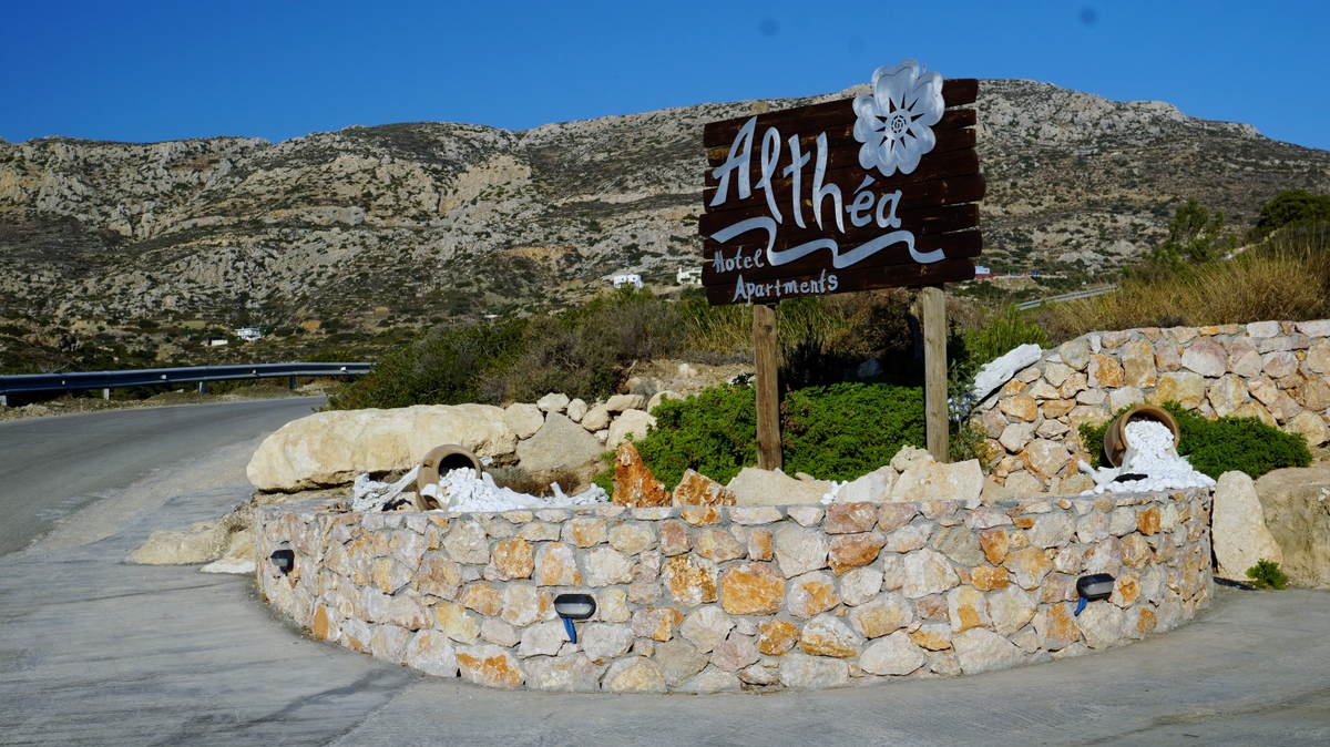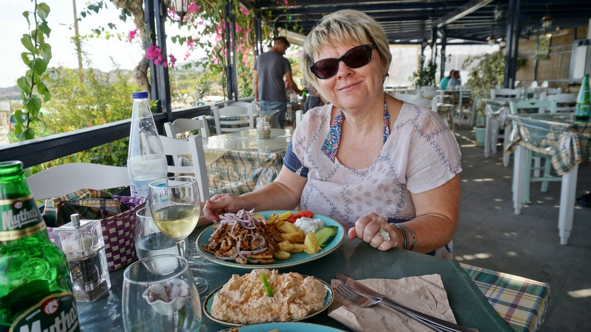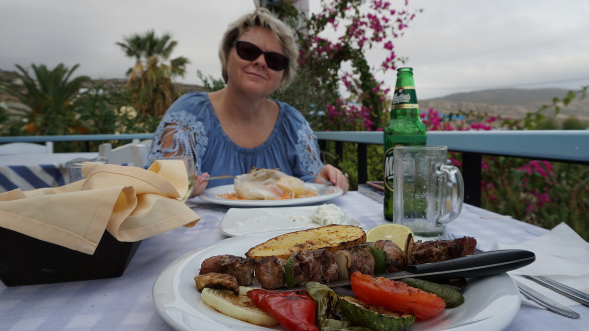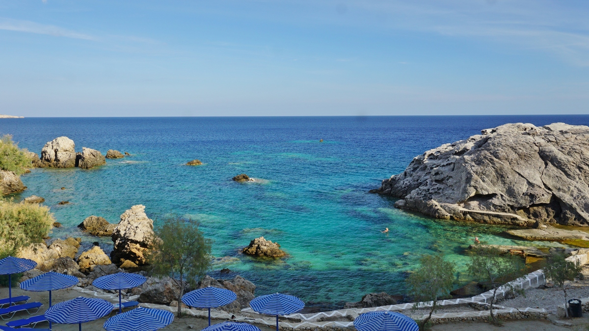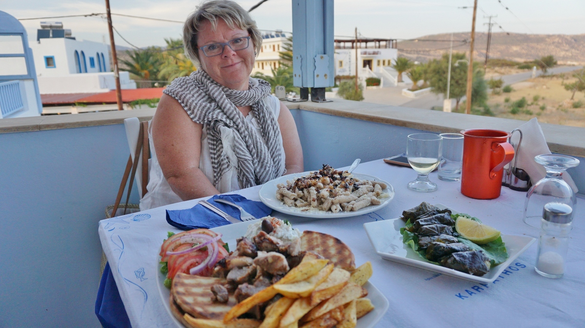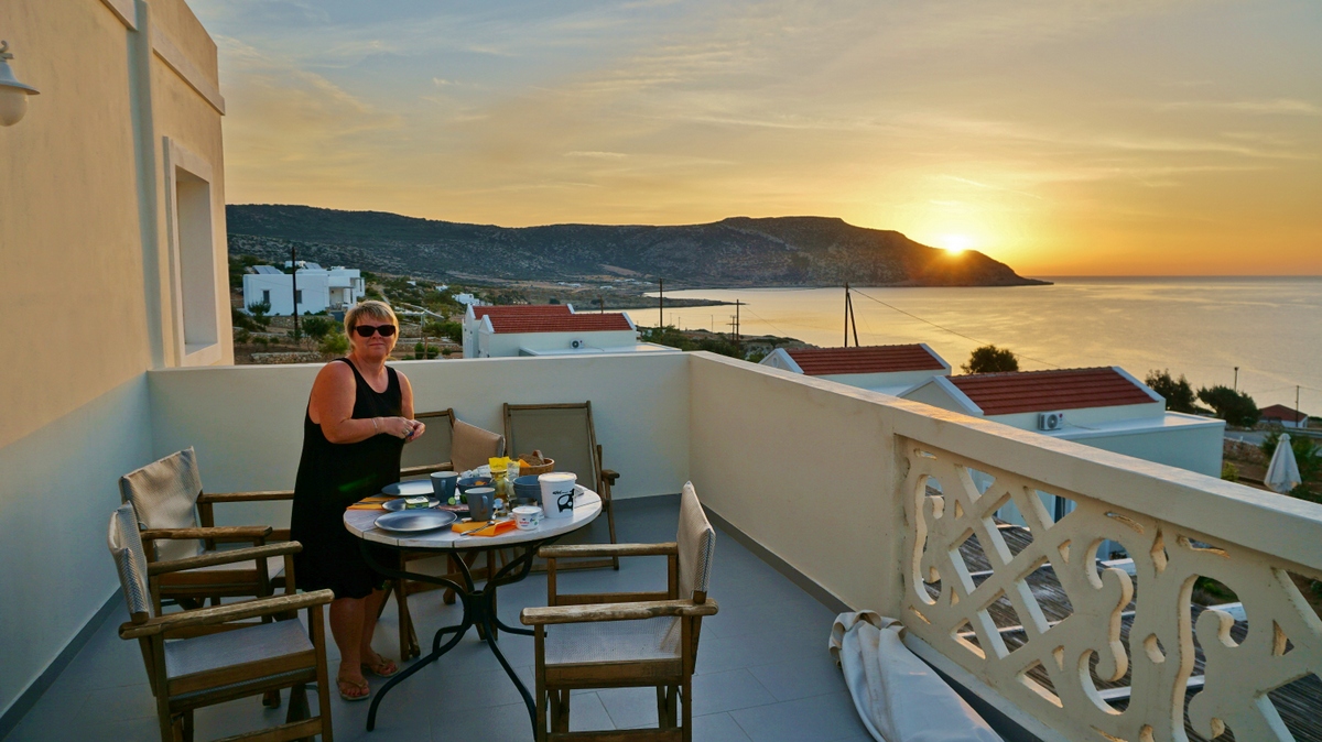 | Zu sehr unchristlichen Zeiten klingelt der Wecker noch vor Mitternacht. Nach etwas mehr als drei Stunden Fahrt kommen wir am Parkplatz P41 am Flughafen in München an und kurze Zeit später bringt uns der Bus zum Terminal. Nachdem wir sonst den Flughafen München immer positiv gesehen haben, gibt es heute recht viel zu kritisieren. Die Koffer werden wir noch recht schnell los aber dann stehen wir eine kleine Ewigkeit an der Security. Nach ca. einer Stunde haben wir es dann endlich bis ans Gate geschafft, wo es dann kurze Zeit später auch zum Flieger geht. Der kann allerdings nicht starten, da kein Personal zum Verladen der Koffer da ist - ohne Worte. Nachdem endlich die Koffer im Flugzeug sind, starten wir mit einer Stunde Verspätung in Richtung Griechenland. Via Salzburg geht es nach Südosten und nachdem wir Thessaloniki und die Insel Thassos passiert haben, landen wir auf dem kleinen Flughafen der Dodekanes-Insel. Schnell ist der Mietwagen übernommen und wir fahren ca. 15 Minuten bis Amoopi, wo wir von Maria im Althea-Boutiquehotel bereits erwartet werden. Einige Zeit später machen wir uns dann auf zu einer ersten Erkundung zum Einkaufen, da wir ja Selbstverpfleger sind. Nachdem wir im Quartier die Einkäufe im Kühlschrank verstaut haben, geht es an den Strand. Davon hat Amoopi mehrere zu bieten. Bevor wir es uns am Votsalákia-Strand gemütlich machen, zieht es uns in die unmittelbar oberhalb gelegene Taverna "Calypso", wo es den ersten Gyros-Pita mit Tzaziki gibt. Den Abend verbringen wir dann bei lauen Temperaturen auf unserer großen Panoramaterrasse, von der aus uns der ganze Ort Amoopi zu Füßen liegt. | |