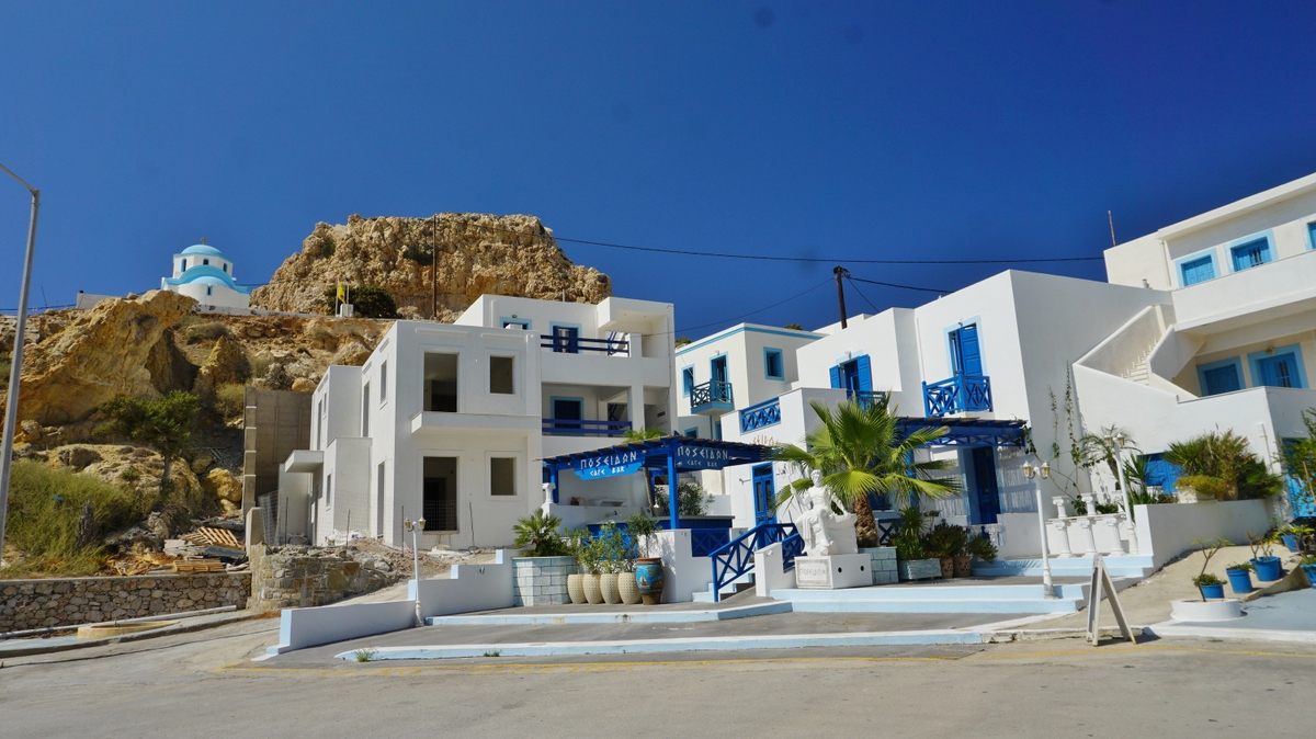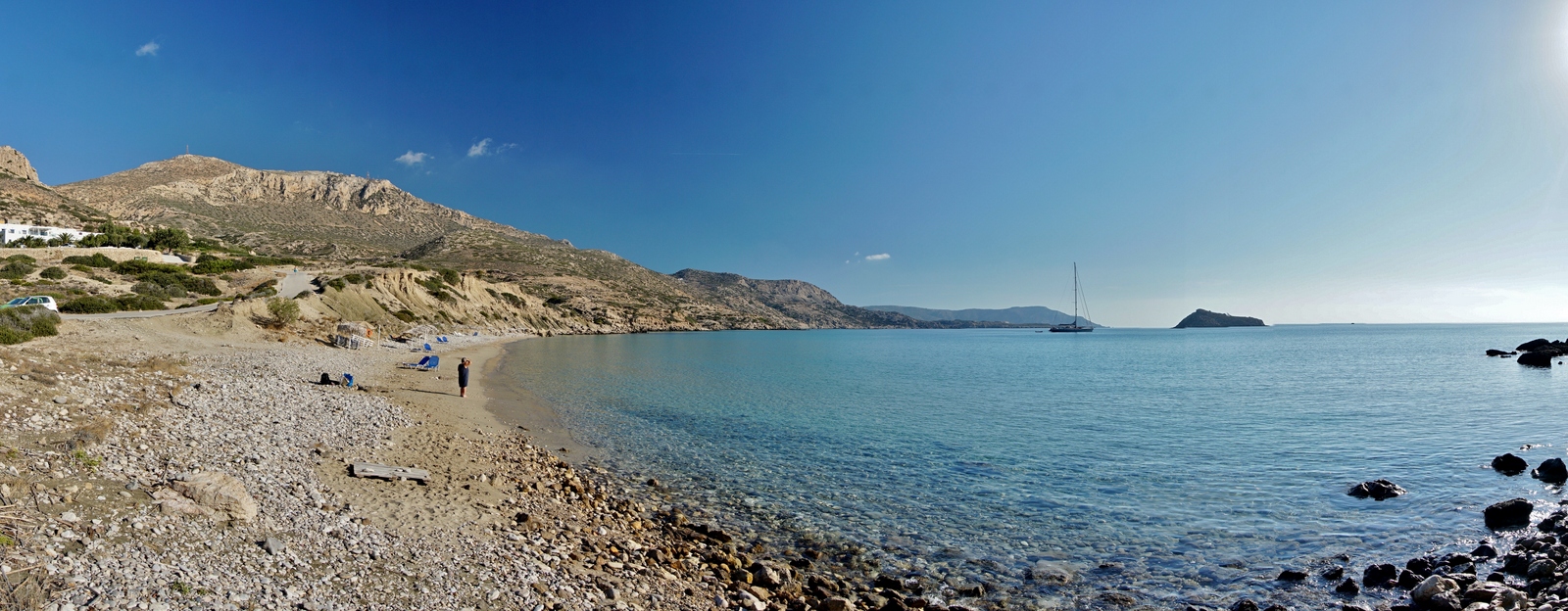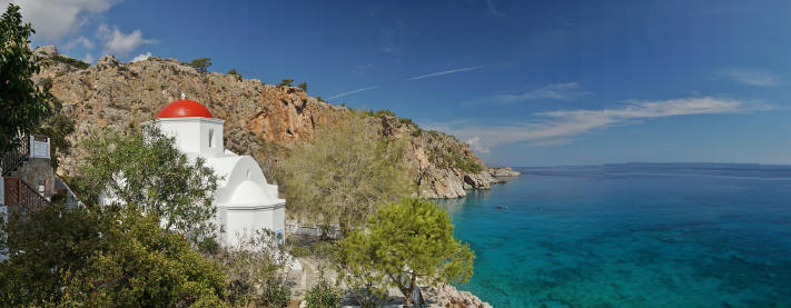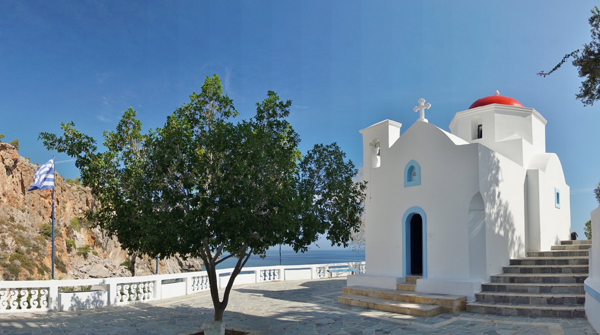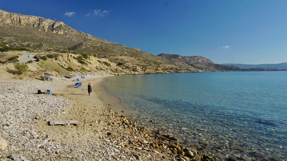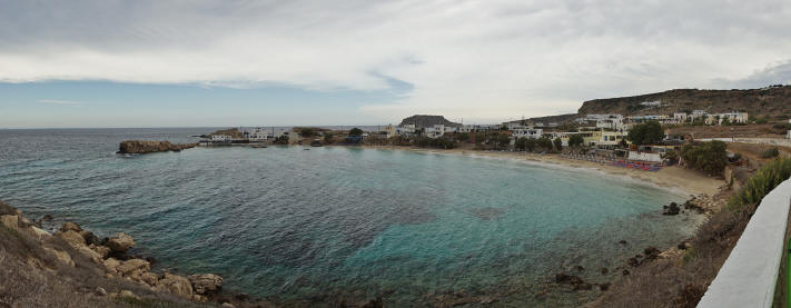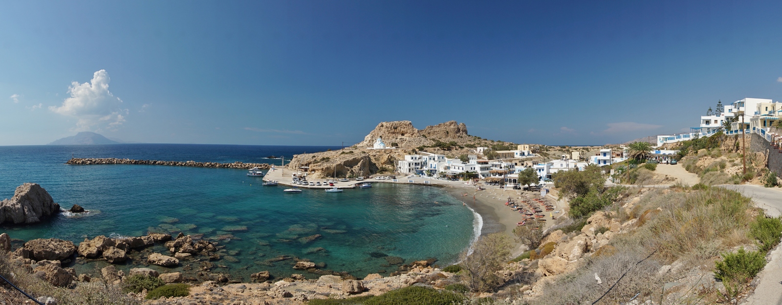 | Natürlich beginnt der Tag mit dem von uns so geliebten Frühstück auf der Panoramaterrasse. Die Morgensonne taucht die Bucht von Amoopi in ein goldgelbes Licht und eine solche Kulisse ist einfach nur wunderbar. Dann brechen wir auf und fahren mit dem Mietwagen via Pigadia, Aperi, Volada, Othos und Pyles hinüber zur Westküste. Als wir von den Bergdörfern kommend wieder zur Küste hinunterfahren, sehen wir am Horizont die kleinere Nachbarinsel Kasos deutlich und klar vor uns liegen. Bevor wir Lefkos passieren, machen wir nochmals einen Abstecher und einen unberührten Strand bei Adia, welchen wir am Freitag bei Regen schon einmal kurz besuchtet hatten. Heute schaut bei Sonnenschein die Szenerie ungleich schöner aus und wir bummeln kurz am Strand entlang. Nach kurzer Weiterfahrt erreichen wir dann das Bergdorf Mesochori, wo wir einen längeren Stopp einlegen. Das Auto muss man oberhalb des Dorfes parken, da im Ort ausschließlich enge Treppenwege zu finden sind, wo man nur per Pedes vorankommt. Im Gewirr der engen Gassen kann man sich kaum orientieren, doch dann stehen wir vor einem Aussichtspunkt, von dem man einen tollen Blick auf die wilde Westküste von Karpathos hat. Nun sehen wir von hier auch die markante Kirche, welche wir als nächstes ansteuern. Die Kirche besteht neben dem Hauptgebäude noch aus einem typischen Glockenturm und als Besonderheit befindet sich unterhalb des Kirchengebäudes noch ein Brunnenhaus mit drei sprudelnden Quellen. Entlang der verwinkelten Gassen laufen wir zum Auto zurück und fahren weiter am Fuße des Kali Limni, des mit 1.215m höchsten Berg der Insel Karpathos. Damit hat er exakt die gleiche Höhe wie der Fichtelberg im heimatlichen Erzgebirge, doch mit Sicherheit liegt hier deutlich weniger Schnee ;-). Wir passieren Spoa und fahren eine enge aber gut ausgebaute Serpentinenstraße hinunter zur Ostküste nach Agios Nikolaos. Dieser kleine Weiler mit dem Minihafen strahlt eine wunderbare Ruhe aus und wir lassen uns von der relaxten Stimmung treiben. Nachdem wir auch hier eine Runde gedreht haben, fahren wir wieder hinauf nach Spoa und biegen in Richtung Olympos nach Norden ab. Nach ca. 12 Kilometern biegt eine Schotterpiste hinunter zum Agios Minas Beach mit der gleichnamigen kleinen Kapelle ab. Nach einem knappen Kilometer müssen wir das Abenteuer leider abbrechen, da unser normaler Pkw leider für das Gelände nicht geeignet ist. Nachdem wir mühevoll auf der engen Piste gewendet hatten, bleiben wir auf einem besonders steilen Teilstück hängen und nur durch Schieben und besonders gefühlvoller Kupplungsarbeit gelingt es uns, diese Stelle zu überwinden und wieder zur Hauptstraße nach oben zu gelangen. So entschließen wir uns, nochmals zum Apella-Strand zu fahren. Dort verbringen wir dann den Nachmittag am dortigen Strand mit Schnorcheln und Sonnenbaden. Dann geht es zurück nach Amoopi, doch bevor wir zum Abendessen fahren, nutzen wir die Abendstimmung zu einem Abstecher zum Kastelia Beach, wo wir noch eine Runde schnorcheln. Dann fahren wir nur wenige Meter weiter, um im "Four Seasons" zu Abend zu essen. Dann erreichen wir unser Quartier, wo wir den Tag auf der Terrasse ausklingen lassen. | |