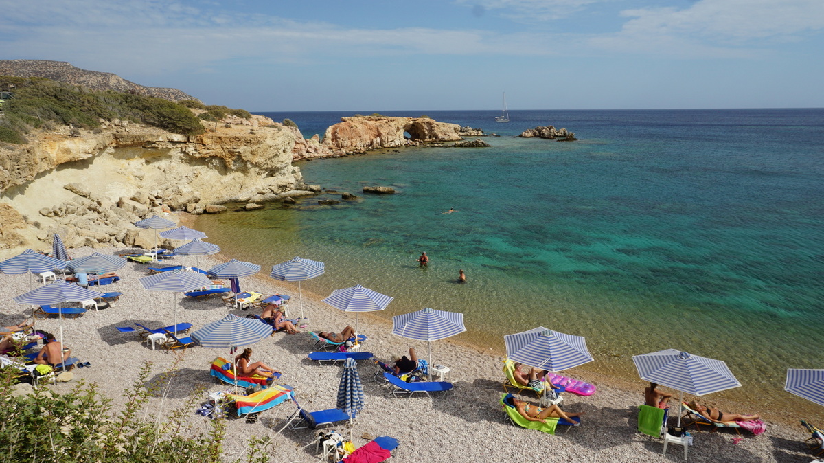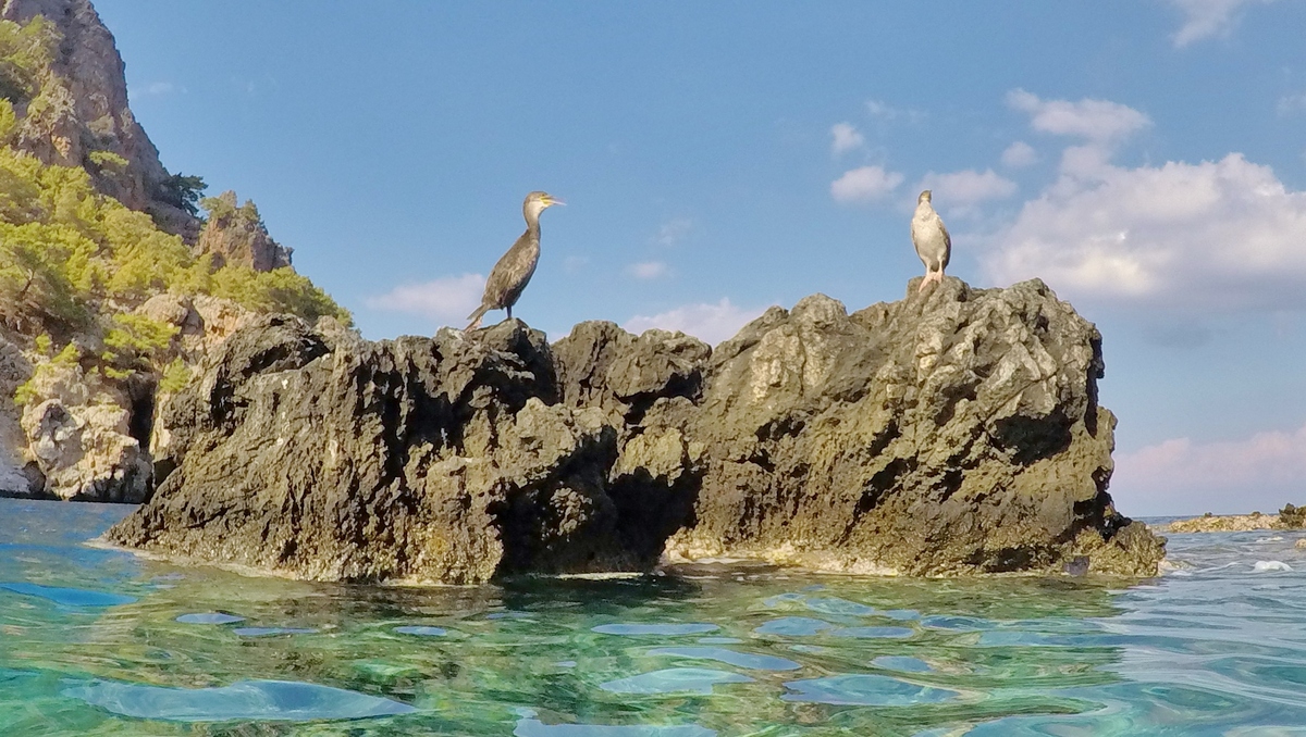 | Nach dem Terrassenfrühstück fahren wir in Richtung Süden und umrunden den Flughafen von Karpathos. Auf staubiger aber gut befahrbarer Piste, fahren wir parallel zur Startbahn des Flughafens ca. 5 Kilometer bis zum Diakoftis Beach. Hier machen wir einen ersten Zwischenstopp und springen ins glockenklare Wasser. Im Hinterland des Strandes befinden sich noch viele Dünen, durch diese wir wieder in Richtung unseres Parkplatzes zurück gehen. Nachdem wir an der Piste am Flughafen zurück gefahren sind, biegen wir in die Asphaltstraße in Richtung Arkasa ein und fahren weiter bis Agios Theodoros. Hier waren wir am letzten Freitag bereits, doch da konnten wir aufgrund des heftigen Regens nicht aussteigen. Heute ist das ganz anders und wir gehen hinunter zum Strand. Als wir unten angekommen sind, sehen wir, dass der Strand nicht allzu sehr zum Baden einlädt und es hier viel Seegras gibt. So machen wir hier nur einen kurzen Zwischenstopp und fahren zurück in Richtung Arkasa. Bevor wir den Ort passieren, machen wir noch einen kurzen Abstecher zum kleinen und rustikalen Strand von Thihiasmenaki. Hier sind wir ganz allein und so springen wir mal kurz ins Wasser, um uns zu erfrischen. Weiter führt uns unsere Fahrt nach Finiki. Auch hier waren wir am letzten Freitag bereits aber da uns die Szenerie absolut begeistert hat, wollten wir den Fischerort nochmal bei sonnigem Wetter erleben. So biegen wir die enge Stichstraße hinunter zu Hafen ab und parken das Auto direkt am kleinen Fischerhafen. Wir bummeln kurz an der kleinen Hafenmole und machen dann im Restaurant "Delphini" einen kurzen Stopp bei frisch gepressten Orangensaft und einem unverzichtbaren Tzatzíki. Nach der kleinen Pause fahren wir dann entlang der Ortstraße und biegen kurz nach den letzten Häusern in eine Erdpiste zu unserer nächsten Station ab. Wir parken den Mietwagen oberhalb der Bucht ab und klettern zum kleinen Sandstrand hinunter. Auch hier müssen wir uns mit niemand den Strand teilen und springen schnell mal ins Wasser. Da wir aber auch nochmal die sehr guten Schnorchelmöglichkeiten nutzen wollen und diese an der Ostküste deutlich besser sind, fahren wir via Pyles nach Apéri und von hier weiter hinunter zum Achata Beach. Hier bleiben wir bei idealem Badewetter den Rest des Nachmittages. Auch wenn es nicht die Unterwasserwelt der Malediven ist, so erleben wir hier ein klares Wasser, welches wir bisher kaum woanders gesehen haben. So sehen wir auch hier Papageienfische, Sepias und viel andere Spezies. Auf einem Felsen am Ende der Bucht können wir Komorane aus nächster Nähe bestaunen. Zum späten Nachmittag fahren wir dann in die Inselhauptstadt Pigadia. Nach einem Bummel entlang der "Flaniermeile" essen wir im Restaurant "Maxim" direkt an der Uferpromenade lecker zu Abend. Zurück im Quartier lassen wir den Tag bei fast windstillem Wetter ausklingen. | |