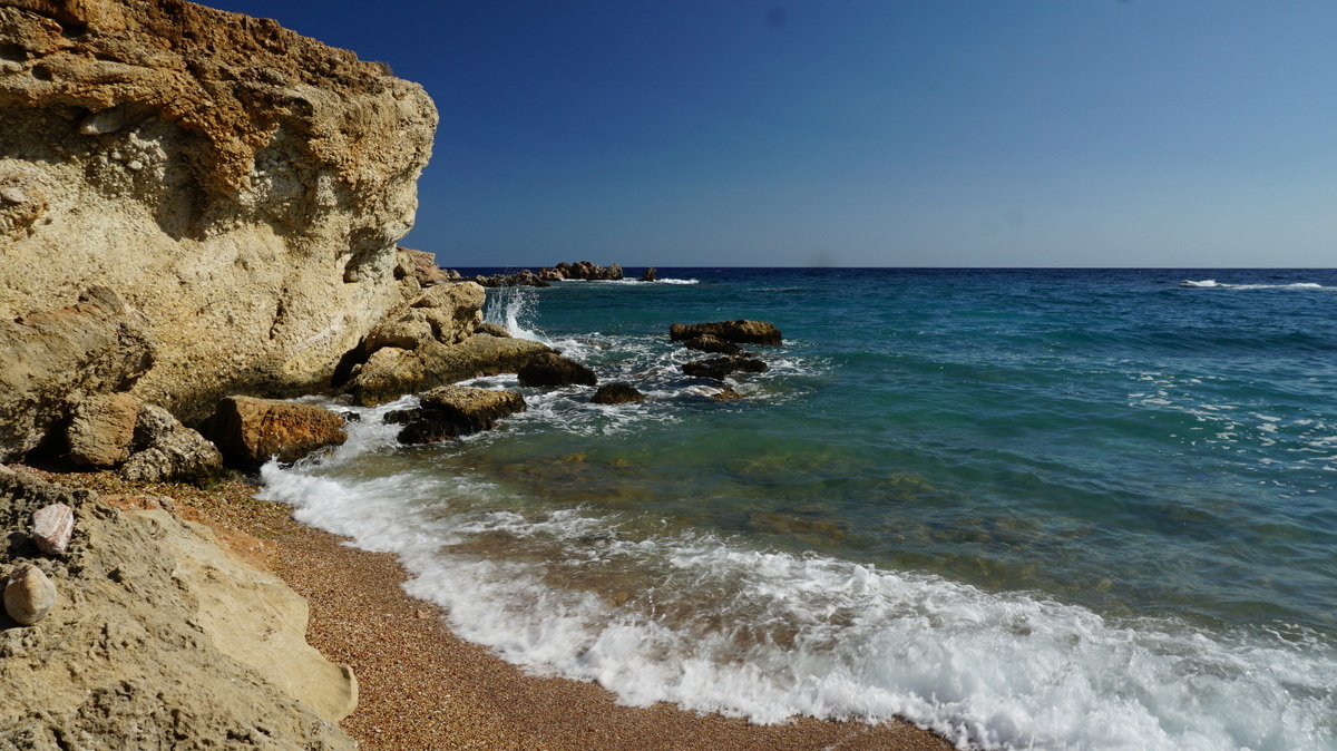 | Am Morgen strahlt die Sonne von einem wolkenlosen Himmel und so fällt das Frühstück an unserem letzten ganzen Tag besonders intensiv aus. Maria, unsere Vermieterin, hat uns noch einen Tipp zum schnorcheln gegeben und so fahren wir als erstes Etappenziel für heute in Richtung Süden zum Damatria Beach. Dieser ist durch eine kurze asphaltierte Straße, welche von der Inselhauptstraße abbiegt, gut erreichbar. Am südlichen Ende der Bucht schnorcheln wir und erkunden die Unterwasserwelt. Auch hier ist, trotz des Sandstrandes, ein kristallklares Wasser zu finden und die Felsen unter Wasser haben genau die optimale Größe, dass man alles unter Wasser entdecken kann. Dann machen wir noch einen kurzen Abstecher zum Nachbarstrand Christou Pigadi. Auch hier finden wir eine tolle Szenerie und auch die Strandtaverne, welche gerade öffnet, schaut sehr idyllisch aus. Wir aber fahren weiter via Pigadia nach Norden, um nochmals zu einer der Hauptsehenswürdigkeiten von Karpathos - der Kyra Panagia - zu fahren. Am Samstag waren wir schon einmal hier vor Ort aber da hat sich die Sonne noch etwas versteckt, so dass wir uns nochmals zur Fahrt hierher entschlossen haben. Heute dagegen strahlt die Sonnen und wir können die kleine schneeweiße Kapelle oberhalb des Strandes bei besten Bedingungen erleben und natürlich fotografieren. Trotz der pittoresken Kirche und der imposanten Felsen am Strand zieht es uns eher in einsamere Gefilde, so dass wir weiter zum Achata Strand fahren. Dieser tolle Strand ist einer unserer Favoriten hier auf der Insel und auch heute genießen wir einfach die tolle Umgebung über und unter Wasser. Als sich im Nachmittag genau über der Bucht eine Wolke hartnäckig vor die Sonnen schiebt, brechen wir auf und fahren wieder zurück zu unserem ersten Strand am Morgen, dem Damatria-Beach. Zwischendurch waren wir noch Tanken und haben erleben müssen, dass der Benzinpreis nochmals gestiegen ist und aktuell sportliche 1,95€ beträgt. Dabei ist es noch nicht allzu lange her, dass der Benzin in Griechenland deutlich unter dem Preisniveau in Deutschland gelegen hat. Auch hier machen sich, genau wie im Supermarkt, die Preiserhöhungen infolge der Finanzkrise mehr als deutlich bemerkbar. Zurück am Damatria Beach haben wir Glück und erleben hier den Rest des Nachmittags bei tollem Sonnenschein. Morgen werden wir dann ca. 20°C weniger haben und wir wollen uns einfach noch nicht daran gewöhnen. Bevor es uns dann auch heute ins "Four Seasons" zum Abendessen zieht, biegen wir zuvor noch in eine Stichstraße ein, welche uns hinunter zum Fokia Beach bringt. Zum Saisonende gibt es nun auch hier keine Sonnenschirme mehr und wir erleben die Bucht in der goldgelben Abendsonne. Den Tag beenden wir bei milden Temperaturen und in relaxter Atmosphäre auf unserer Terrasse. | |