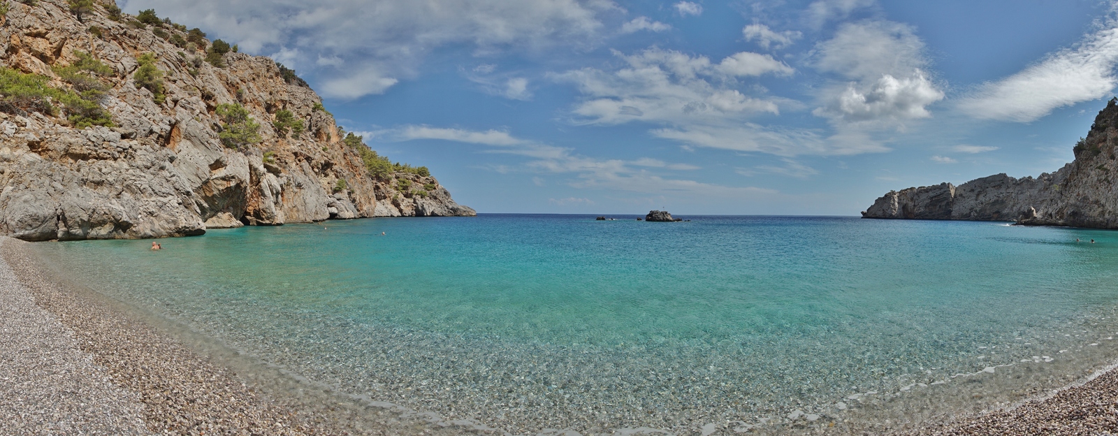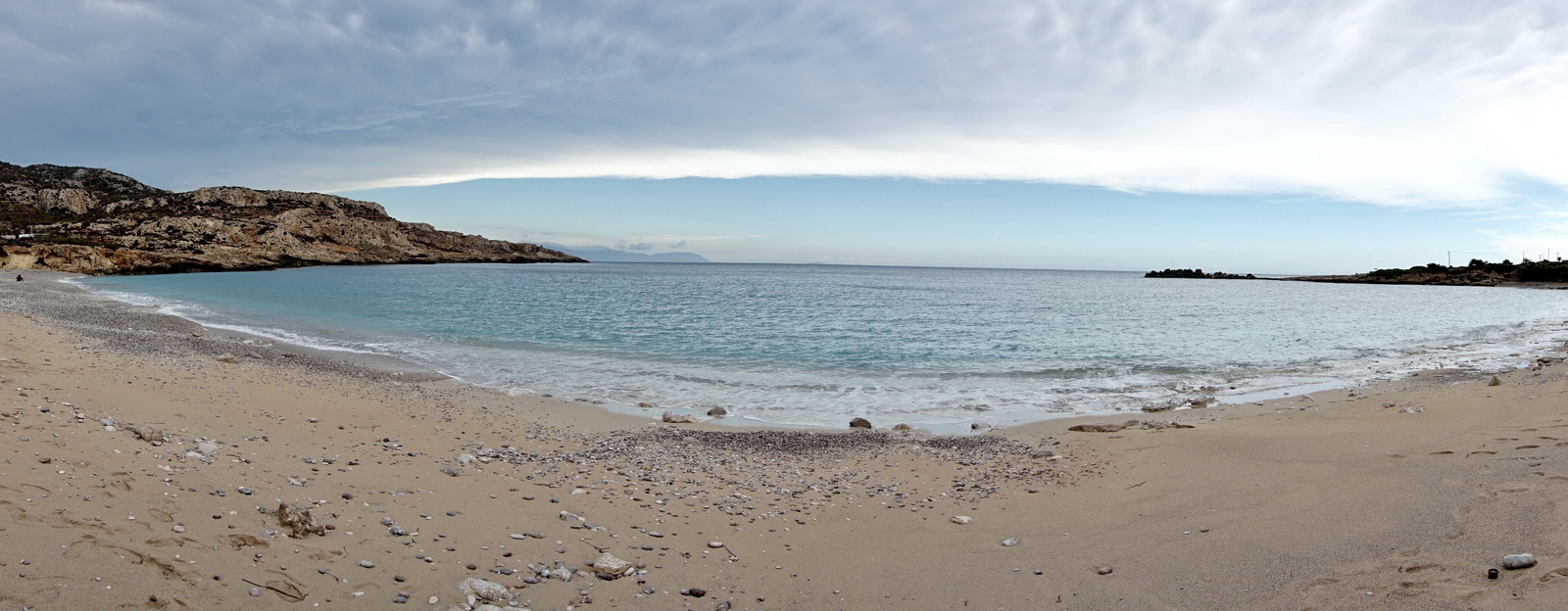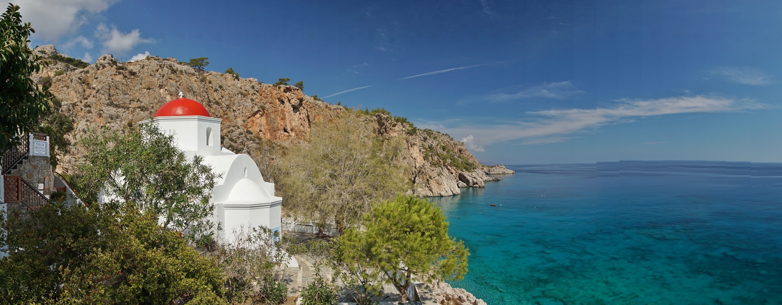 | In der Nacht war das Wetter ziemlich stürmisch, so dass sich selbst die Stühle auf der Terrasse selbständig gemacht haben. Am Morgen lässt der Wind etwas nach, so dass wir auf der Terrasse frühstücken können. Zum Tagesstart fahren wir ein paar Kilometer hinauf in die Berge nach Menetes. Bevor wir den Ort erreichen, machen wir erst einen Stopp am Kriegerdenkmal, welches an die italienische und deutsche Besetzung im 2. Weltkrieg erinnert. Der Stopp lohnt vor allem wegen der exzellenten Aussicht, welche wir von hier auf Menetes und auch hinunter nach Amoopi und Pigadia haben. Dann parken wir mitten im Ort und bummeln durch die Gassen. Da heute Sonntag ist, findet natürlich in der Ortskirche der Gottesdienst statt. Das ist unüberhörbar, da das Ganze per Lautsprecher im ganzen Ort verbreitet wird. Nach dieser Runde fahren wir hinunter und erreichen nach kurzer Fahrt die Hauptstadt von Karpathos - Pigadia. Die liegt zum Sonntagmorgen noch sehr verschlafen da und so können wir in aller Ruhe durch die Gassen schlendern. Nur einige von den vielen Tavernen, welche den Uferbereich säumen, haben bereits geöffnet. Nach einer ausgedehnten Runde durch die Hauptstadt fahren wir dann wider in Richtung Norden und biegen hinter Apéri zum Achata-Strand ab. Die Serpentinenstraße führt in vielen Kurven zu Füßen von großen Felswänden an die Küste hinunter. Kurz bevor wir den Strand erreichen, machen wir noch einen Fotostopp an einer kleinen Kapelle. Am Strand angekommen ist es zuerst noch recht einsam und nur wenige Leute sind hier vor Ort. Wir springen ins türkisblaue Wasser und nutzen auch heute die Gelegenheit zum schnorcheln. Zwischen den Felsen im Wasser entdecken wir u.a. zwei Sepia. Dann erreicht eine italienische Wandergruppe von ca. 50 Personen den Strand und die Ruhe war erst einmal vorbei. Trotzdem genießen wir das sonnige Wetter und verbringen ein paar Stunden hier am Achata-Beach. Dann brechen wir auf und fahren zuerst zurück nach Pigadia, wo wir schnell noch ein paar Einkäufe erledigen. Nach einem kurzen Stopp im Quartier, fahren wir dann gleich weiter zum Rand von Amoopi, wo wir entlang einer Schotterpiste am Meer entlang fahren. Nachdem wir das Auto später einfach stehen lassen, gehen wir noch ca. 500 Meter und stehen plötzlich vor dem Pouliou to Potami-Beach. Diesen Ministrand haben wir ganz für uns allein und können auch hier wunderbar schnorcheln. Als die Sonne langsam anfängt sich goldgelb zu färben, brechen wir auf und fahren hinüber nach Lakki ins "Four Seasons", um hier lecker zu Abend zu essen. | |