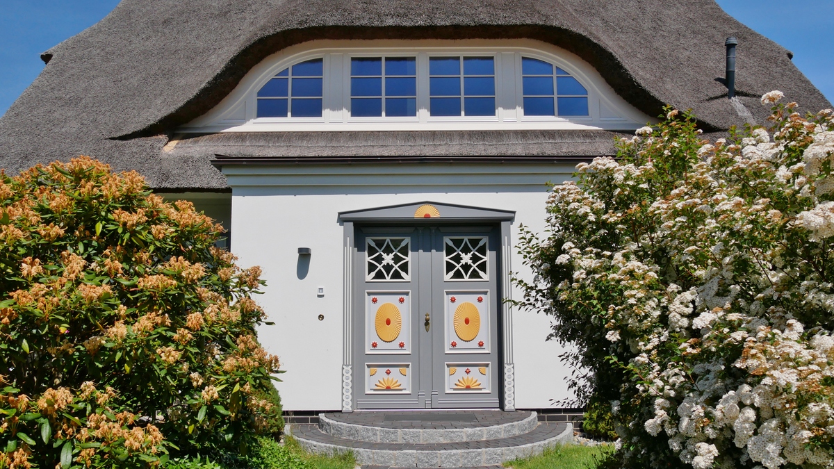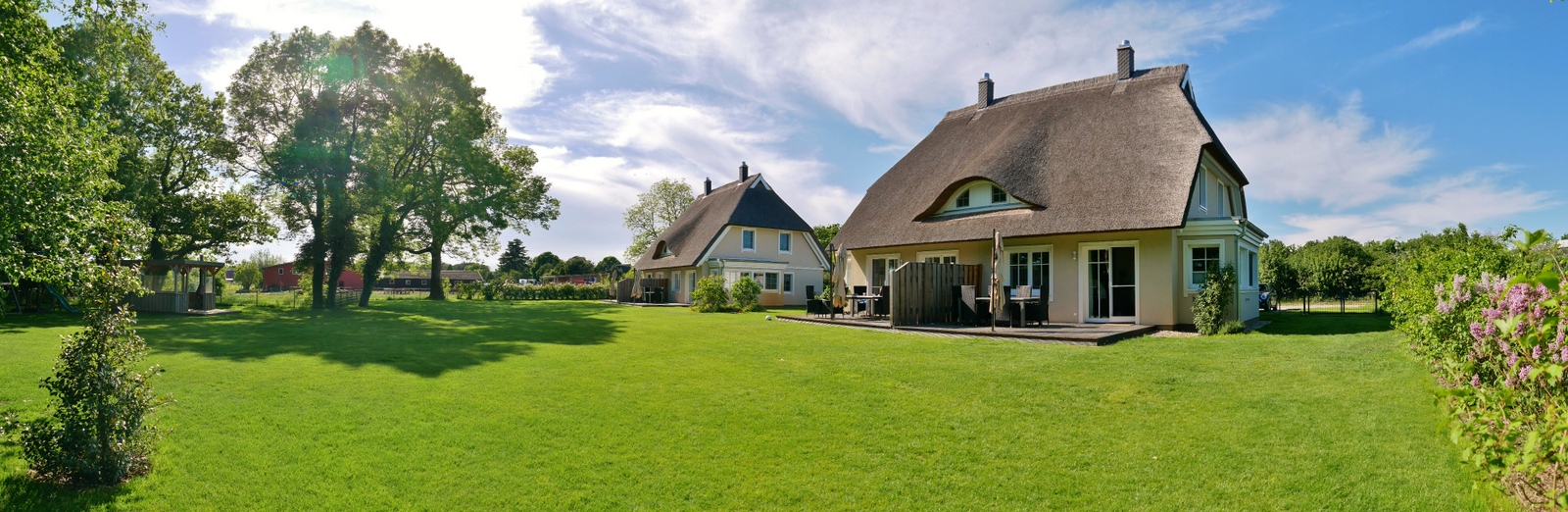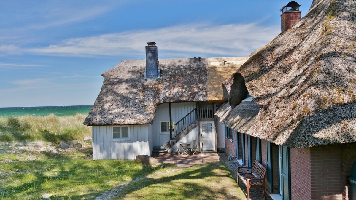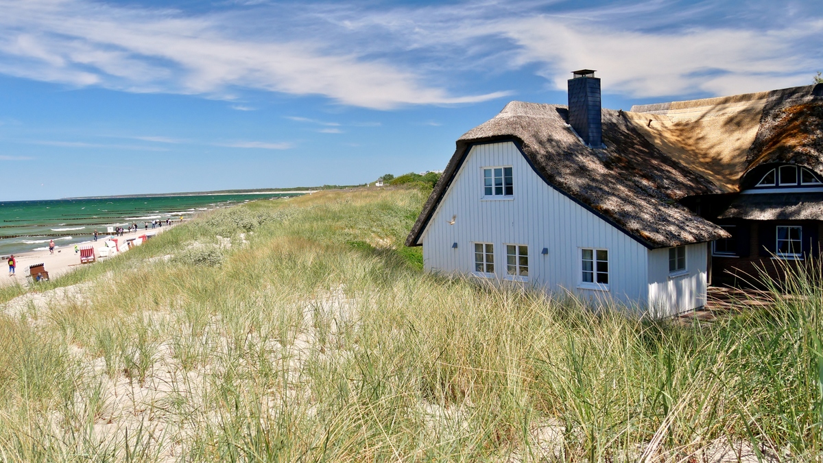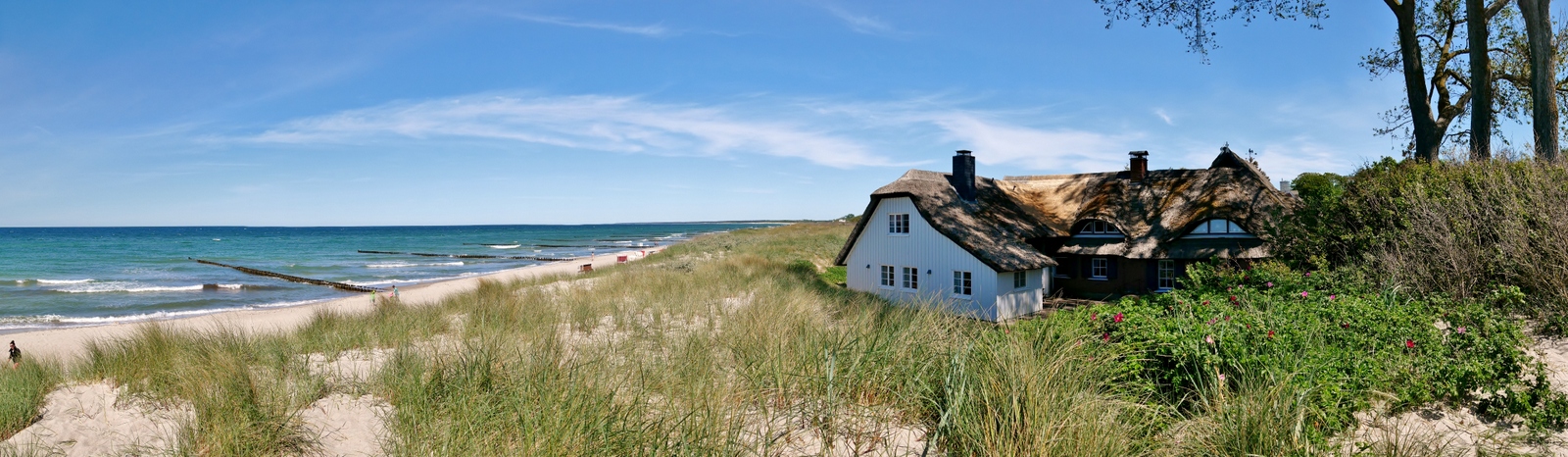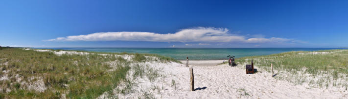 | Leider wird heute nichts aus dem Frühstück auf der Terrasse. Obwohl die Sonne sich von ihrer besten Seite zeigt, pustet schon am Morgen der Wind sehr frisch, so dass wir nach innen ausweichen müssen. Dann fahren wir nur ein paar Minuten bis zum Parkplatz Drei Eichen, wo wir zu unserer Tour an den Weststrand aufbrechen. Nach ca. 2 Kilometern durch den Küstenwald überqueren wir die Düne. Wie schon zu erwarten war, ist es unmittelbar an der Küste wieder sehr windig, so dass wir nur ein paar hundert Meter entlang am Strand laufen und dann unseren Windschutz installieren. Der schafft etwas Windschatten und wir verbringen den Vormittag hier an dieser Stelle. Da der Wind aber nicht nachlassen will und wir inzwischen gut mit Sand "paniert" sind, brechen wir wieder auf und fahren hinüber nach Ahrenshoop, wo wir durch den Ort bummeln. Hier ist es recht voll und viele Gäste sind hier zugange. Am Grenzweg gehen wir zur sog. "Grimmelei", wo wir das bekannteste Fotomotiv des Ortes - das Haus in den Dünen - finden. Nachdem wir noch etwas frischen Räucherfisch erstanden haben, machen wir uns dann auf den Rückweg nach Born. | |