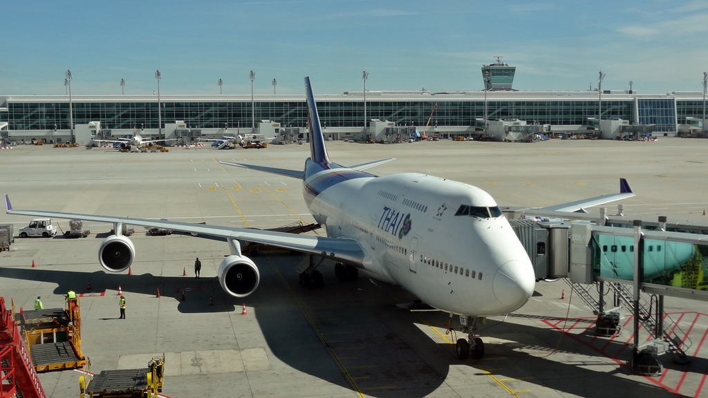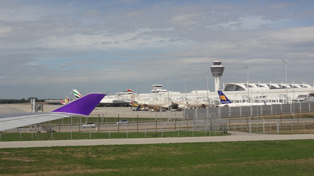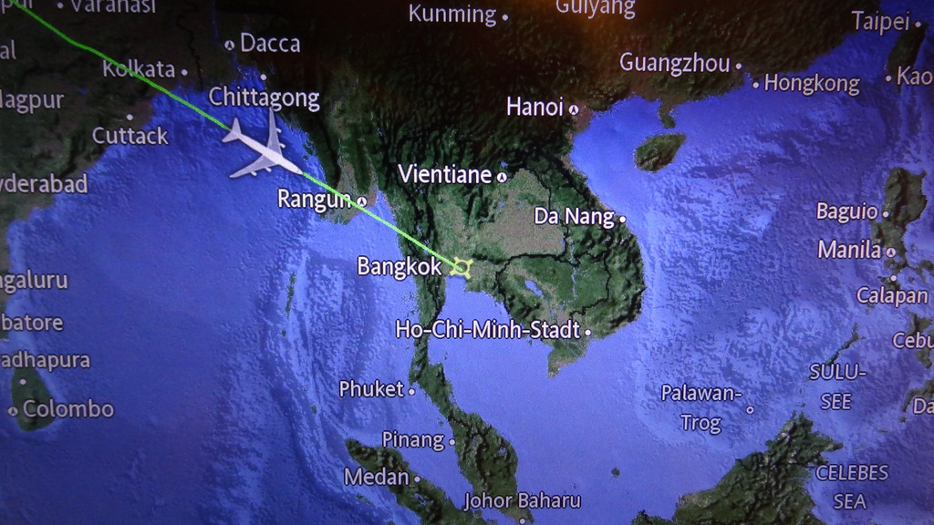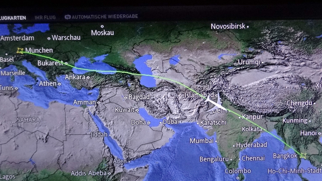 | Gegen 08:00 Uhr starten wir von zu Hause und machen uns auf dem Weg zum Flughafen in München. Hier treffen wir nach staufreier Fahrt überpünktlich ein. Nachdem wir das Auto auf dem Urlauberparkplatz P41 geparkt haben, bringt uns der Bus direkt zum Terminal 2. Von hier aus startet unsere Boeing 747 planmäßig um 14:35 Uhr auf die lange Reise nach Asien. Glücklicherweise ist der Flieger nicht einmal halb ausgebucht, so dass wir es uns nach dem Service auf je einer Sitzreihe bequem machen. | |