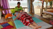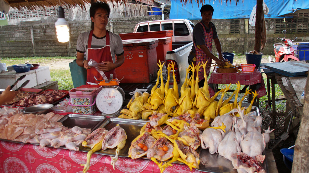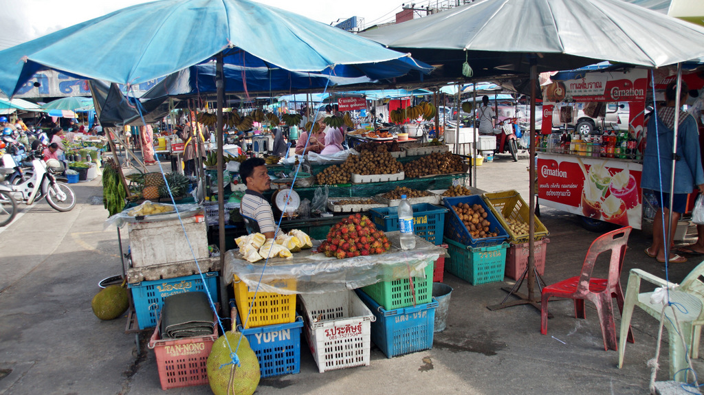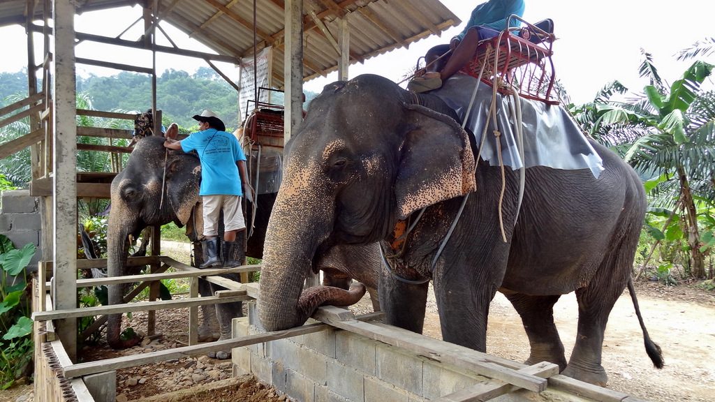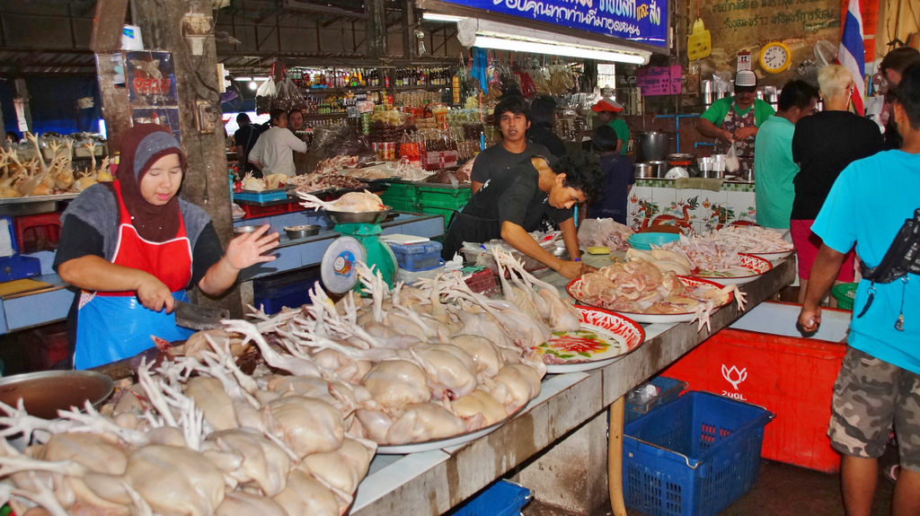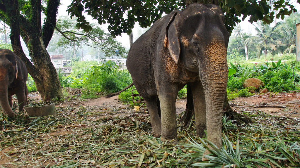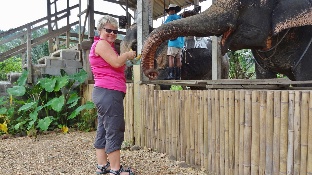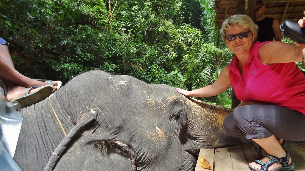 | Bereits gestern haben wir mit Sak, unserem Guide, eine Tour vereinbart. Bevor wir starten zelebrieren wir natürlich unser leckeres Frühstück. Pünktlich um 09:30 Uhr wartet Sak bereits vor dem Ramada Resort und wir fahren entlang dem Highway Nr. 4 auf der Pritsche seines Pickup in Richtung Phuket. Gegenüber des Merlin Resorts machen wir den ersten kurzen Stopp auf einer kleinen Elefantenfarm. Hier stehen die "sanften Riesen" inmitten von Ananasblättern, welche sie genüsslich verspeisen. Beeindruckend ist die raue Stoppelhaut der Tiere. Sie lassen sich in aller Ruhe streicheln und es ist schon ein tolles Gefühl, unmittelbar bei den Elefanten zu stehen. Dann geht es weiter in Richtung Süden zur Schildkrötenfarm. Diese liegt in einem Gebiet welches der thailändischen Navy gehört. An der Turtlefarm angekommen sehen wir in den Becken viele kleine und mittelgroße Exemplare der Meeresschildkröten. Die kleinen Schildkröten stammen von den nahe gelegenen Similan-Inseln und werden dort später auch wieder ausgewildert. Dann geht es zurück zum Highway und kurze Zeit später erreichen wir dann den Lam Kaen-Tempel. Dieser Tempel ist nach dem Tsunami erbaut worden und ist im Innenraum neben buddhistischen Inhalten auch mit derartigen Motiven ausgestaltet. Dann fahren wir weiter und nach 20 Minuten Fahrt biegen wir eine kleine Stichstraße zum Nationalpark ab. Hier erreichen wir den Lampi-Waterfall mit seiner beeindruckenden Kaskade. Da es ja in den letzten Tagen ausgiebig geregnet hat führt der Wasserfall auch reichlich Wasser. So nutzen wir die Gelegenheit für ein erfrischendes Bad im unteren "Pool" des Wasserfalles. Bevor wir weiterfahren zweigen wir noch über die Swingbridge auf einen kurzen Steig ab, welcher entlang des Wasserfalls hinauf zur oberen Kaskade führt. Von hier fahren wir dann mit unserem Pickup-Taxi wieder zurück in unser Hotel. Den Nachmittag genießen wir auf unserer privaten Terrasse bei angenehmen Sonnenschein. Dabei werden für uns die extremen Unterschiede hier in Thailand spürbar. In unserem Hotel tauchen wir in eine luxuriöse Umgebung ein, während wir auf unserer heutigen Tour viele eher einfache Behausungen gesehen haben. Im Nachmittag besuchen wir noch den Bang Niang Market. Dieser ist inzwischen nicht mehr nur für die Einheimischen sondern auch für Touristen eingerichtet, was man auch am dem entsprechenden Angebot erkennt. Neben den Offerten für die Touristen, welche neben diversen Textilien vor allem aus gefakten Markenartikeln bestehen (..."echte" Designertaschen gibt es genau so wie Markensonnenbrillen und elektronische Geräte), gibt es tolle Obst- und Gemüsestände mit allerlei exotischen Dingen zu entdecken. Die Fleisch- und Fischabteilung kann leider nicht mit europäischen Standard mithalten. Es ist schon gewöhnungsbedürftig, wenn Fleisch und Fisch in praller Sonne in der Auslage liegen. Dann schlendern wir zurück in unser Hotel. Nach einer (leider nur kurzzeitig) erfrischenden Dusche erleben wir den Sonnenuntergang am Strand des Ramada-Resort bei einem kühlen Cocktail. Zum Abendessen sind wir natürlich auch heute wieder im Sassi`s, wo wir, wie schon an den letzten beiden Tagen, hervorragende thailändische Küche genießen. | |