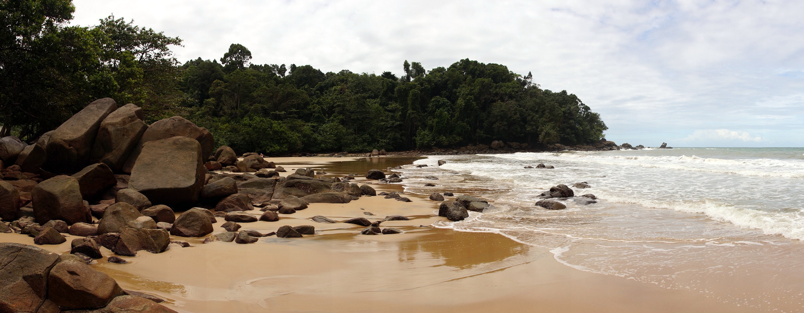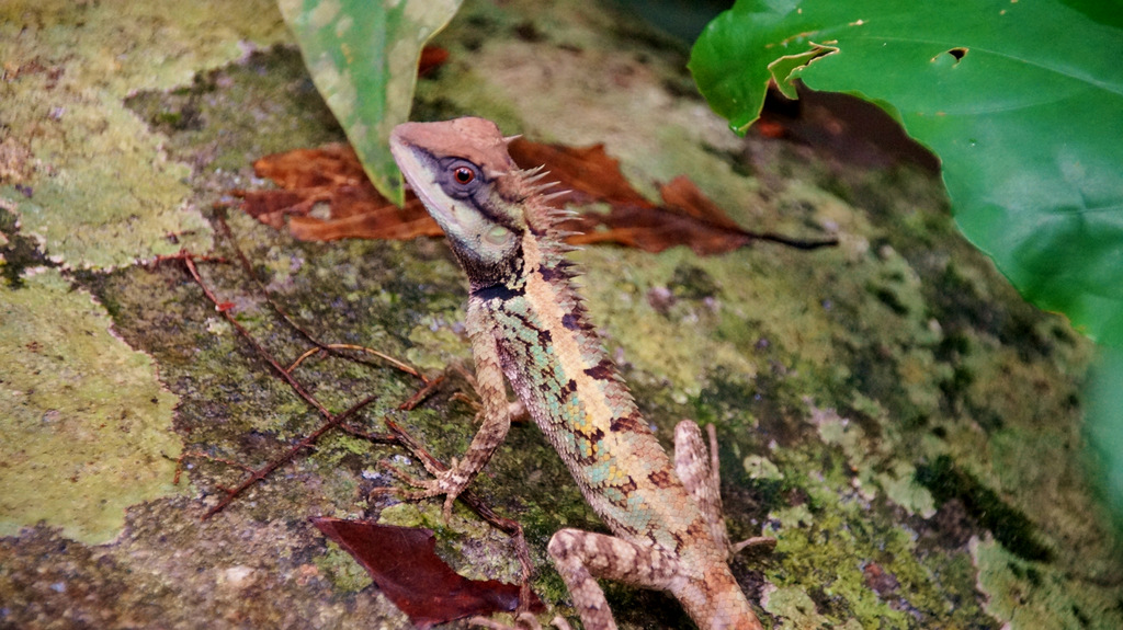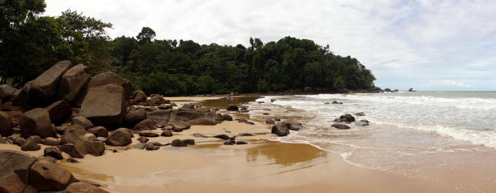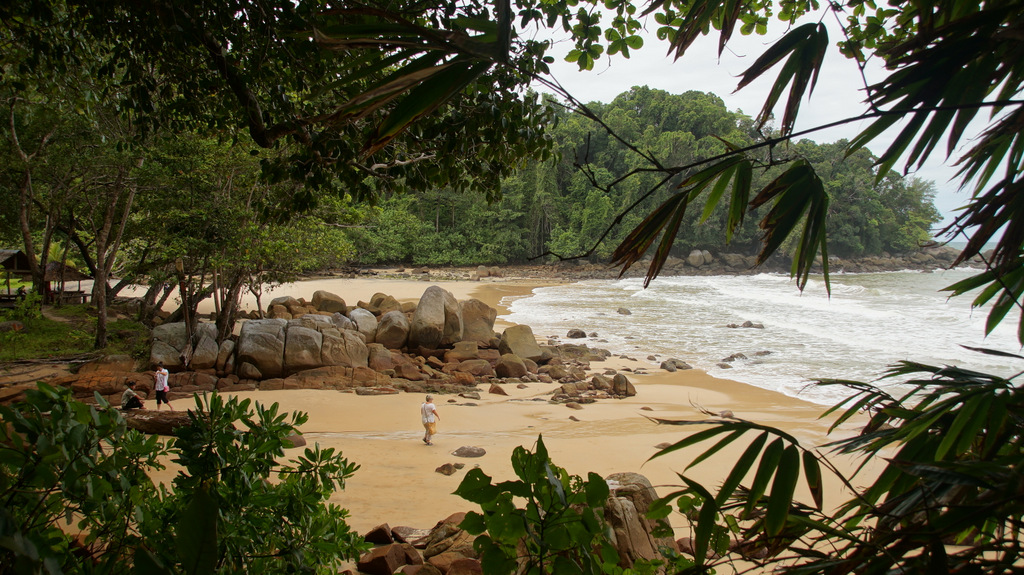 | Eigentlich hatten wir heute einen Ausflug nach Phi-Phi-Island geplant. Da aber der Wetterbericht sehr unbeständiges Wetter vorhergesagt hat, haben wir dieses Projekt abgewählt. Bei Regen, kaum Sonne und stürmischer See macht das einfach keinen Sinn. So brauchen wir heute also keinen Wecker stellen und durchlaufen so unser Morgenritual mit Schwimmen im Pool und einem ausgedehnten Frühstück. Dann starten wir wieder mit dem Tuktuk und lassen uns am südlichen Ende von Khao Lak am Lam Ru National Park absetzen. Hier berappen wir unsere 200 Baht Eintritt p.P. und wandern entlang des Lam Ru Nature Trail. Dabei handelt es sich nicht um einen klassischen Wanderweg, sondern um einen Naturpfad durch dschungelartiges Gelände, welcher immer wieder die Küste streift um dann anschließend wieder in den Wald aufzusteigen. Am sog. Viewpoint hat man einen schönen Blick auf die Küstenabschnitte von Khao Lak. Auch wenn heute die Sonne sich nur verhalten zeigt, so ist es im Urwald extrem feucht. Immer wieder muss ich das Kameraobjektiv säubern und auch wir selbst fühlen uns wie gerade aus dem Wasser gestiegen. Unterwegs bestaunen wir die Flora und Fauna in diesem Areal. Neben vielen Schmetterlingen, teilweise im Riesenformat mit geschätzten 15 cm Flügelspannweite, treffen wir auch auf einige für uns nicht definierbare Spezies. Auch die Pflanzenwelt ist genial. Neben riesigen Pfahlwurzeln finden wir auch mehrere Pandanus-Exemplare, welche die in unserem heimischen Wohnzimmer um einiges an Größe übertreffen. Nach ca. 1,25 Stunden Gehzeit erreichen wir den Small Sandy Beach. Dieser erweist sich trotz des Namens größer als gedacht und liegt in einer Bucht umrahmt von Steinen. Fast hat man eine Assoziation zu den Seychellen. Hier am Strand treffen wir noch auf eine Waran, welcher sich bei unserem Eintreffen vom Strand flüchtet und hinter die Felsen versteckt. Nach einer kleinen Pause laufen wir zurück zur Petchkasem-Road und weiter zum Eingang des national Parks, wo auch unser Tuktuk bereits auf uns wartet und wieder zurück ins Ramada bringt. Den Nachmittag chillen wir dann an unserem Pool, was mehrmals von kräftigen Regenschauern unterbrochen wird. Da es aber nach wie vor sehr warm ist können wir trotzdem die meiste Zeit des Nachmittags im Freien genießen. Am späten Nachmittag wird es dann aber recht ungemütlich. Der Wind wird ziemlich heftig, so dass das Meer direkt vor unserer Tür sehr aufgewühlt ist. Die Szenerie wird untermalt von starken Regen, welcher bis gegen 20:00 Uhr anhält. So geht es mit dem Schirm ins Sassi-Restaurant, wo wir heute leider das letzte Mal die äußerst leckere thailändische Küche genießen können. | |